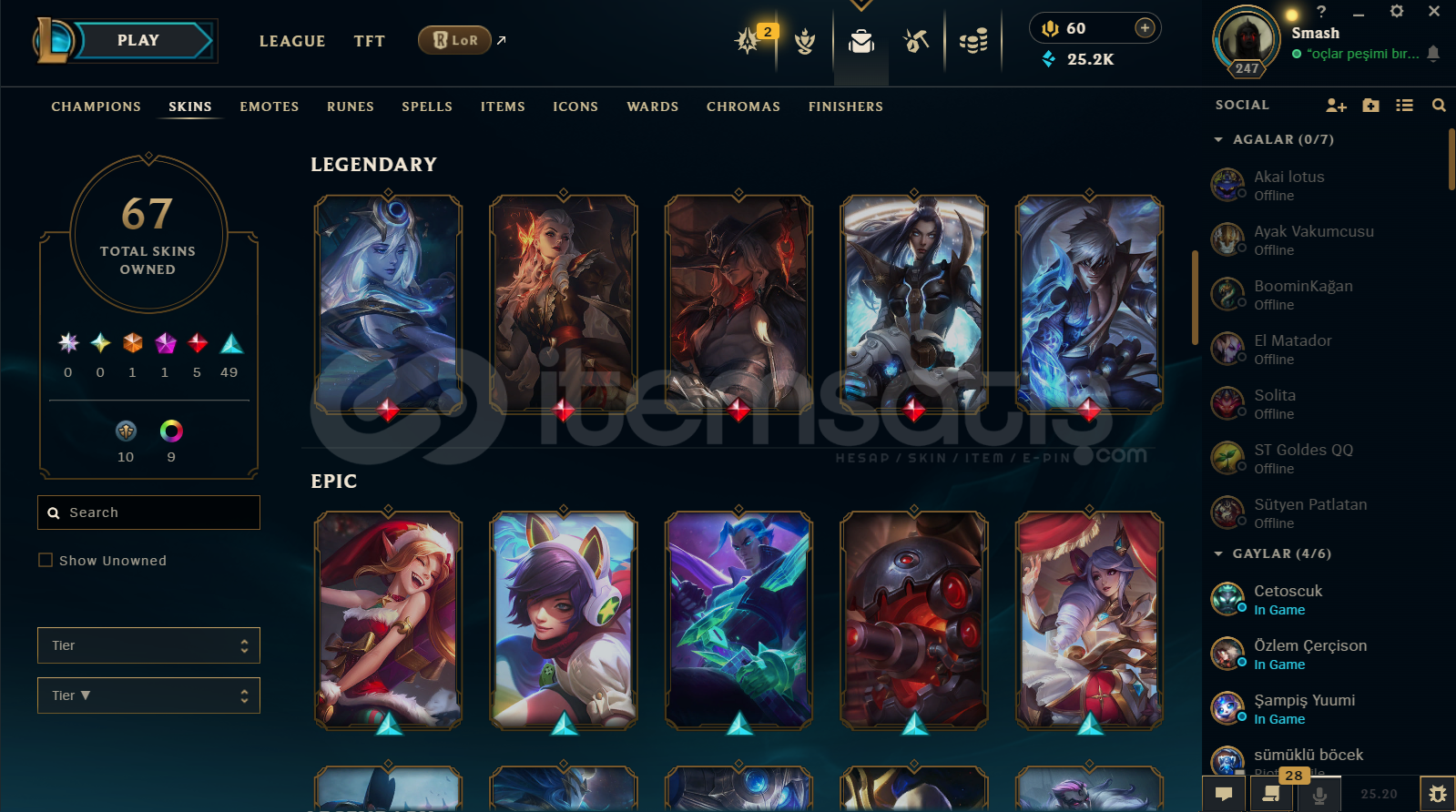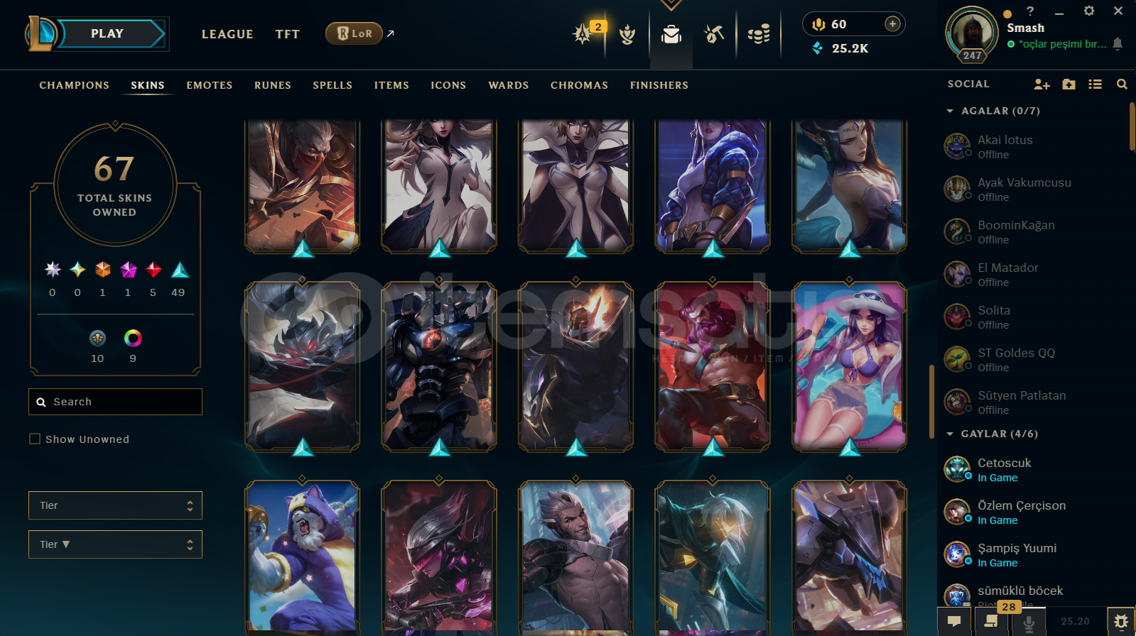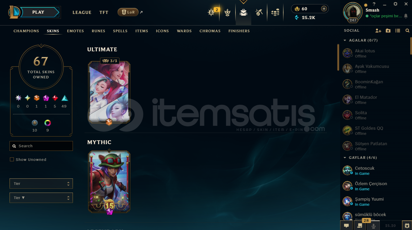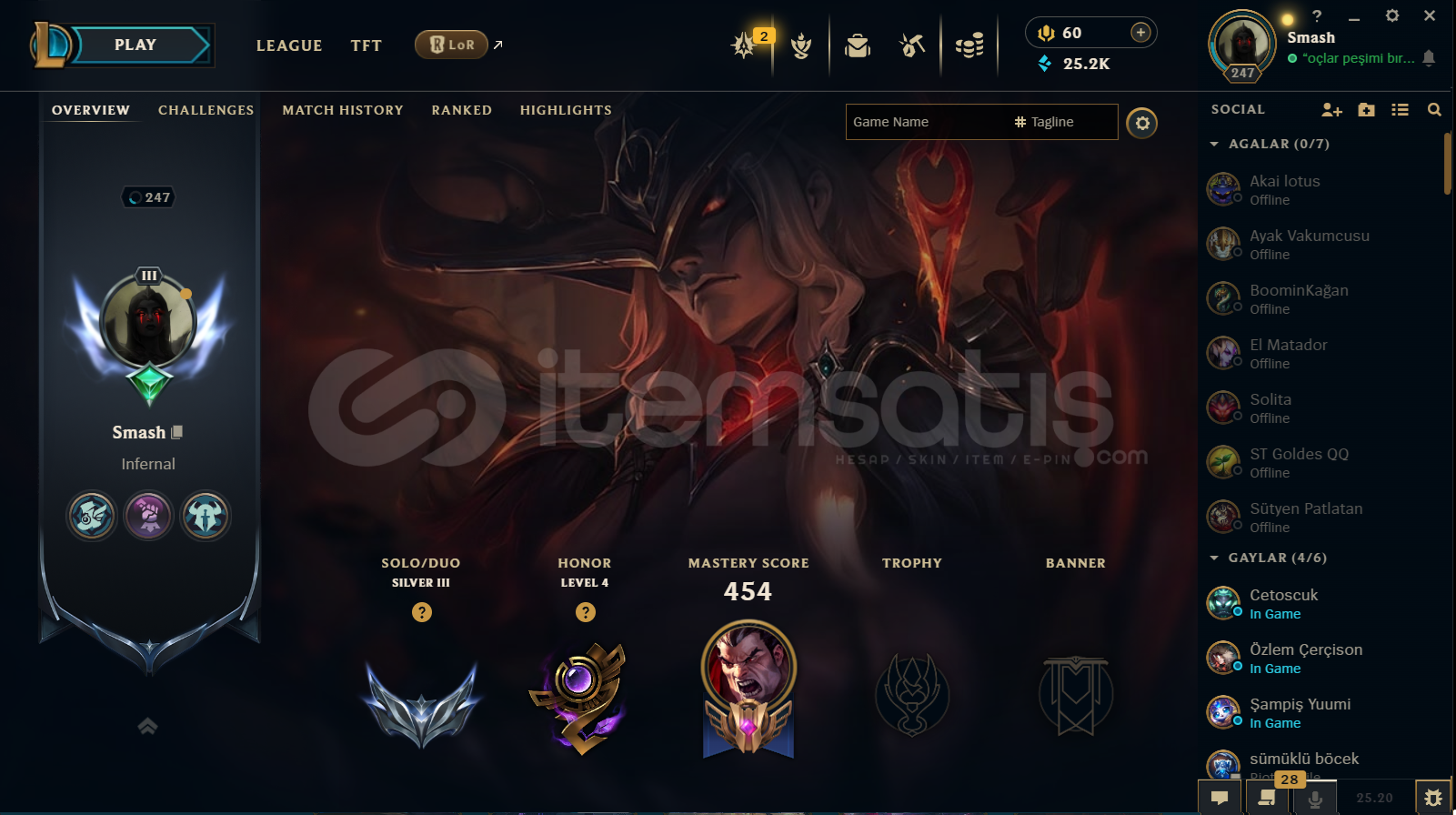 Hesap 247 lvl 67 adet kostüm var takdir seviyesi 4 rankı şuan hem soloq da hem esnekte silver ancak mmr yüksek kasmak kolay sadce bir kaç şampiyon açık değil onlara yetecek kadar mavi öz var hesapta maili değişir çok fazla ustalığı olan bir çar yok kostümlerin hemen hemen her adc karakterinde kostüm var yine çok fazla jungle çarında güzel kostümler var daha detaylı bilgi için dm.
