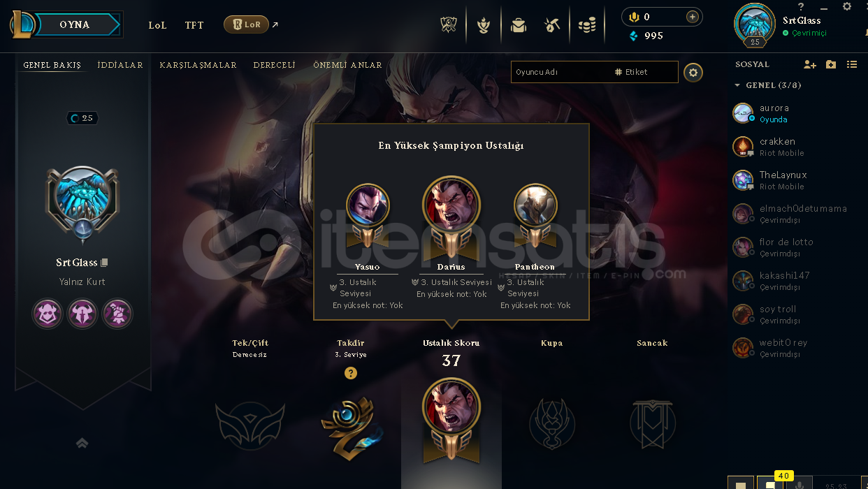 25 LEVEL UNRANKED1 KOSTÜM FIRTINA EJDERİ AURELON SOL VARENVANTERDE 3 KUTU VAR DEGERLENDİRME YAPMAYI UNUTMAYALIM ÖNEMLİ HERHANGİ BİR SORUNDA VEYA GENEL OLARAK BİLGİ VE TECRÜBEMLE SİZLERE YARDIMCI OLURUM HAYIRLI SATIŞLAR