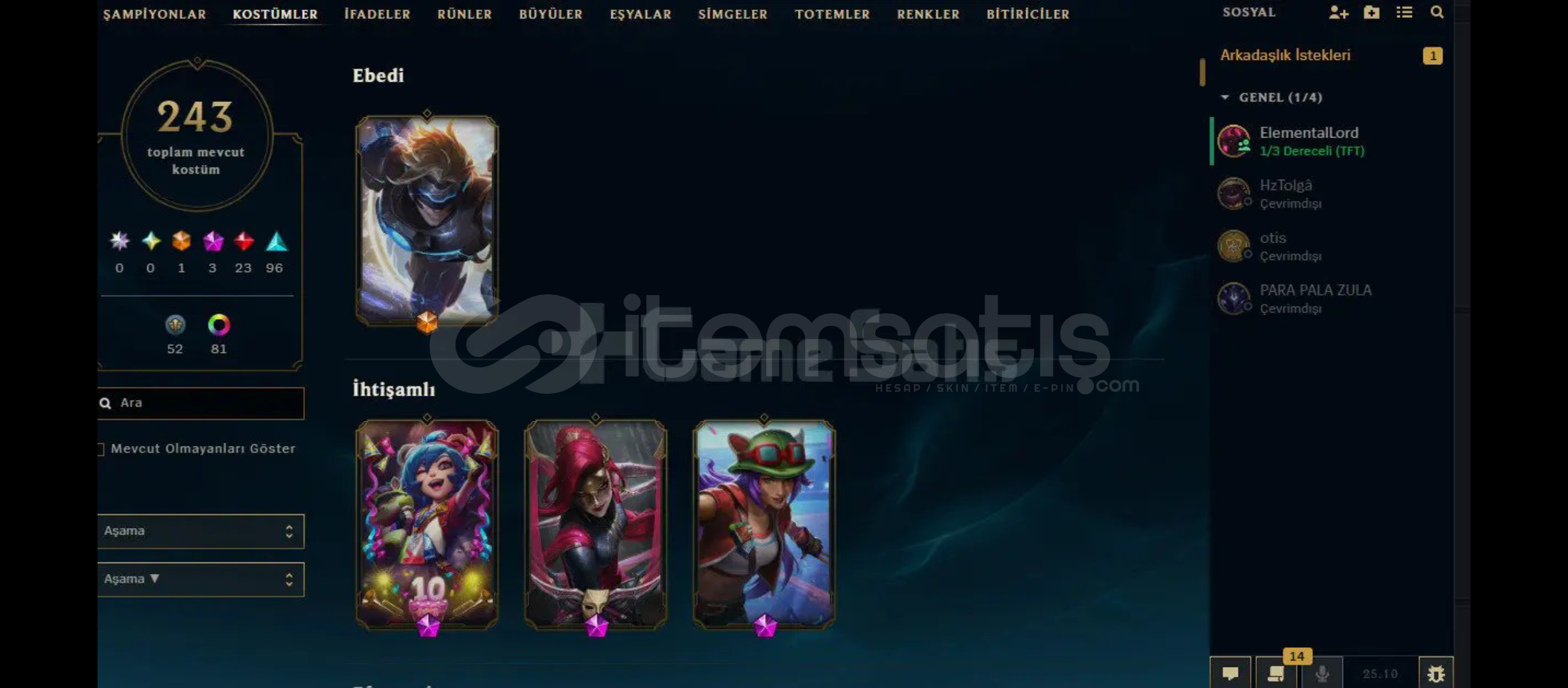 Hesap 352 leveldir.Tüm karekterler açıktır.250 kostüm vardır hesapta prestij katarina kostümü vardır ve lux prestij vardırhesapta 81 adet kostüm renk paketi bulunmaktadır.hesap ağırlıklı olarak adc main adclerin hepsinde ustalık ve kostümleri vardır hepsinin renk paketleri dahilhesap e postanıza devir edilecektir.askerde olduğum için acil satılıktır ihtiyaçtan d...