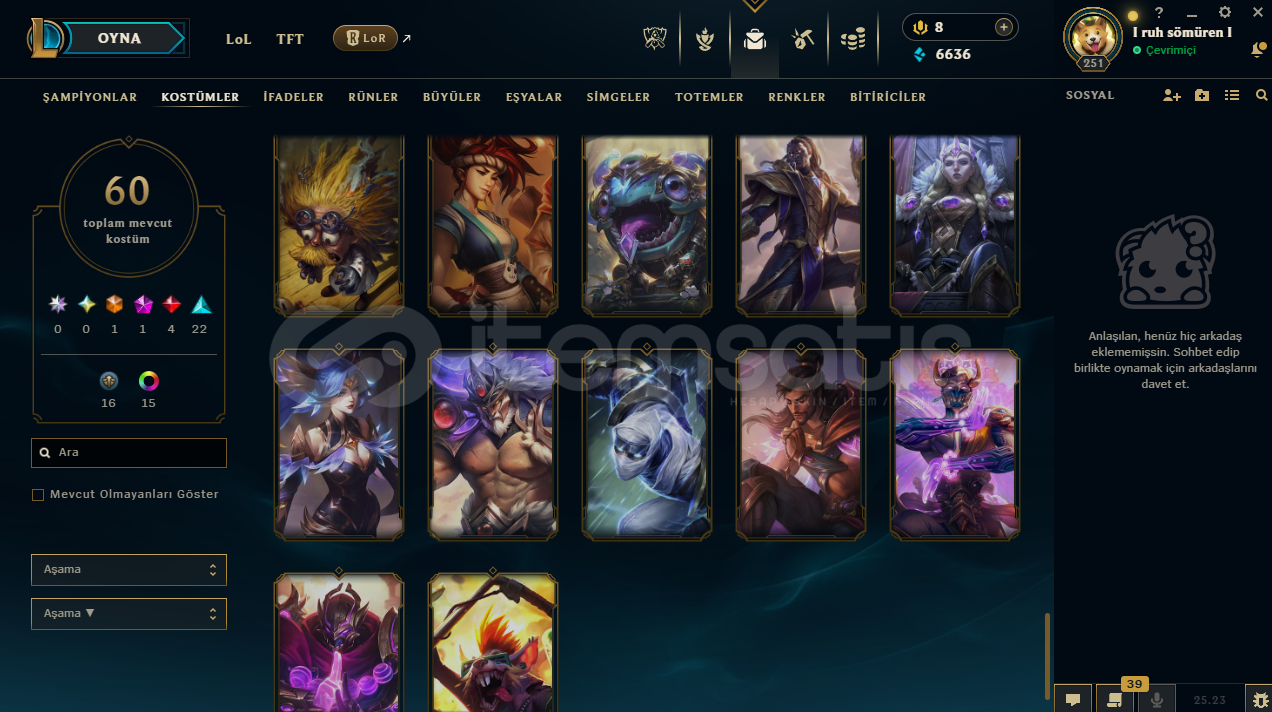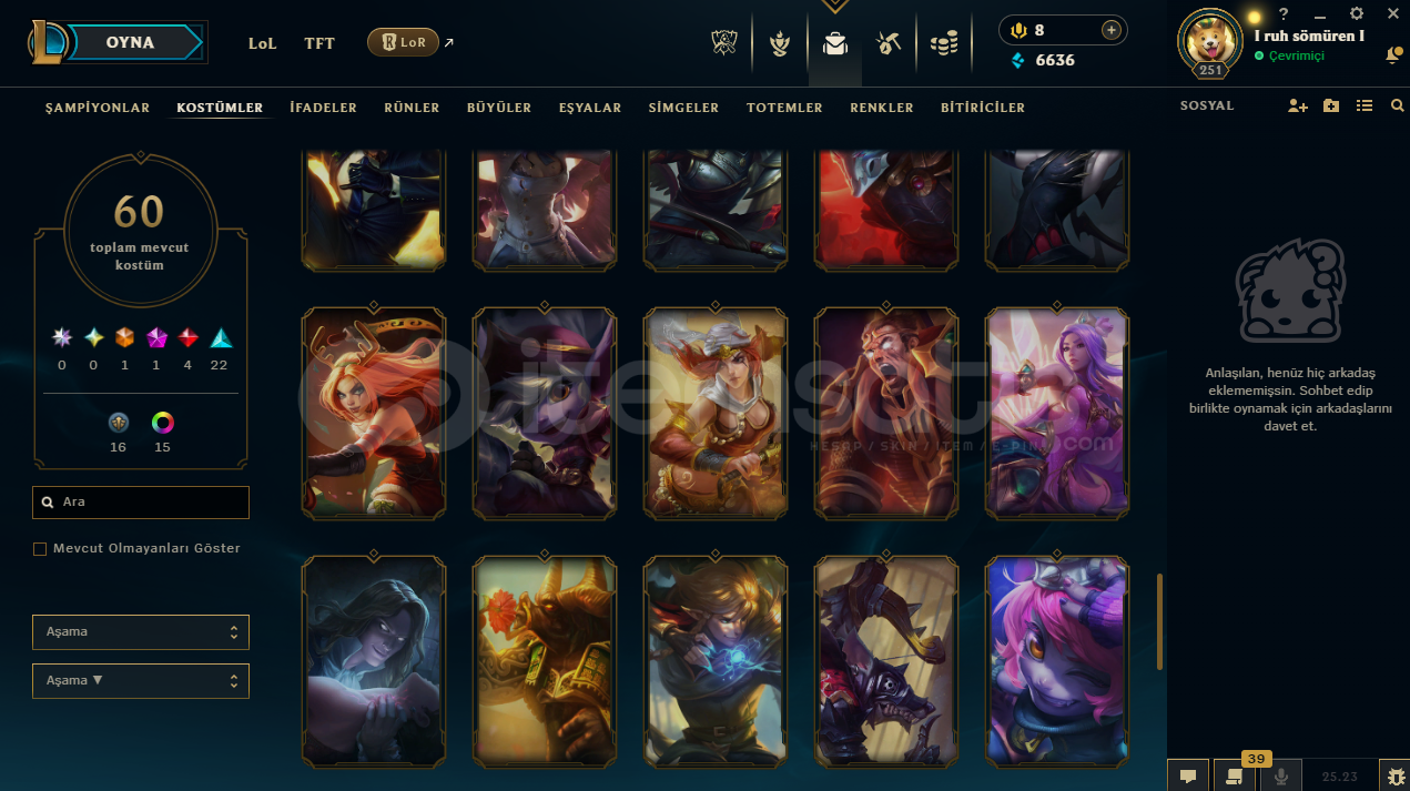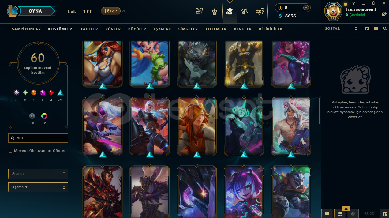 hesapta 152 şampiyon, 60 kostüm, 6636 mavi öz vardır.