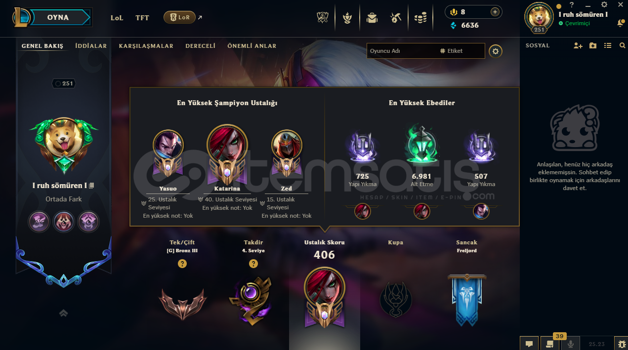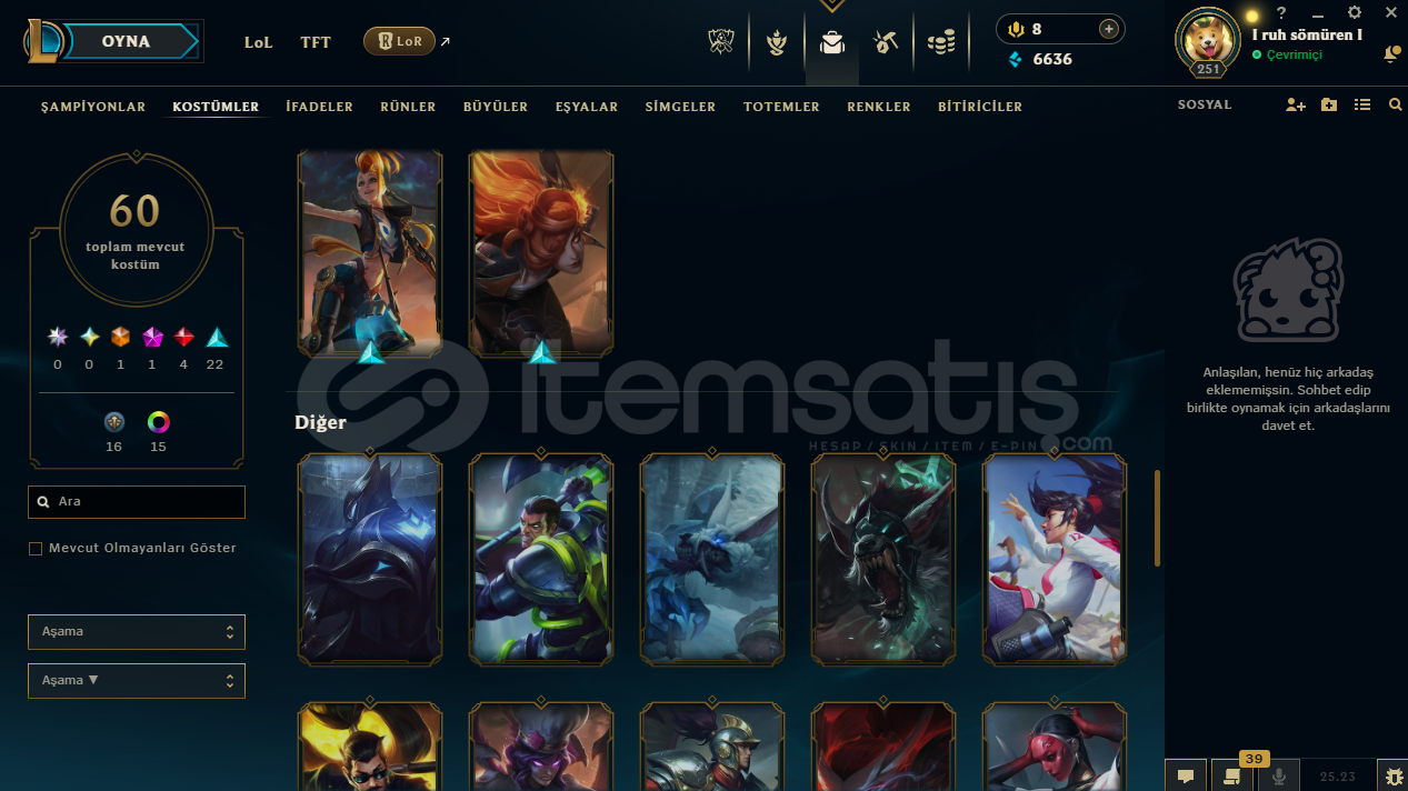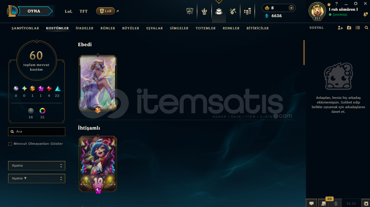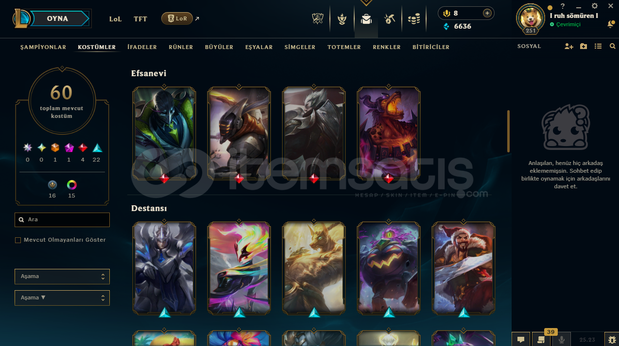 hesapta 152 şampiyon, 60 kostüm, 6636 mavi öz vardır.