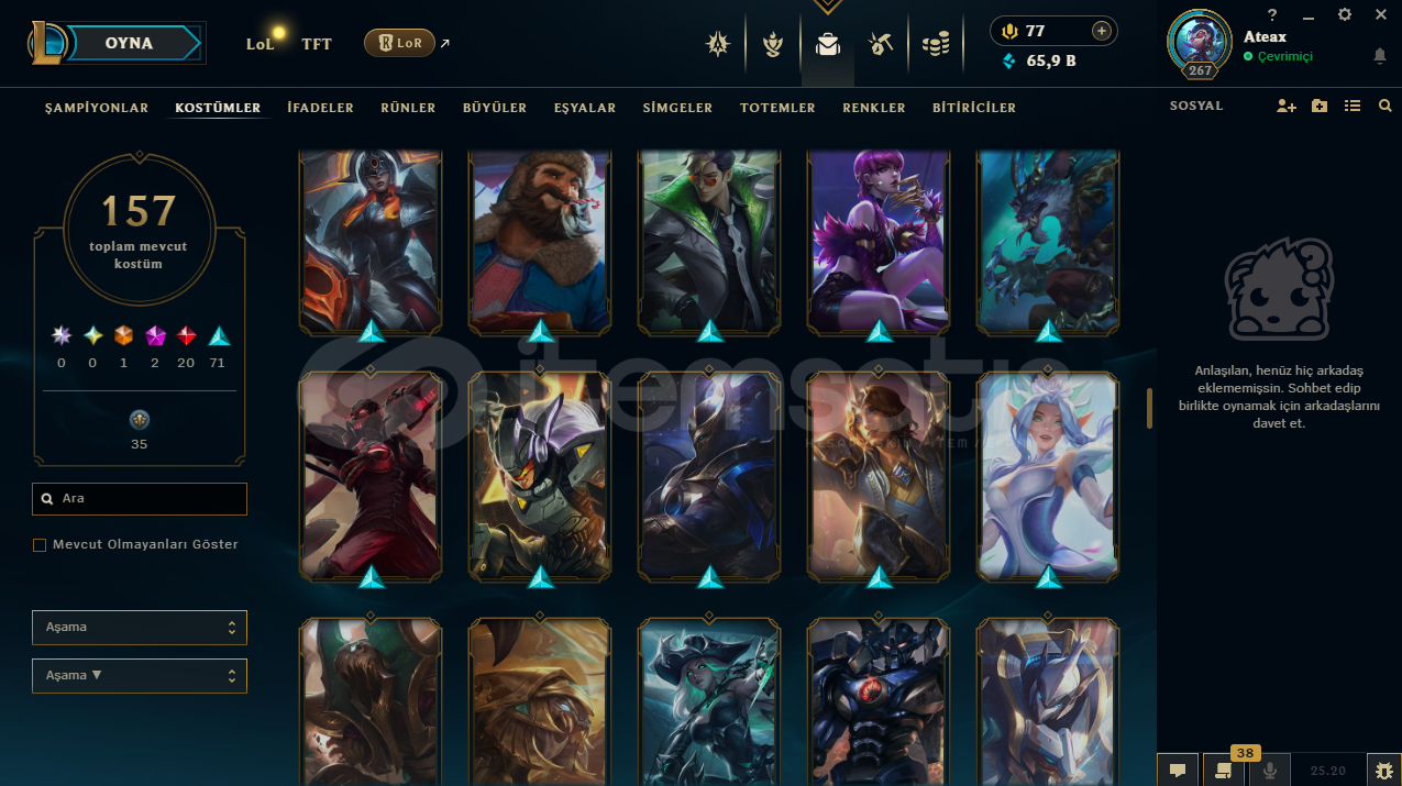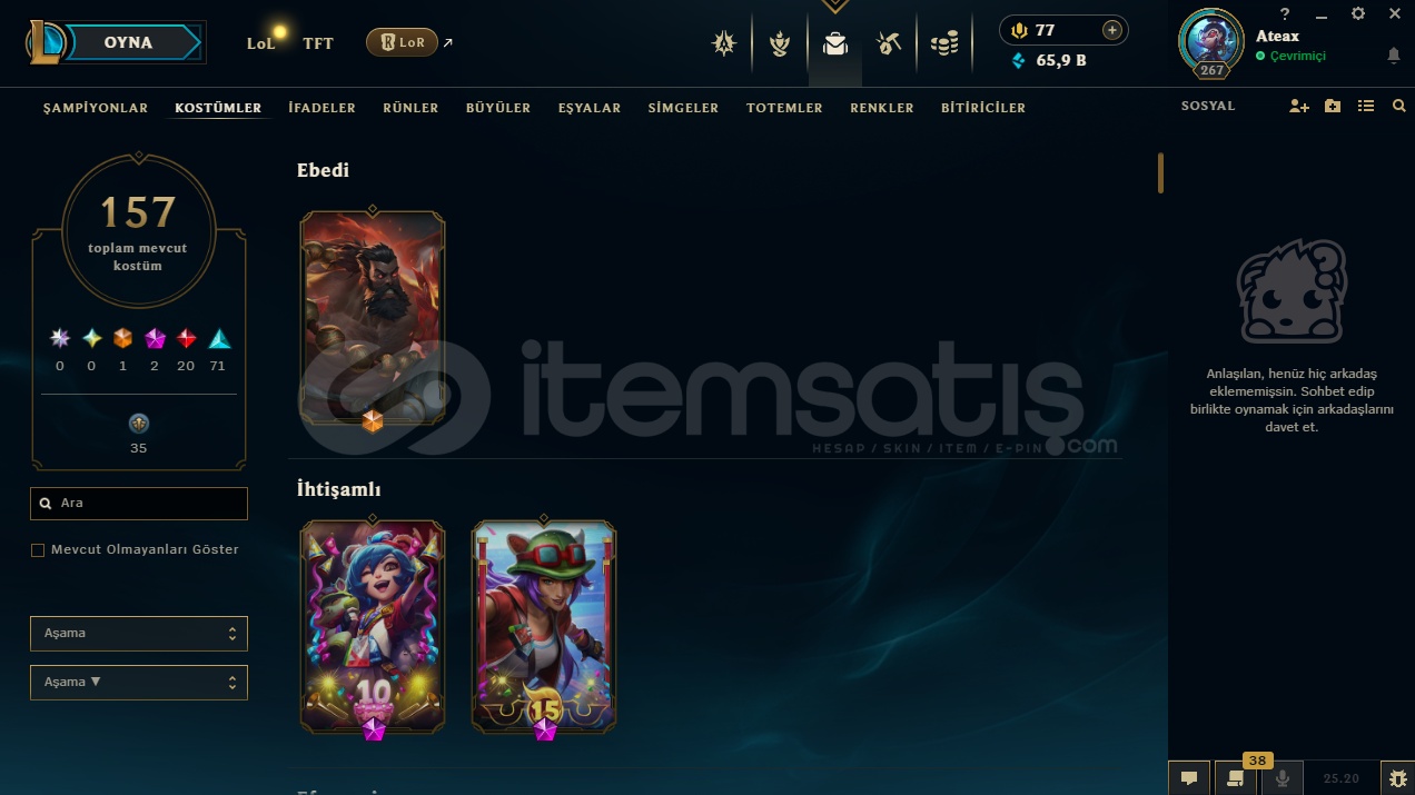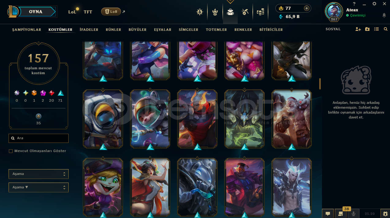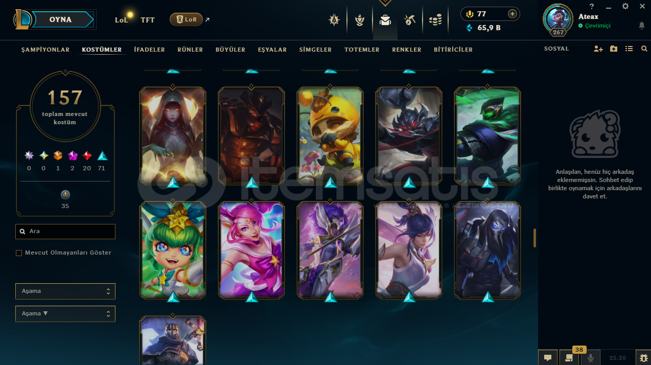 uygun bütçeli lol hesapları için profilime göz atabilirsinizhesap tr hesabıdır.hesabın maili değişmektedir.hesabın herhangi bir banı yoktur.hesap 3 takdir seviyesine sahiptir.hesabın clash numarası boştadır.hesapta 167 şampiyon, 157 kostüm, 65,909 mavi öz vardır.hesapta 1 ebedi, 2 ihtişamlı, 20 efsanevi, 71 destansı kostüm vardır.ekran kaydı a&cced...