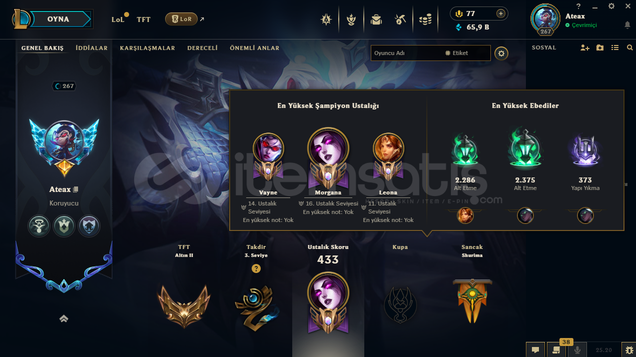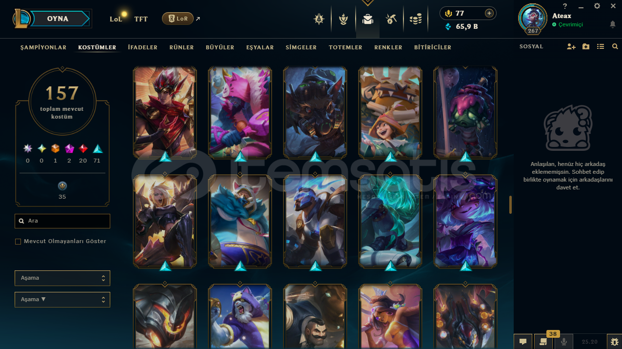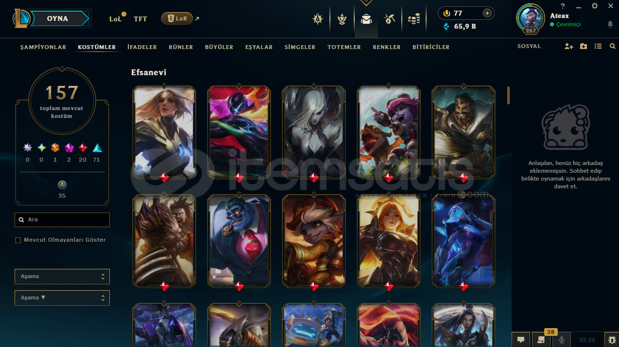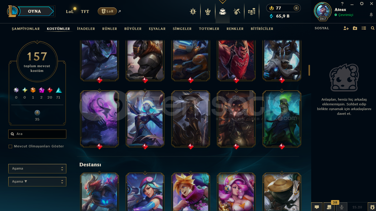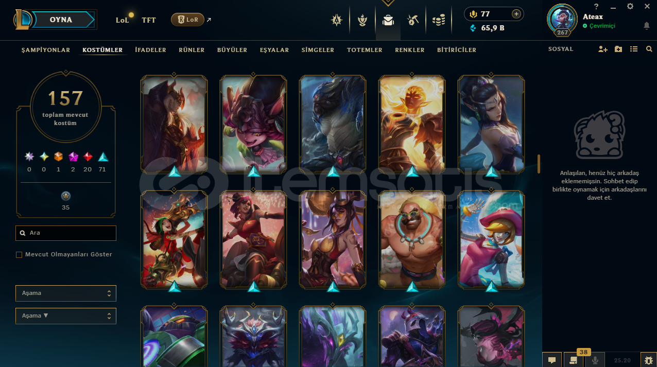 uygun bütçeli lol hesapları için profilime göz atabilirsinizhesap tr hesabıdır.hesabın maili değişmektedir.hesabın herhangi bir banı yoktur.hesap 3 takdir seviyesine sahiptir.hesabın clash numarası boştadır.hesapta 167 şampiyon, 157 kostüm, 65,909 mavi öz vardır.hesapta 1 ebedi, 2 ihtişamlı, 20 efsanevi, 71 destansı kostüm vardır.ekran kaydı a&cced...