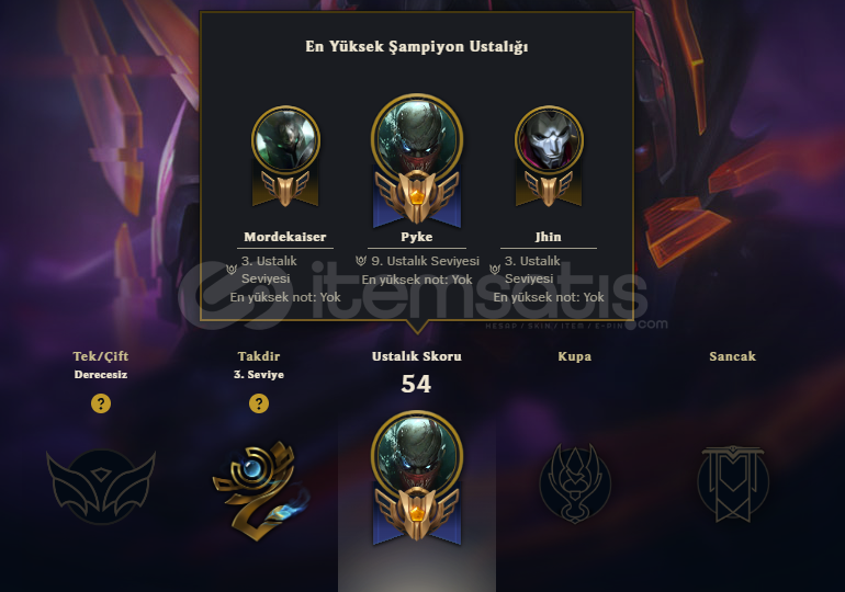 3 Kostümlü 41 Level TR HesapHesabın op.gg linki: https://op.gg/tr/lol/summoners/TR/Pykeee1-TR1