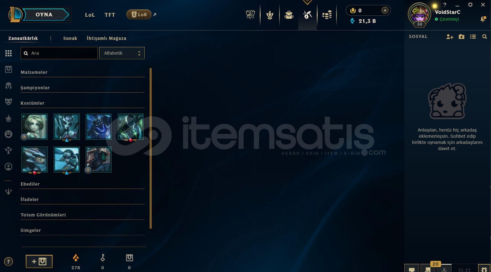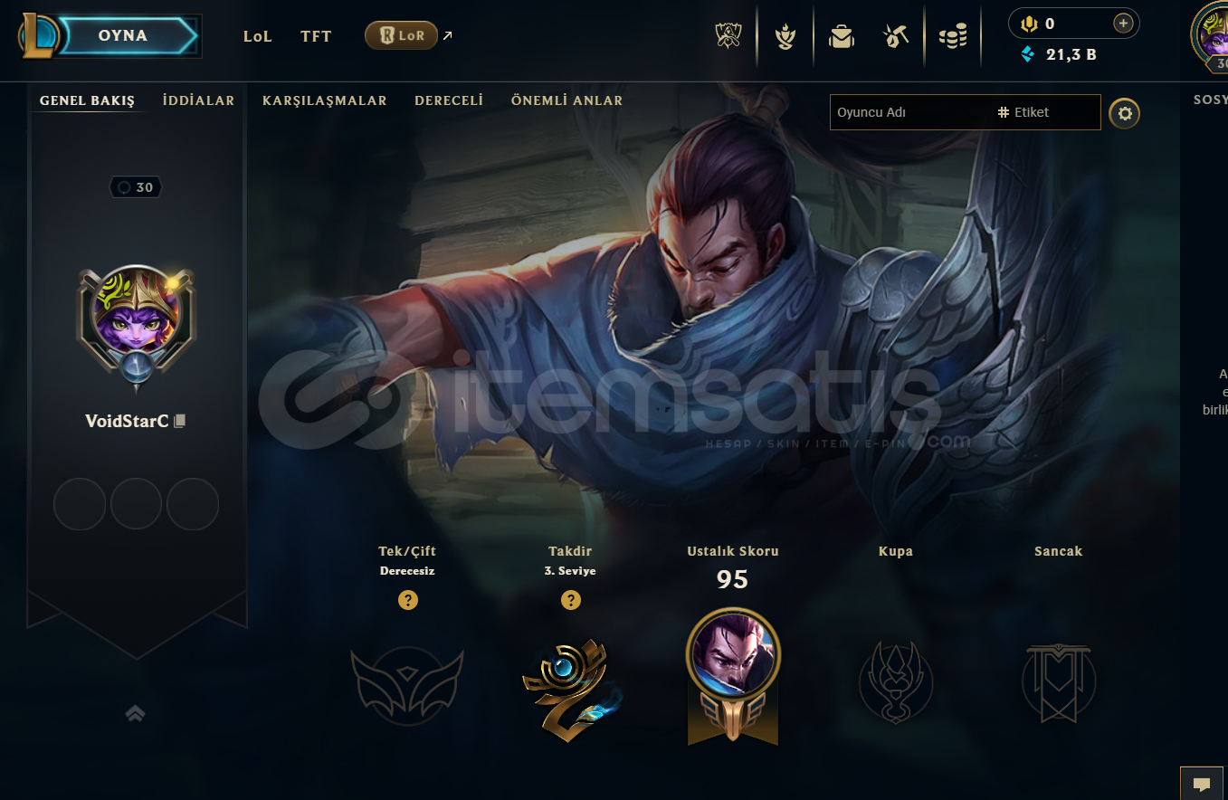 43 şampiyon açık. 21k mavi öz. 278 turuncu öz ve 7 skin açılmamış vaziyette.