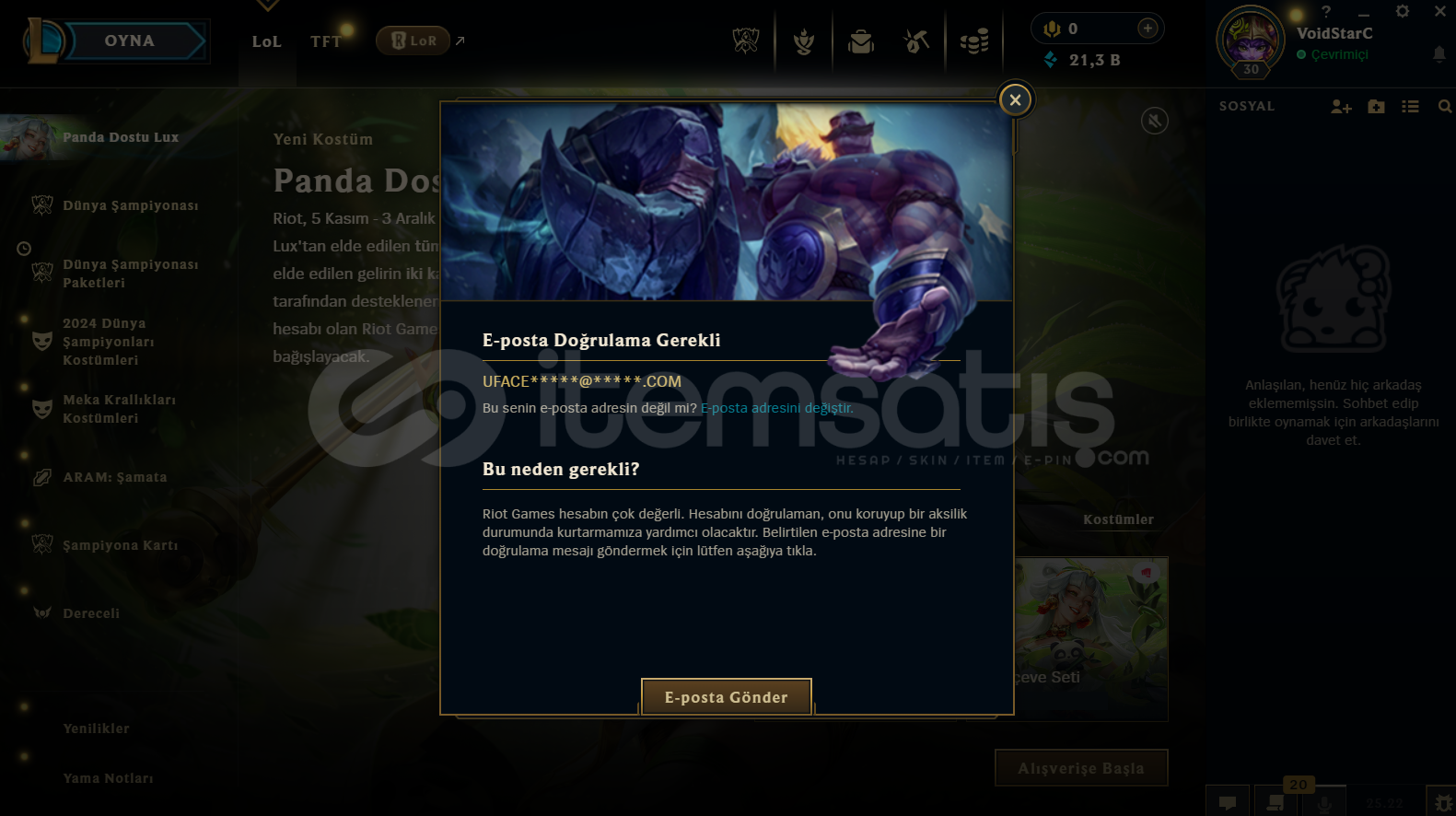 Mail onaysızdır. Resimdeki gibi hesaba girerken maili değiştirmeniz yeterli olacaktır.Ranked için zorunlu 10 tam gaz maçı yapılmıştır. Aram ve modlar ile kastığım hesap.Herhangi ban,küfür olmamış ve yüksek winrate li temiz hesaptır.43 şampiyon açık. 21k mavi öz. 278 turuncu öz ve 7 skin açılmamış vaziyette.Açılmamı#...