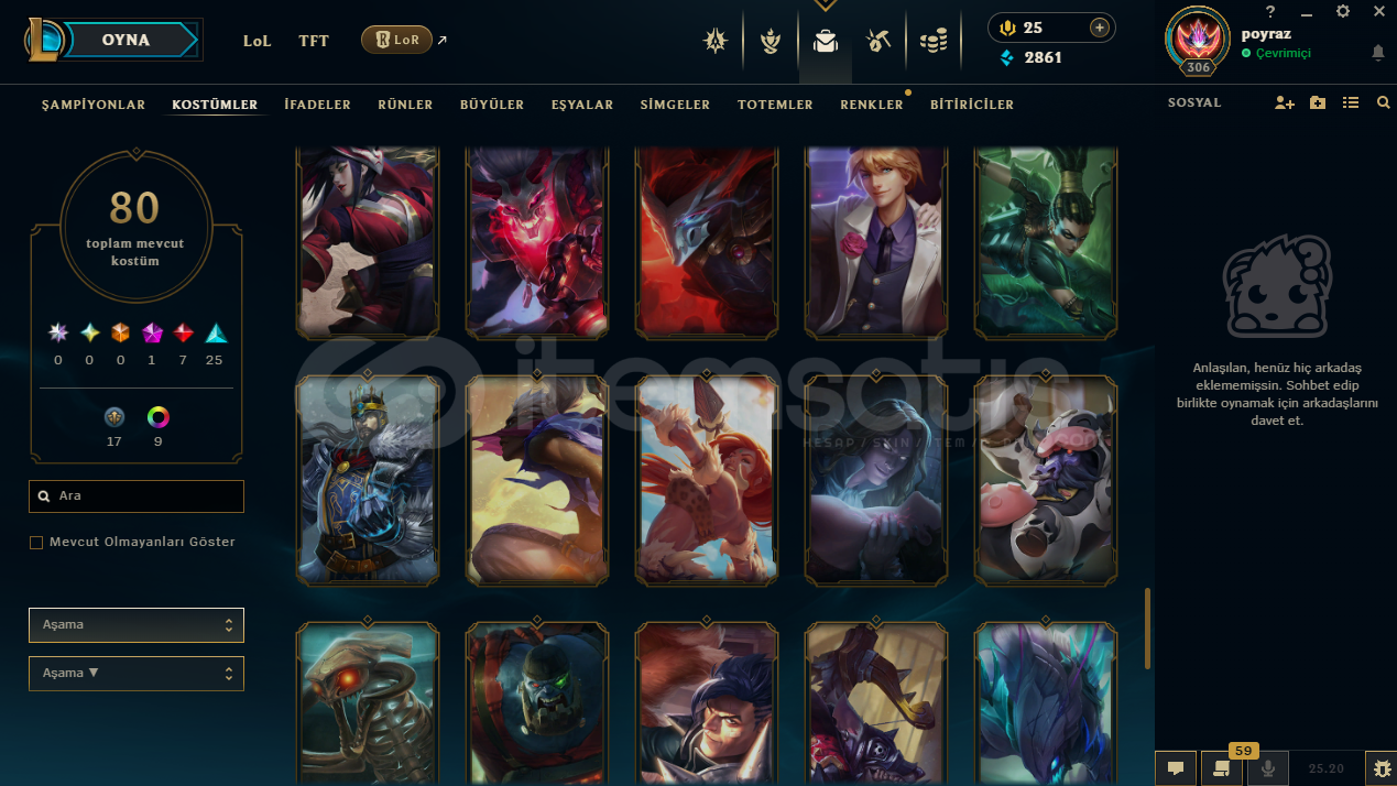 uygun bütçeli lol hesapları için profilime göz atabilirsinizhesap tr hesabıdır.hesabın maili değişmektedir.hesabın herhangi bir banı yoktur.hesap 3 takdir seviyesine sahiptir.hesabın clash numarası boştadır.hesapta 139 şampiyon, 80 kostüm, 2861 mavi öz vardır.hesapta 1 ihtişamlı, 7 efsanevi, 25 destansı kostüm vardır.ekran kaydı açmayı ...