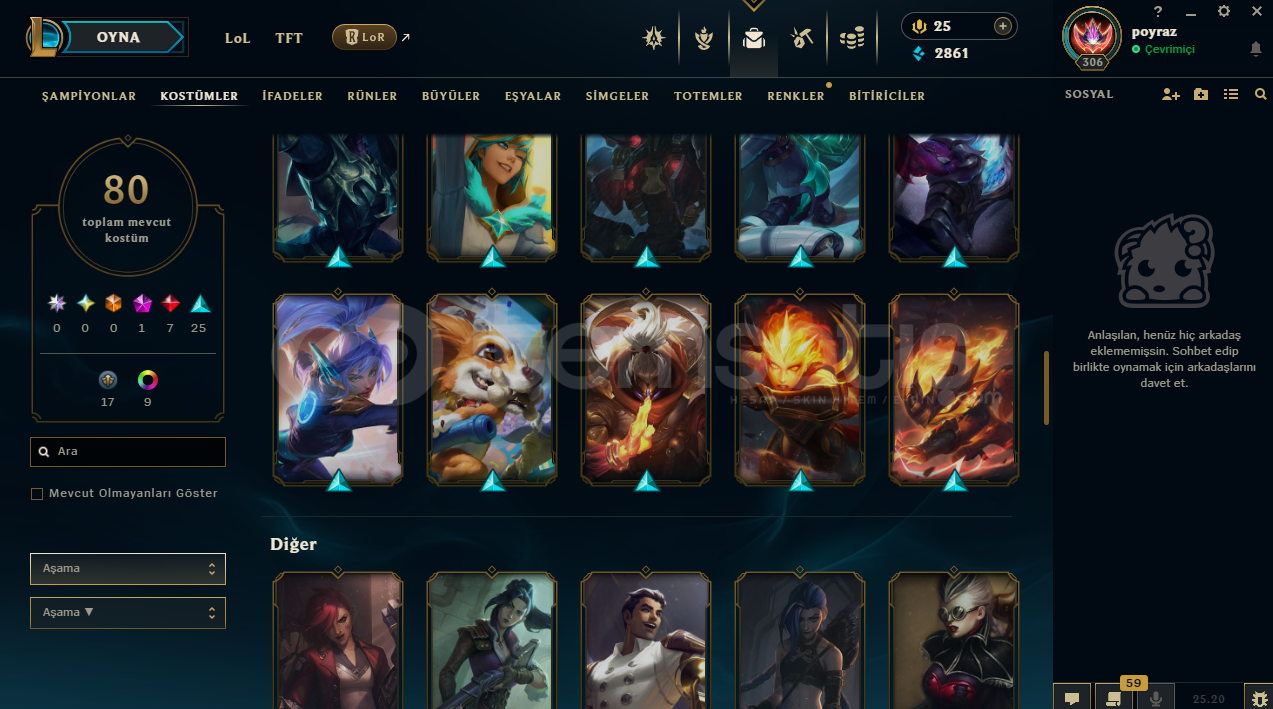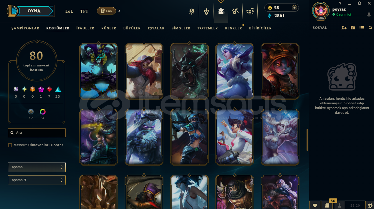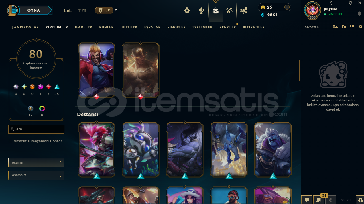 hesapta 139 şampiyon, 80 kostüm, 2861 mavi öz vardır.