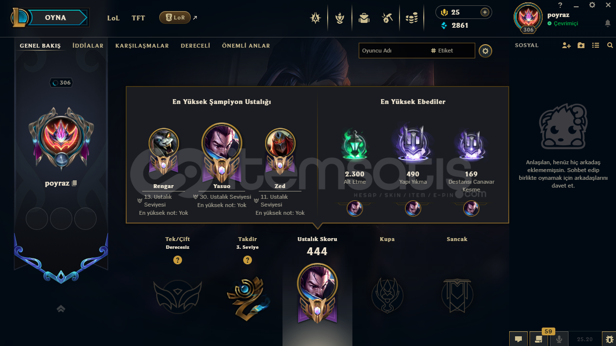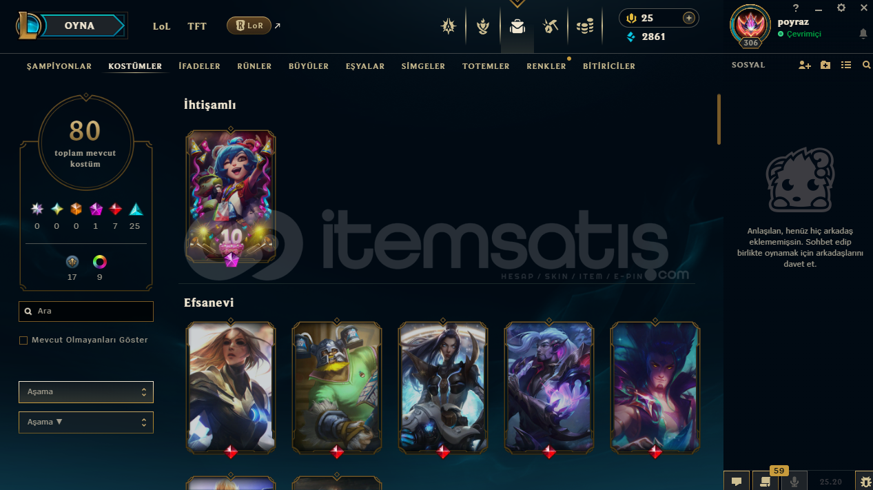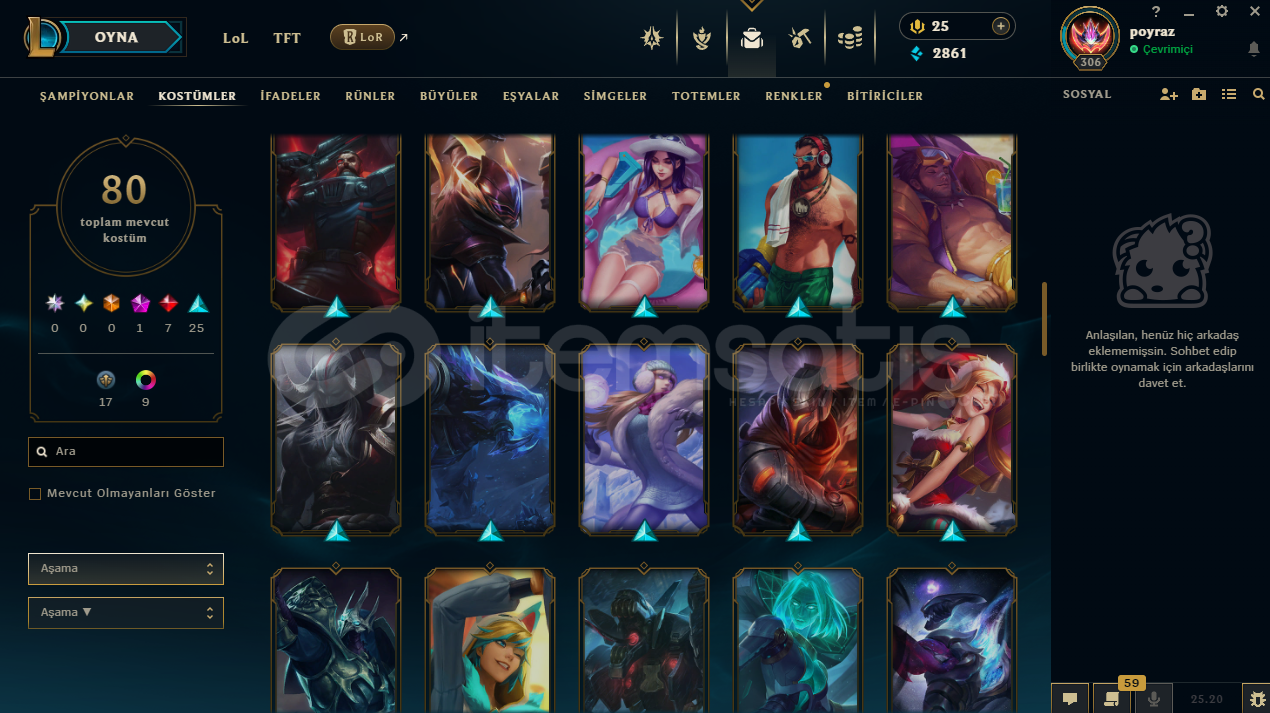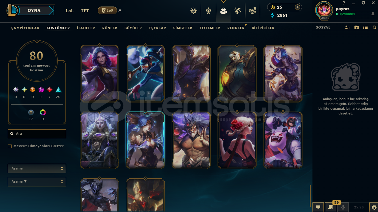 hesapta 139 şampiyon, 80 kostüm, 2861 mavi öz vardır.