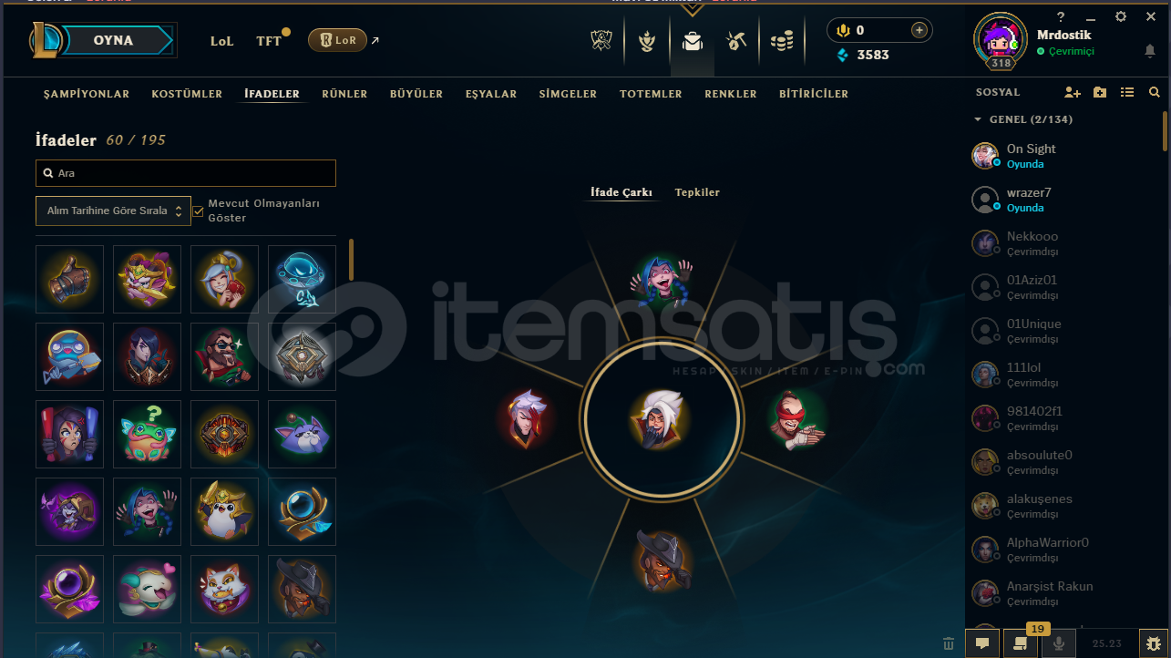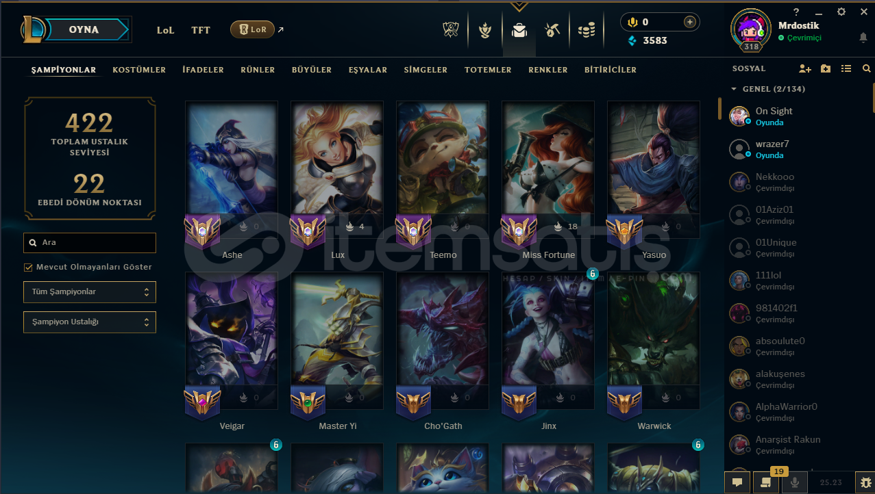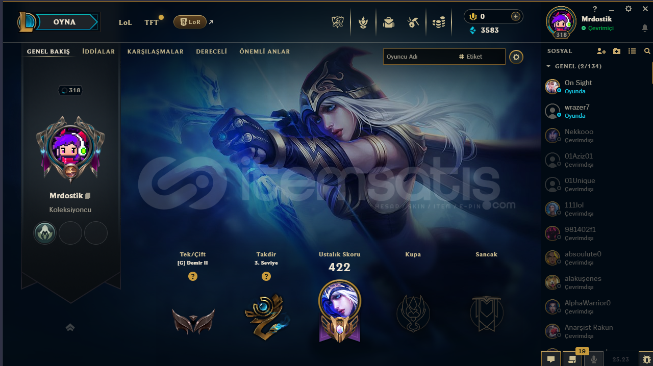 •Sunucu: EUW•Seviye 318 •Şampiyon Sayısı 126•Ceza yok, chat ban yok•E-posta değişimi yapılabilir•Rank: Demir (uzun zamandır girilmiyo hesaba ama peak rankı bronz)