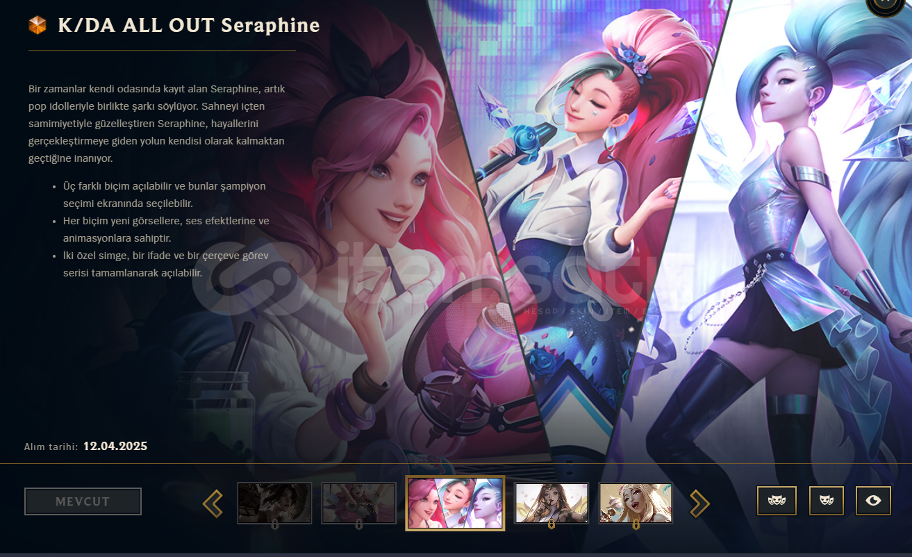 K/DA ALL OUT Seraphine : 3250 RPÇelik Kuvvet Garen : 1350 RPKumların Hayaleti Pyke : 1350 RPBen de Hayvanım Udyr : 975 RPDünyaları Yıkan Nautilus : 750 rpMarki Vladimir : 520 RPŞanlı Fiora : Dereceli ÖdülüBU SAYILANLAR HESABIN İÇERİSİNDEKİ KOSTÜMLERDİRŞampiyon sayısı: 8026.685 Mavi ÖzMMR Hiç Fenal DeğilALACAKLARA ŞİMDİDEN HAYIRLI OLSUN DAHA FAZLA İND&#...