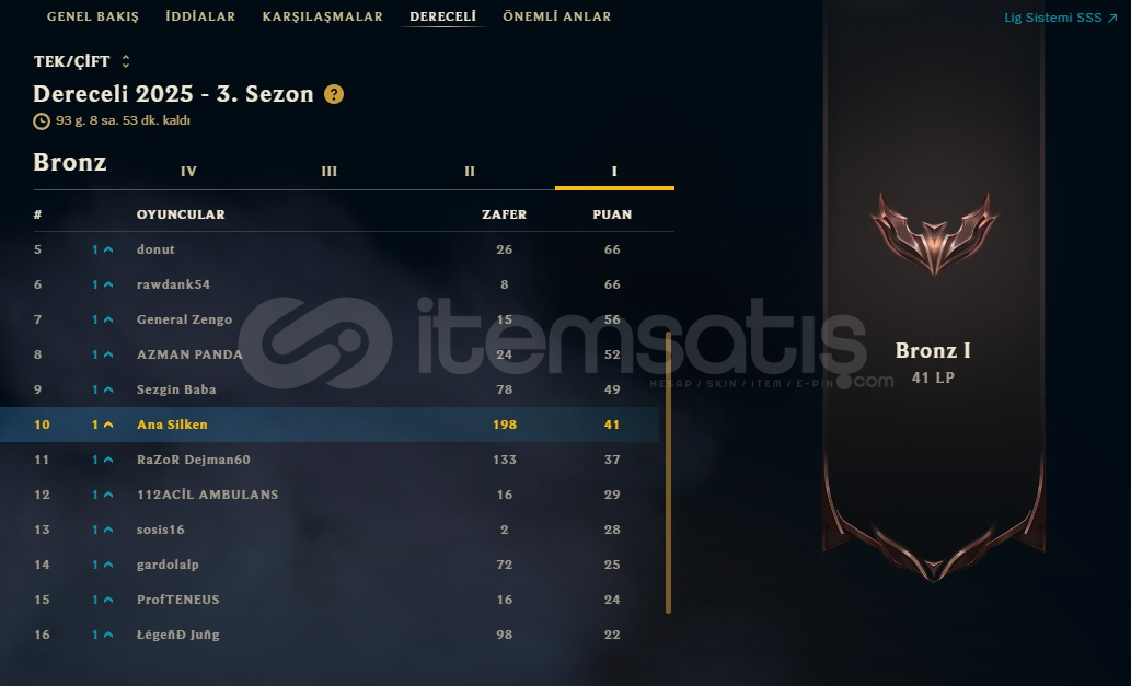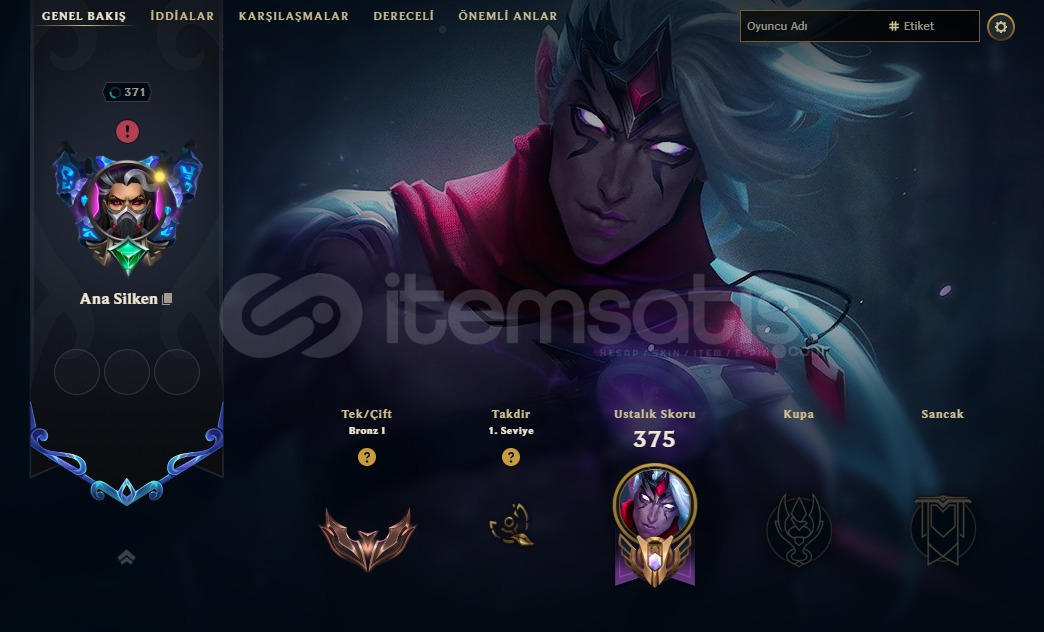 İsim değiştirme hakkı mevcut.. Oyun oynamaktan sıkıldığım ve Bilgisayarımı sattığım için hesabı satıyorum zaten satmadan öncede TR serverini bırakmıştım Her maç küfür kaos troll sıkıldığım için ADC main hesabımı satıyorum. Çok fazla küfür ettiğim için chat ban yemişti 25 maçlık...