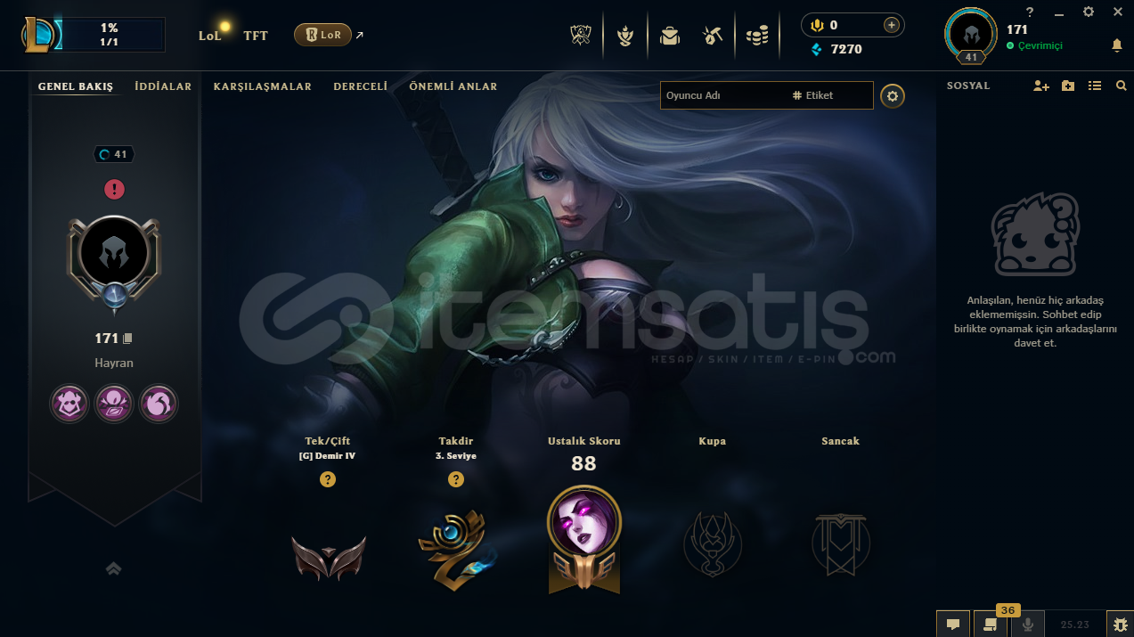 İLAN ÖZELLİKLERİ-Hesap 41 LVL dir-Hesapta yaklaşık 4 veya 5 tane köstün vardır-Hesapta 3 maç dereceli banı vardır -Hesap Bilgileri değiştirebilir-Kafanıza takılan soruları sorabilirsiniz