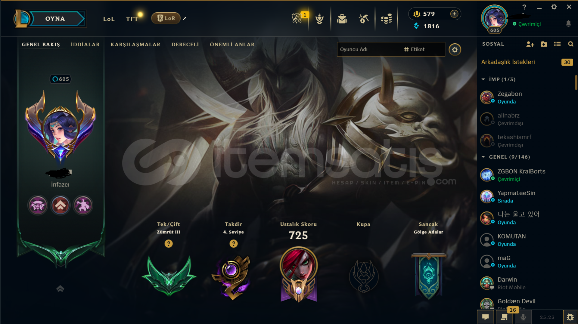 9 YILDIR AKTİF KULLANILAN HESABIM SATILIKTIRHESABIN RANKI ZÜMRÜT 3 GEÇEN SENE DİAMOND 4 BİTİRDİ MMR GÜZEL5 EBEDİ 19 İHTİŞAMLI KOSTÜM VAR605 LEVELDİRBÜTÜN KARAKTERLER AÇIKNEREDEYSE HER KARAKTERDE SKİN VARHESAP TAMAMEN İLANDA GÖRÜLDÜĞÜ GİBİDİRHESAP MAİLİNİZE DEVREDİLECEKTİRHESABIN 2. SAHİBİYİM ANCAK HESAP 7 YILDIR BE...