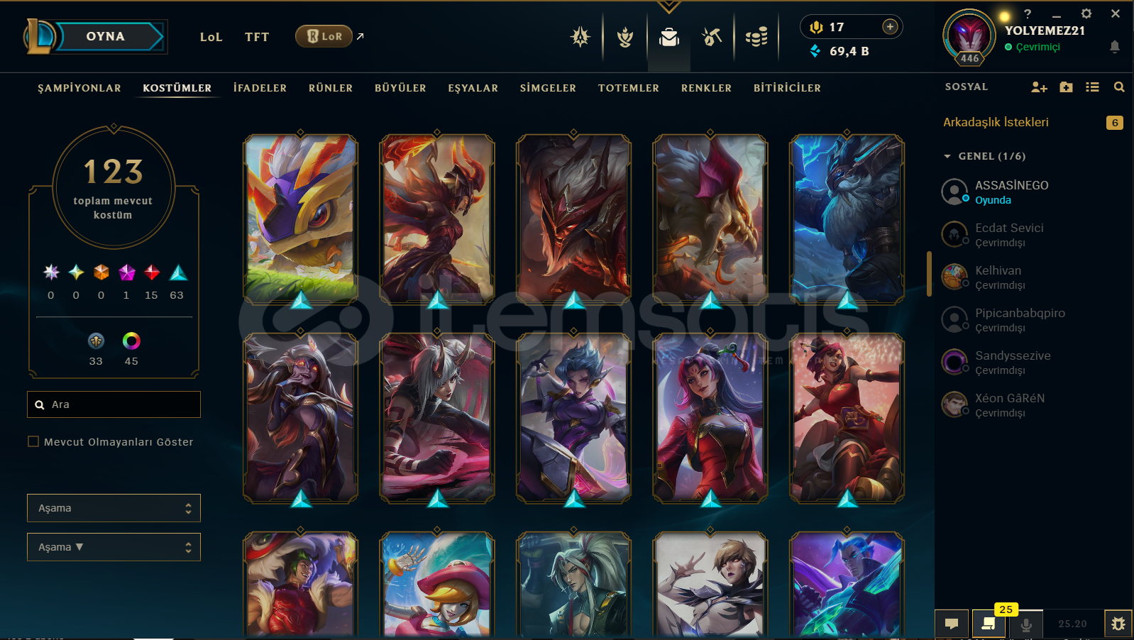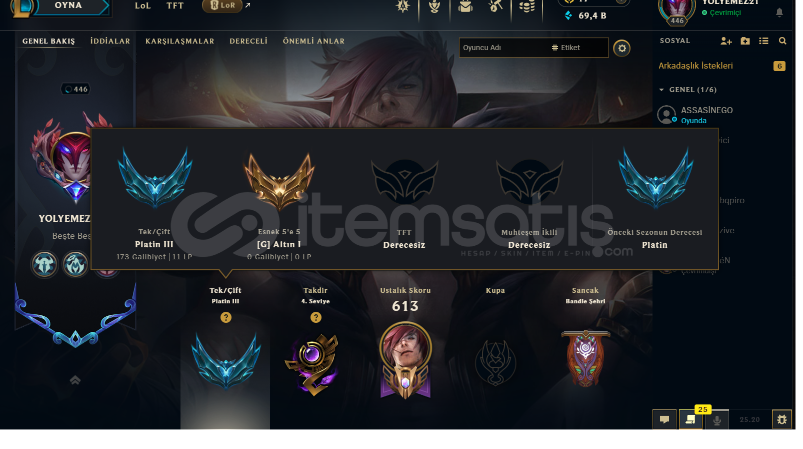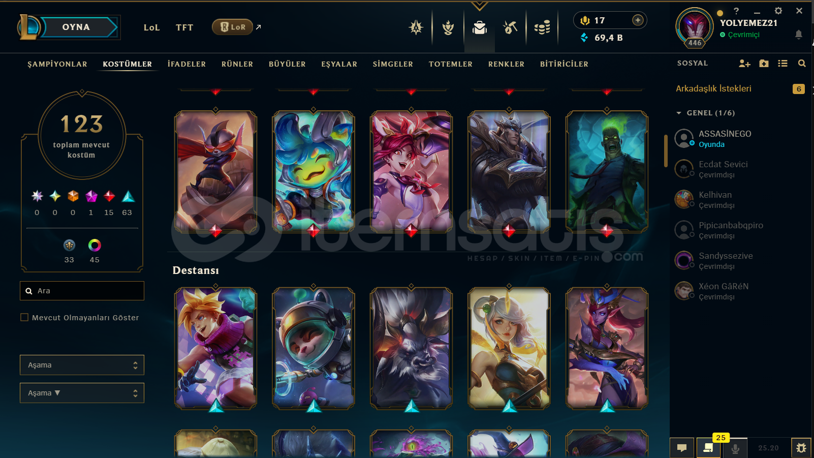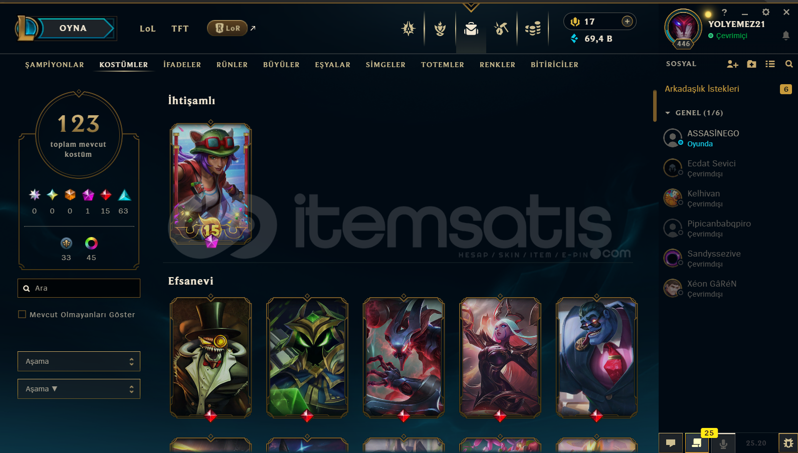 446 lvl zümrüte cıkmiş mmr yüksek plat 3 123 köstüm tüm karakterler açık 60k üstü mavi öz rank kasabilirsiniz 1 ihtişamlı 15 efsanevi 63 nadir 33 hatıra 45 renk   gmaili kendiniz değiştirebilirsiniz pazarlık olur