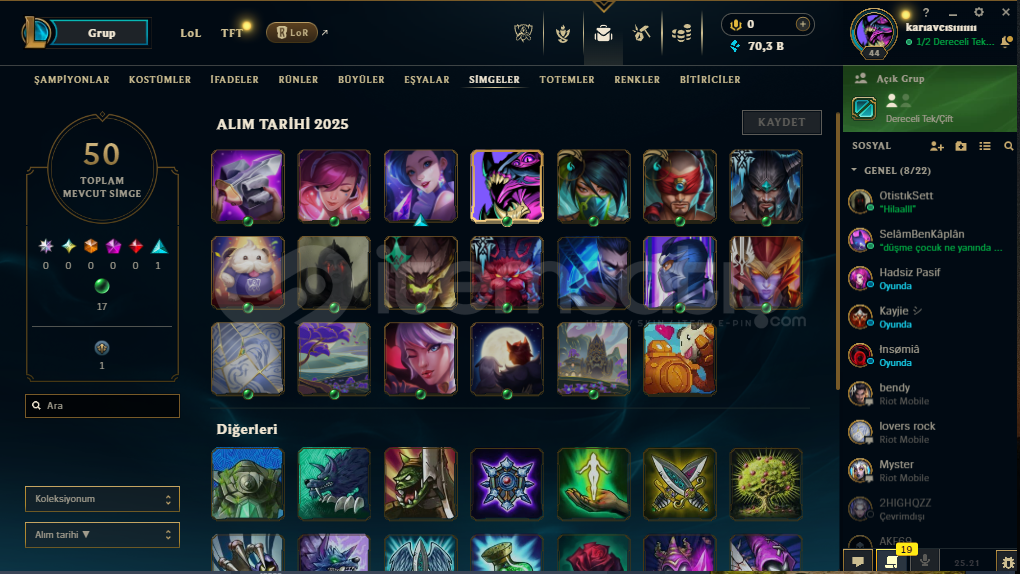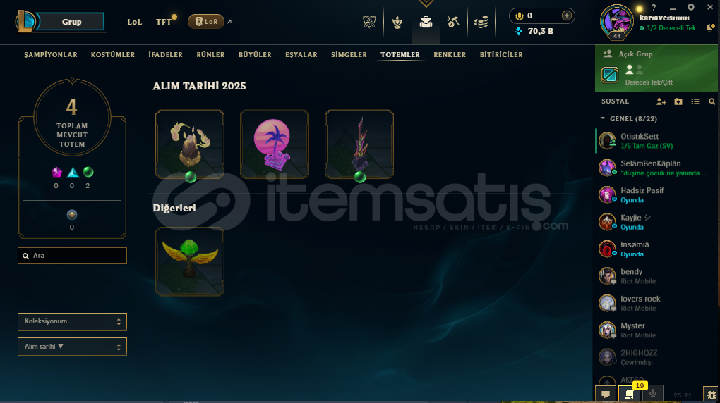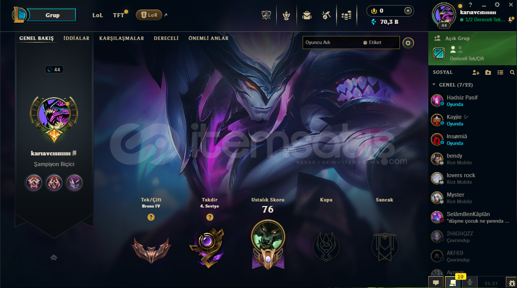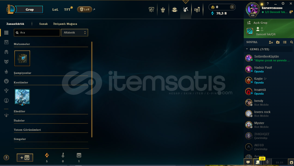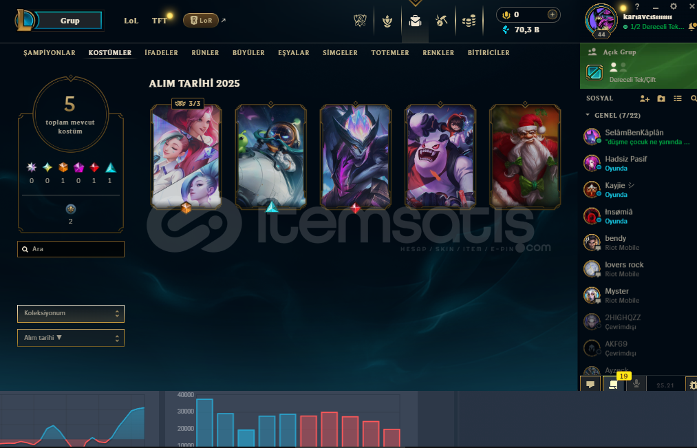 • HESAP 45 SEVİYEDİR •• 70K MAVİ ÖZ VARDIR •• 6 TANE KOSTÜM VARDIR 1 EBEDİ 1 EFSANEVİ 3 DESTANSI • •BRONZ IV •• PAZARLIK ABARTISIZ OLMAK ŞEKİLDE VARDIR •• ALICISINA HAYIRLI OLSUN •