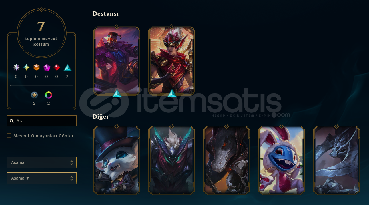 İÇERİSİNDEKİ KOSTÜMLERDemacia Vice Lucian: 1350 RP + Obsidyen Rengi 290 RPMistik Rakan: 1350 RP + Zümrüt Rengi 290 RPPofuduk Fizz: 975 RPYağmacı Alistar: 750 RPEjder Şovalyesi Mordekaiser: 520 RPGalaktik Renekton: 520 RPBeyefendi Gnar: 975 RP70 ADET ŞAMPİYON AÇIK! 3 ADET RÜN SAYFASI VAR VE 9200 MAVİ ÖZHesabın hiç bir sıkıntısı yoktur Takdir Seviyesi 4. seviyededir Hesap &ccedi...