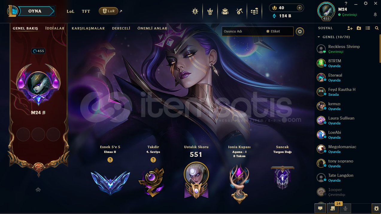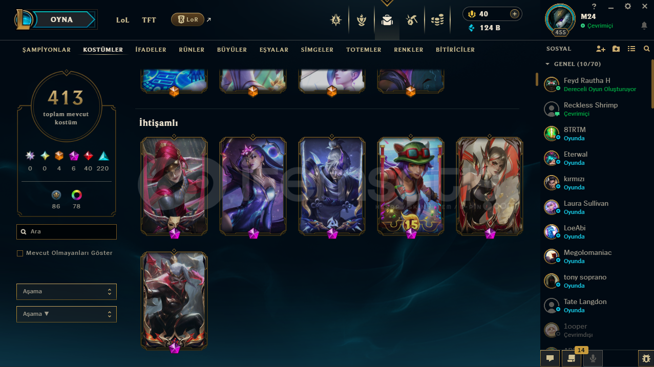 -Bu İLANI satın aldıktan sonra, siparişiniz ANINDA teslim edilir!- 413 KOSTÜM bulunmaktadır ve 455 LEVEL ve rankı ise ELMAS rankındadır ve TAKDİR seviyesi 4 Ebedi, 6 İhtişamlı, . 40 Efsanevi kostüm, 220 Destansı kostüm, 86 Hatıra Kostüm ve 78 Renk bulunmaktadır. Görselden detaylı olarak bakabilirsiniz! full Şampiyon mevcuttur,