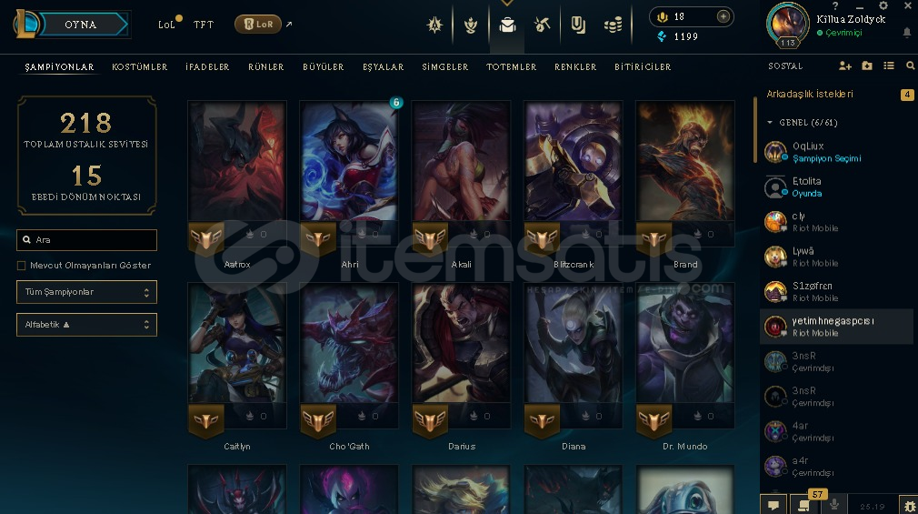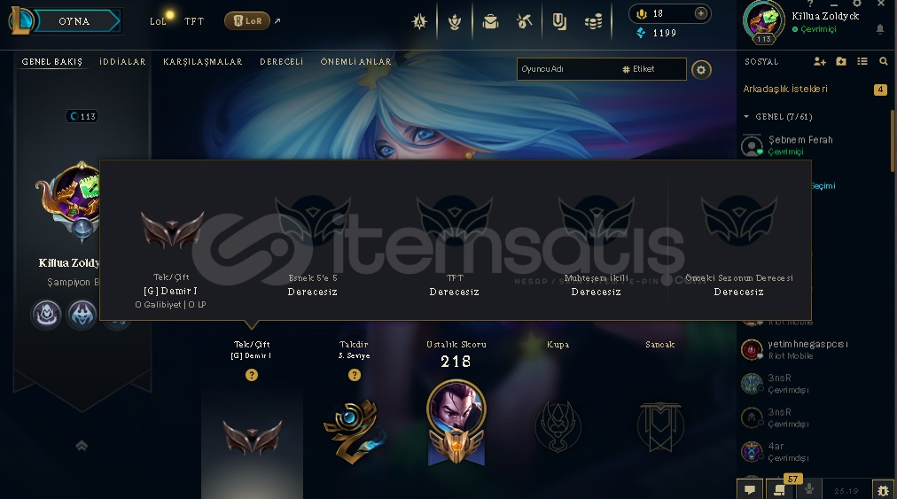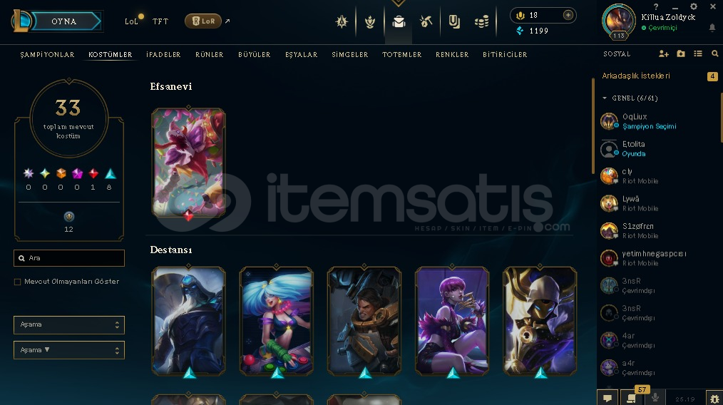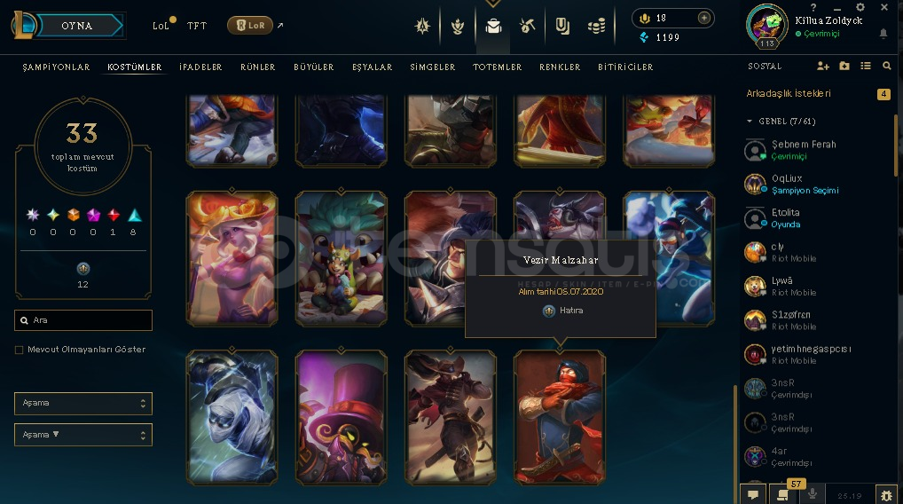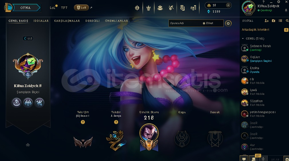 BU HESABIN VALORANT HESABI KALICI BANLANMIŞTIR------------------------------------------------- 113 Seviye 218 Ustalık Skoru3.Seviye Takdir17 Tane Ünvan33 Tane kostüm : Efsanevi Kostümler Parti canavarı fiddlestick EfsaneviDestansı kostümler2019 Dünya şampiyonası ryzeArcade SonaÇelik kuvvet garenK/DA EvelynnKozmik bela kassadinObsidiyen ejder settSavaş makinasi zacYaman siklet mundo12 Tane'de Hatıra kostü...