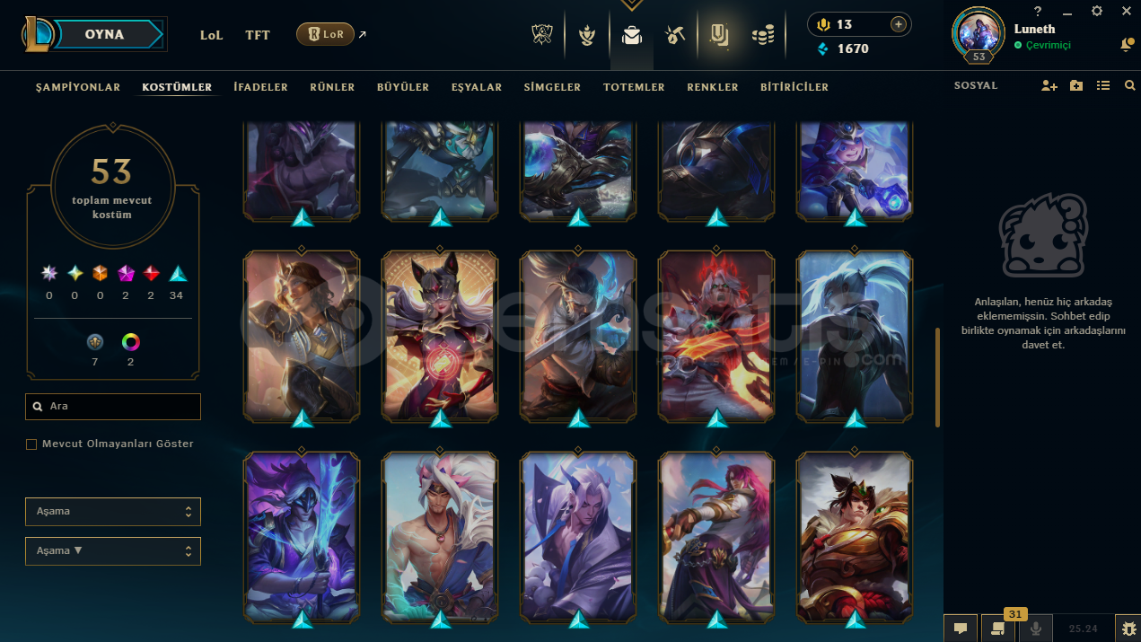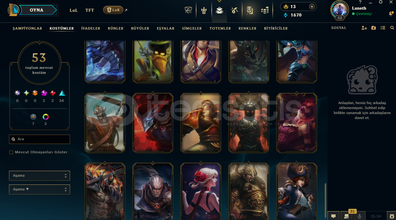 uygun bütçeli lol hesapları için profilime göz atabilirsinizhesap tr hesabıdır.hesabın maili değişmektedir.hesabın herhangi bir banı yoktur.hesap 3 takdir seviyesine sahiptir.hesabın clash numarası boştur.hesapta 87 şampiyon, 53 kostüm, 1670 mavi öz vardır.hesapta 2 ihtişamlı, 2 efsanevi, 34 destansı kostüm vardır.ekran kaydı açmayı unutmay&...