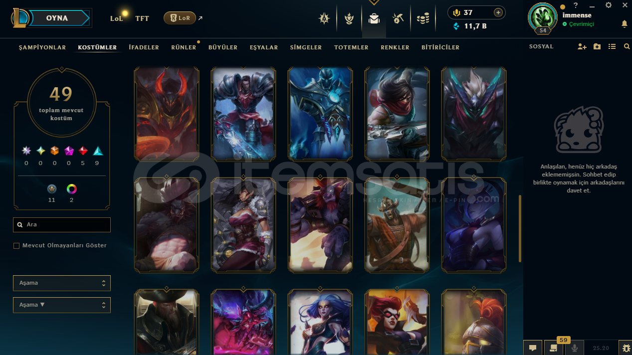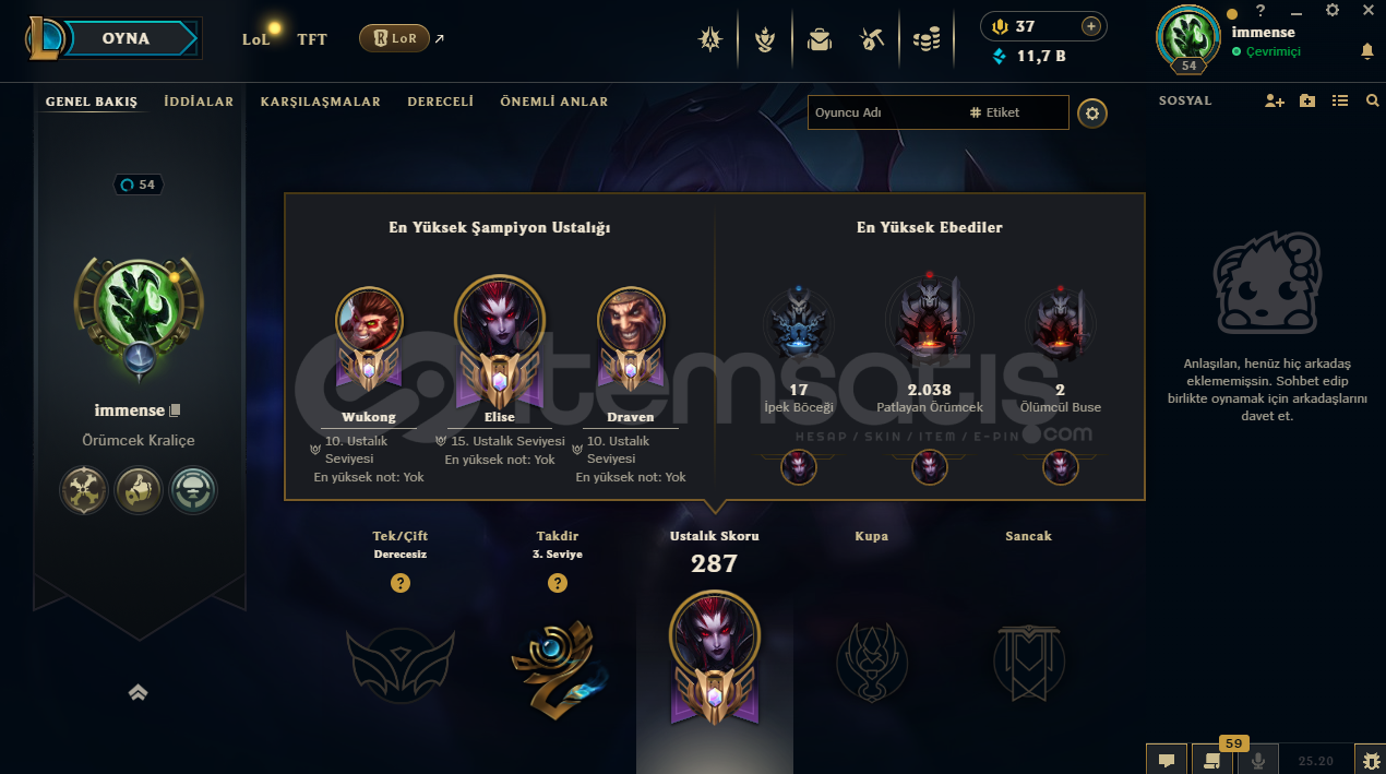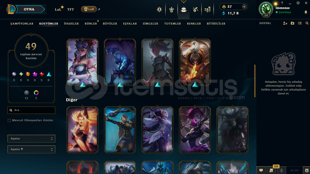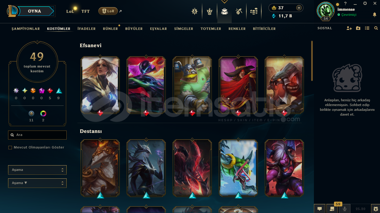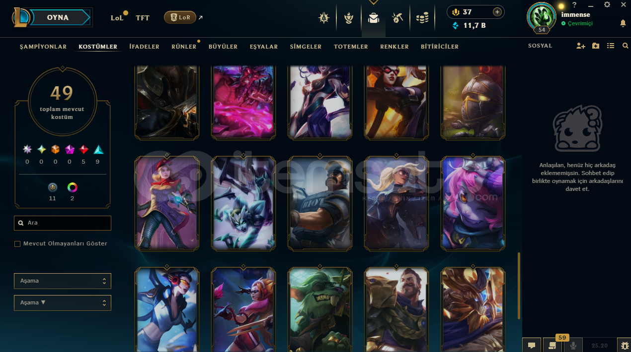 uygun bütçeli lol hesapları için profilime göz atabilirsinizhesap tr hesabıdır.hesabın maili değişmektedir.hesabın herhangi bir banı yoktur.hesap 3 takdir seviyesine sahiptir.hesabın clash numarası boştadır.hesapta 106 şampiyon, 49 kostüm, 11,762 mavi öz vardır.hesapta 5 efsanevi, 9 destansı kostüm vardır.ekran kaydı açmayı unutmayınız....