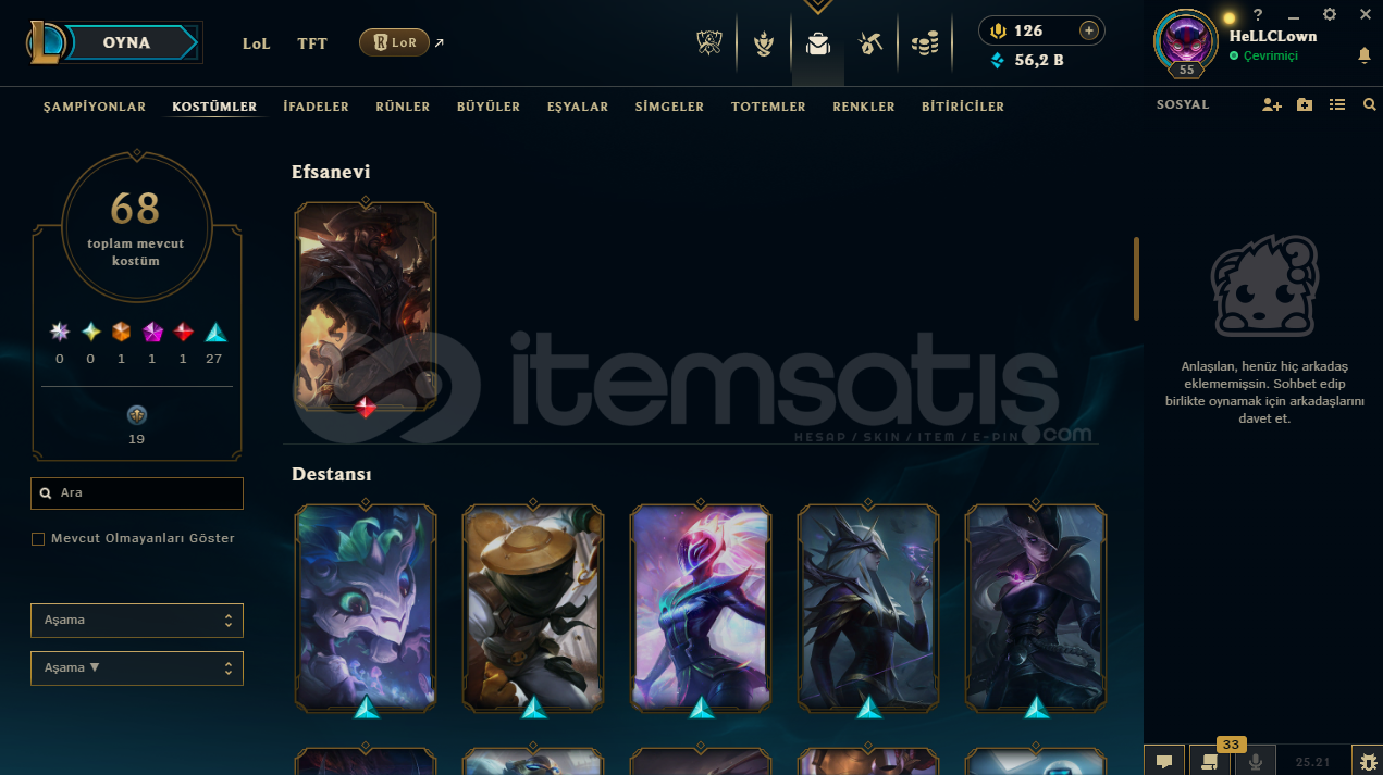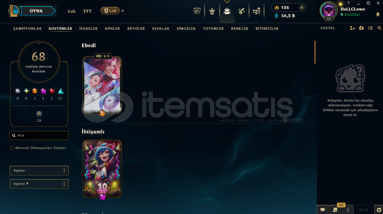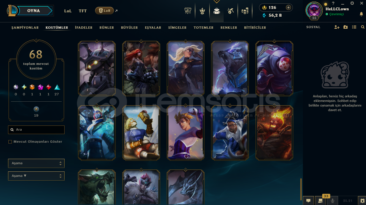 uygun bütçeli lol hesapları için profilime göz atabilirsinizhesap tr hesabıdır.hesabın maili değişmektedir.hesabın herhangi bir banı yoktur.hesap 3 takdir seviyesine sahiptir.hesabın clash numarası boştadır.hesapta 99 şampiyon, 68 kostüm, 56,231 mavi öz vardır.hesapta 1 ebedi, 1 ihtişamlı, 1 efsanevi, 27 destansı kostüm vardır.ekran kaydı aç...