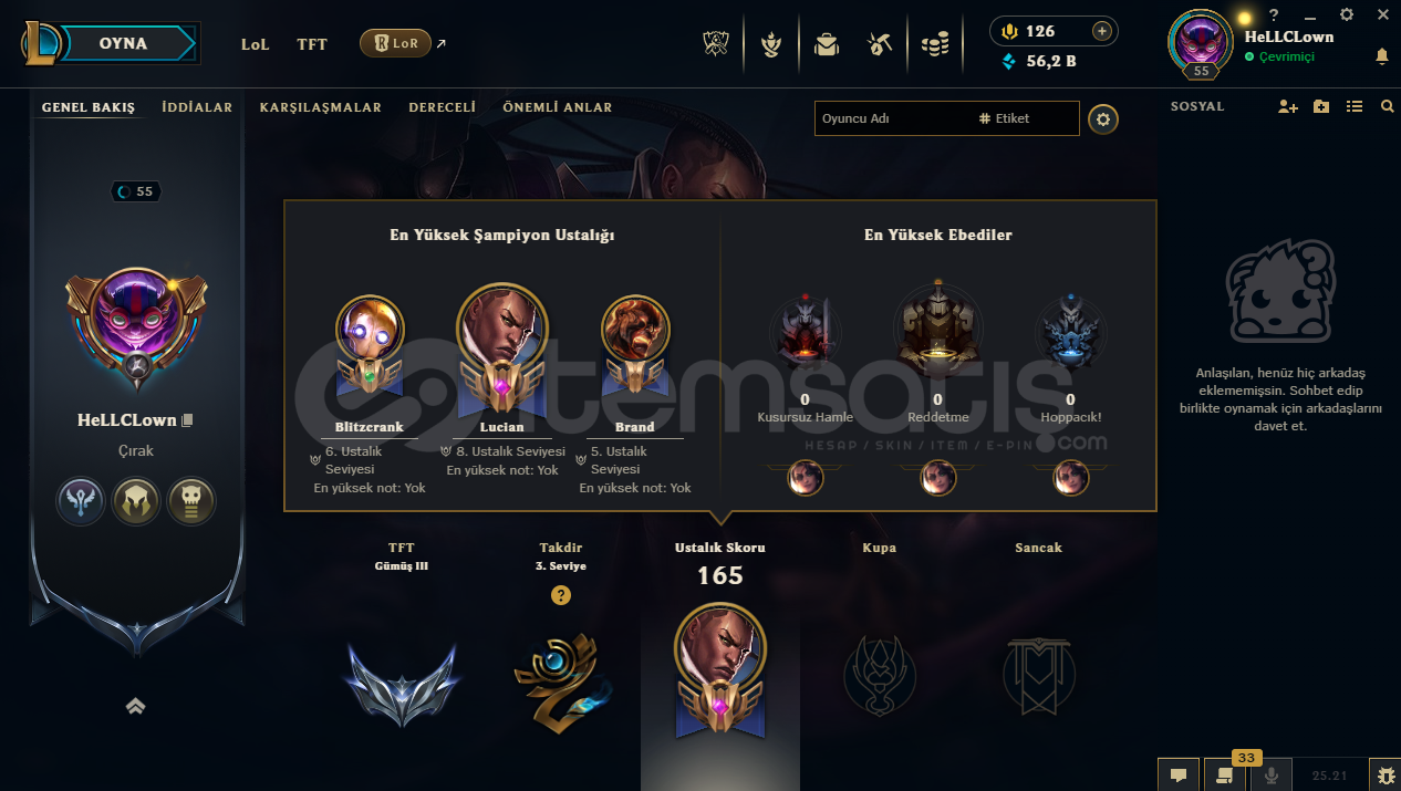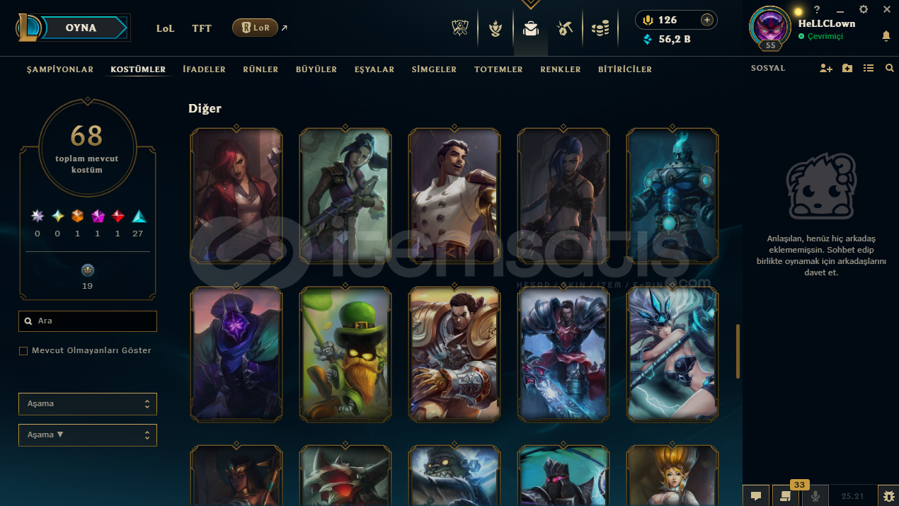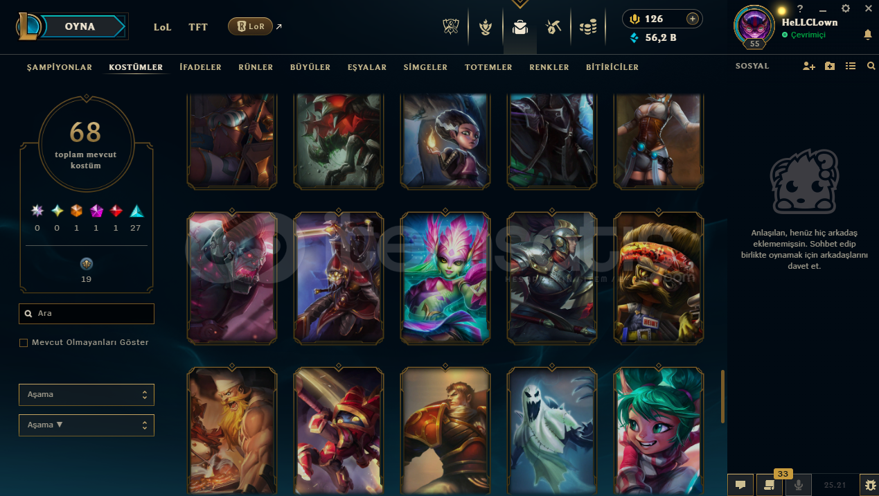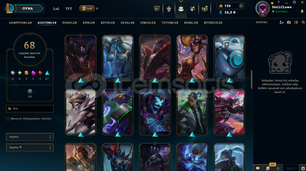 uygun bütçeli lol hesapları için profilime göz atabilirsinizhesap tr hesabıdır.hesabın maili değişmektedir.hesabın herhangi bir banı yoktur.hesap 3 takdir seviyesine sahiptir.hesabın clash numarası boştadır.hesapta 99 şampiyon, 68 kostüm, 56,231 mavi öz vardır.hesapta 1 ebedi, 1 ihtişamlı, 1 efsanevi, 27 destansı kostüm vardır.ekran kaydı aç...