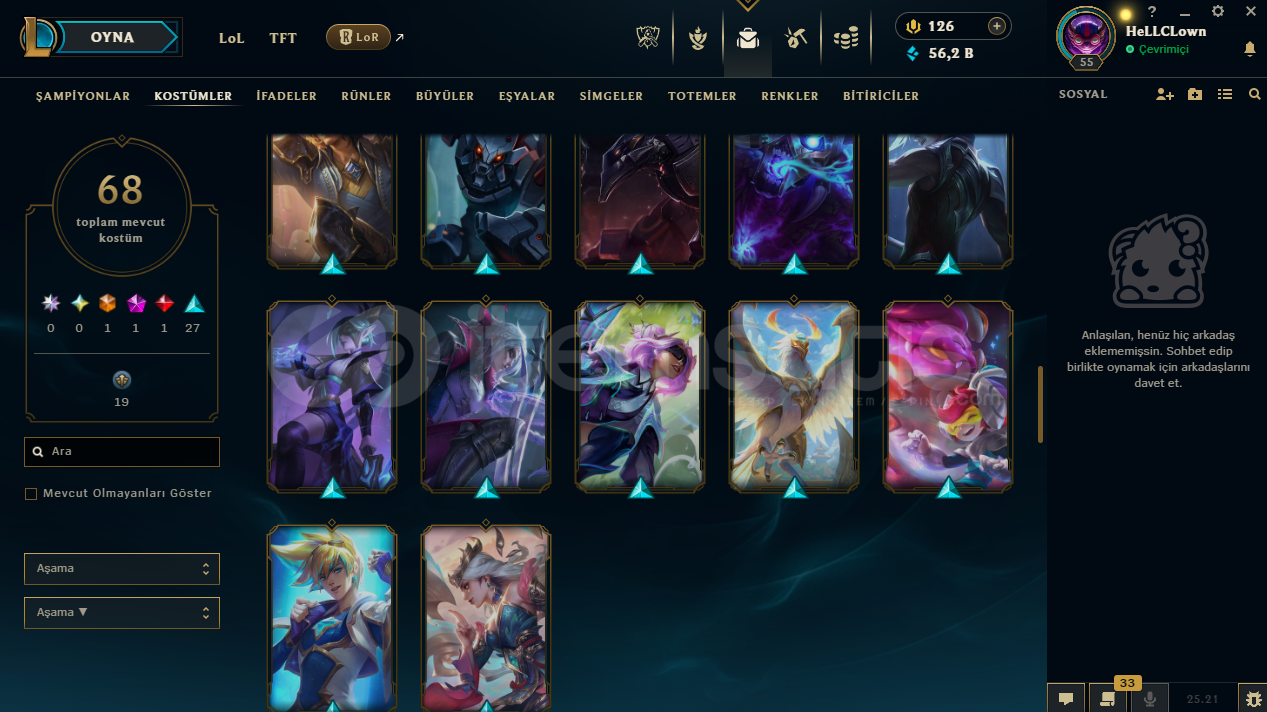 hesapta 99 şampiyon, 68 kostüm, 56,231 mavi öz vardır.