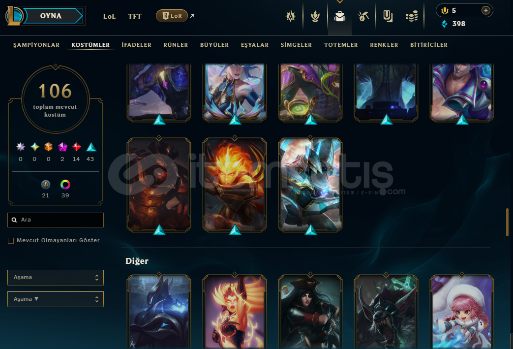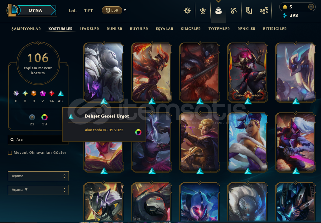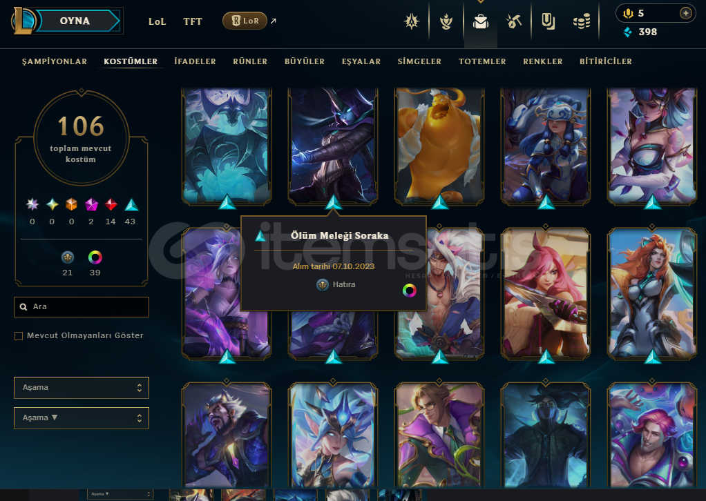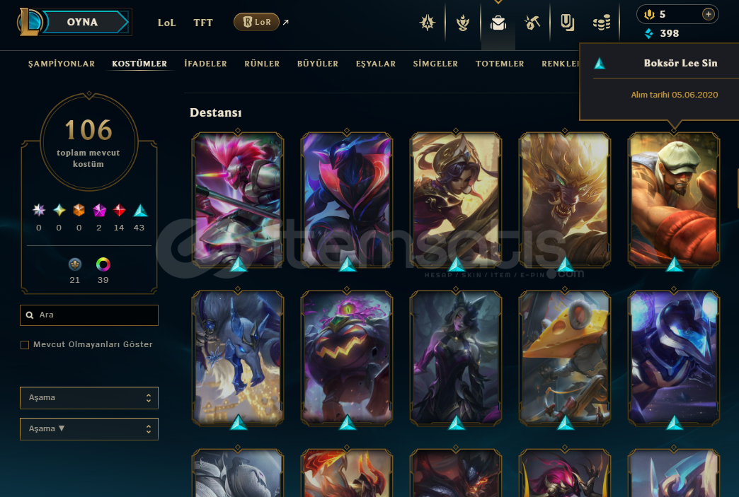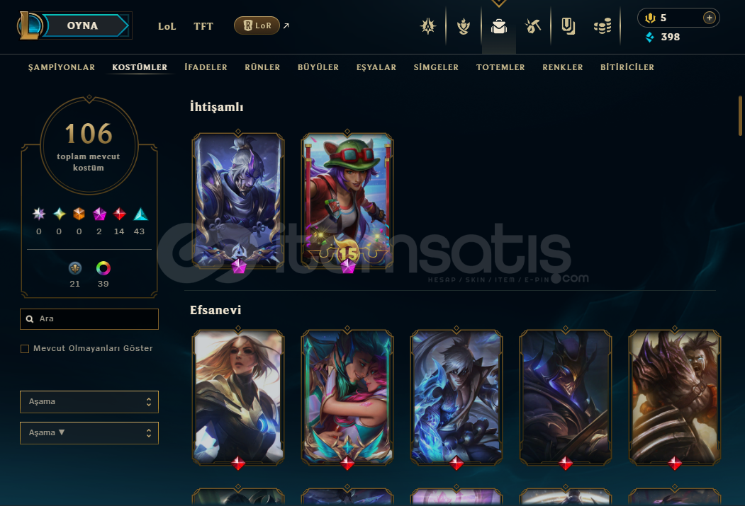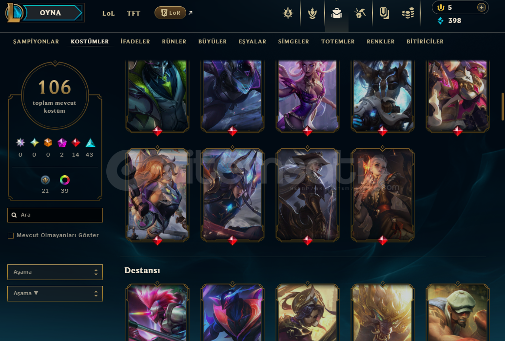 106 Kostümlü2 Prestij 14 Efsanevi 43 Destansı680K Zed ZED Leona Yasuo Katarina Lee sin 100k üstüGold 2 görmüş yüksek lp veren temiz güvenilir hesap334 lvldirKendi şahsi hesabım bir sorun çıkmaz güvenilir.Aklınıza takılan soru varsa yazabilirsinizAlınca bildirim düşer hemen bakarım