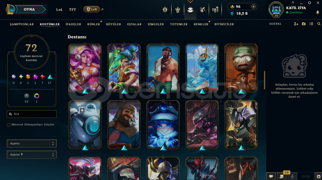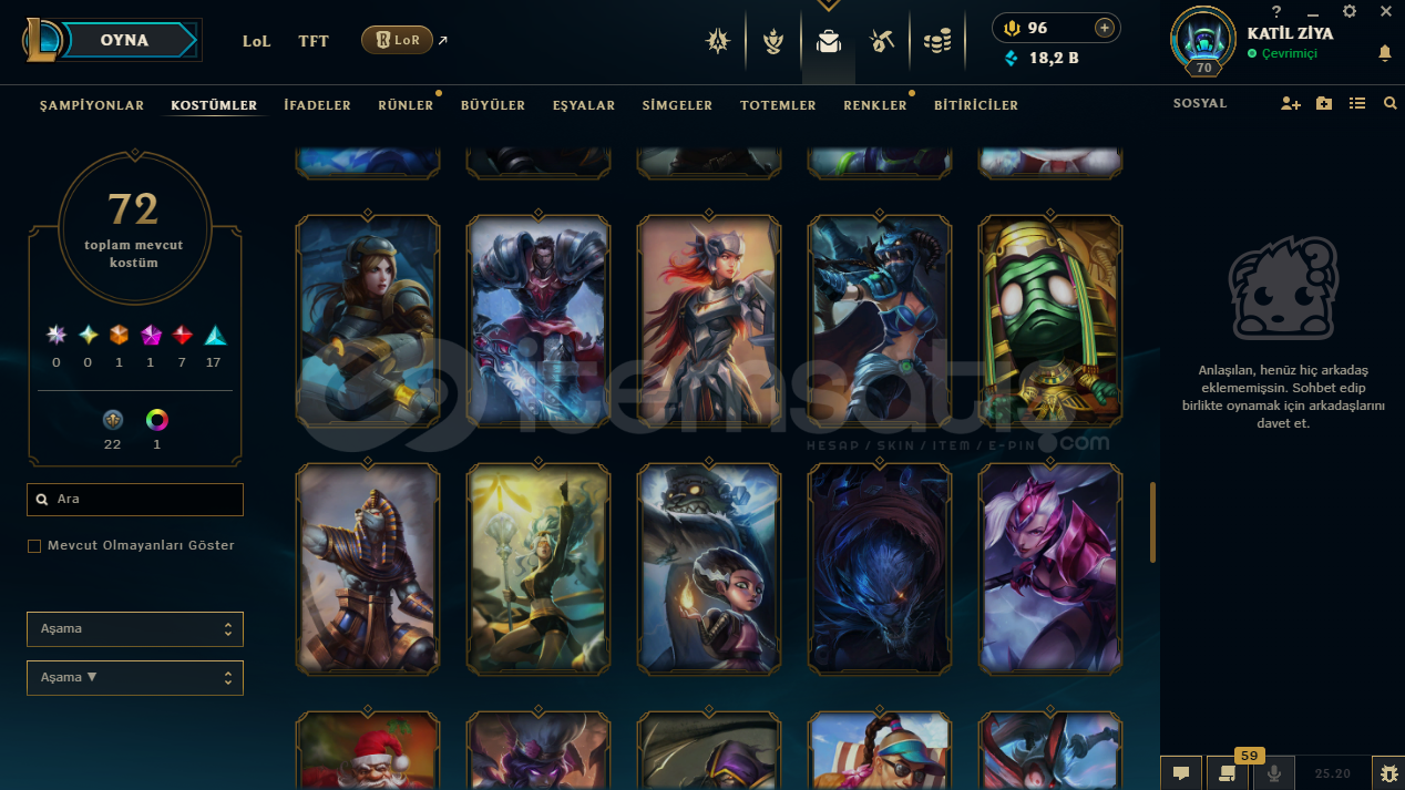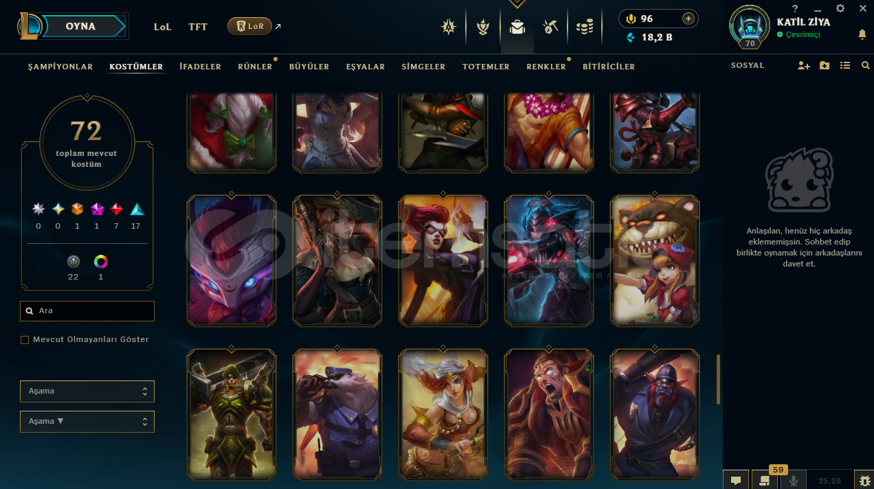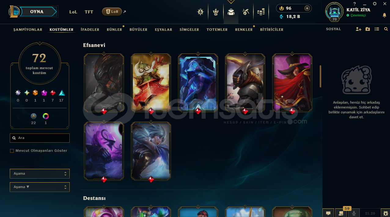 uygun bütçeli lol hesapları için profilime göz atabilirsinizhesap tr hesabıdır.hesabın maili değişmektedir.hesabın herhangi bir banı yoktur.hesap 3 takdir seviyesine sahiptir.hesapta 125 şampiyon, 72 kostüm, 18,211 mavi öz vardır.hesapta 1 ebedi, 1 ihtişamlı, 7 efsanevi, 23 destansı kostüm vardır.ekran kaydı açmayı unutmayınız.