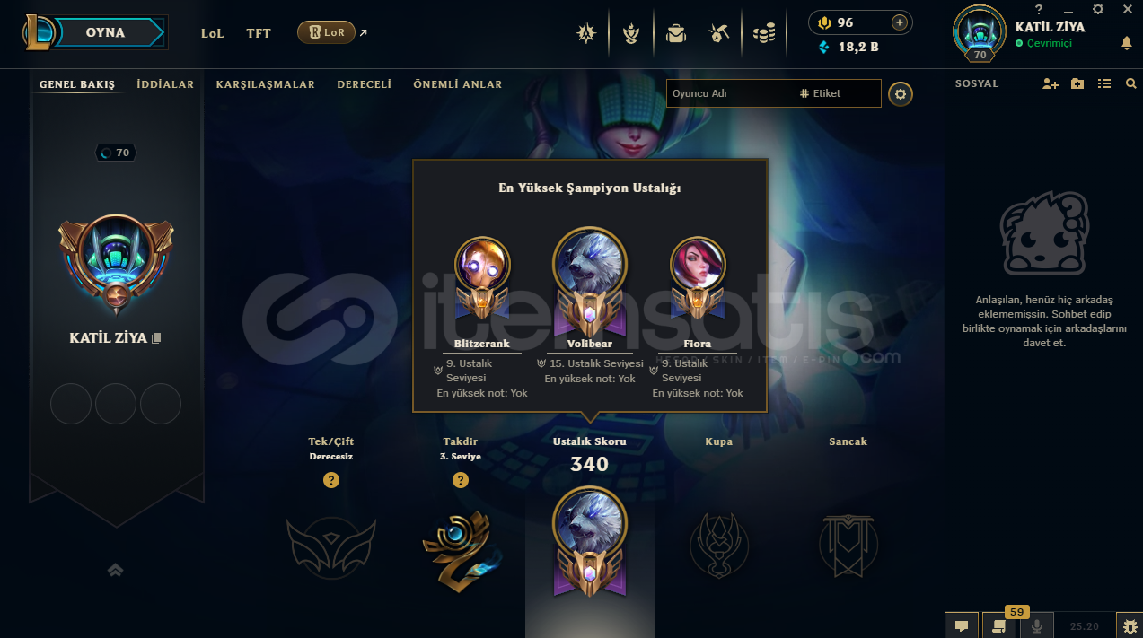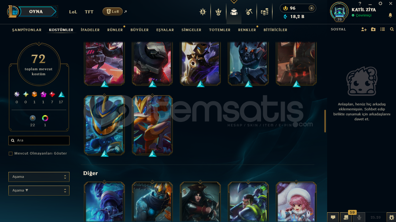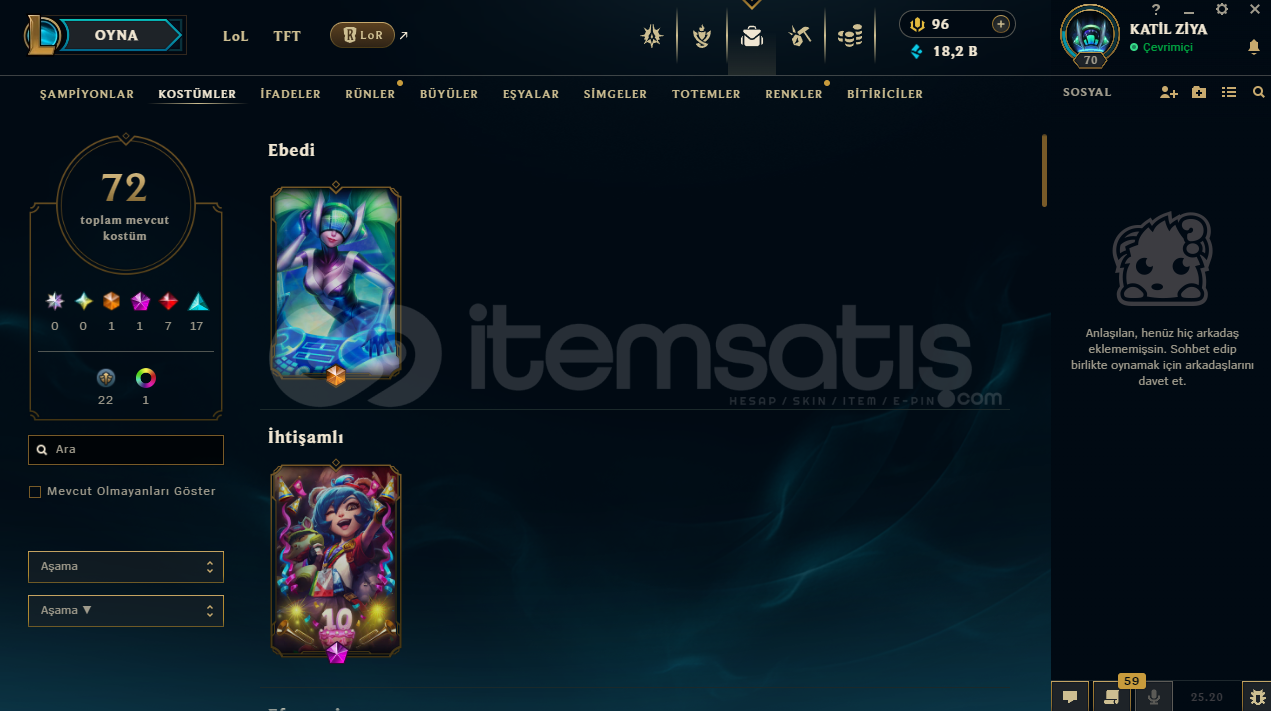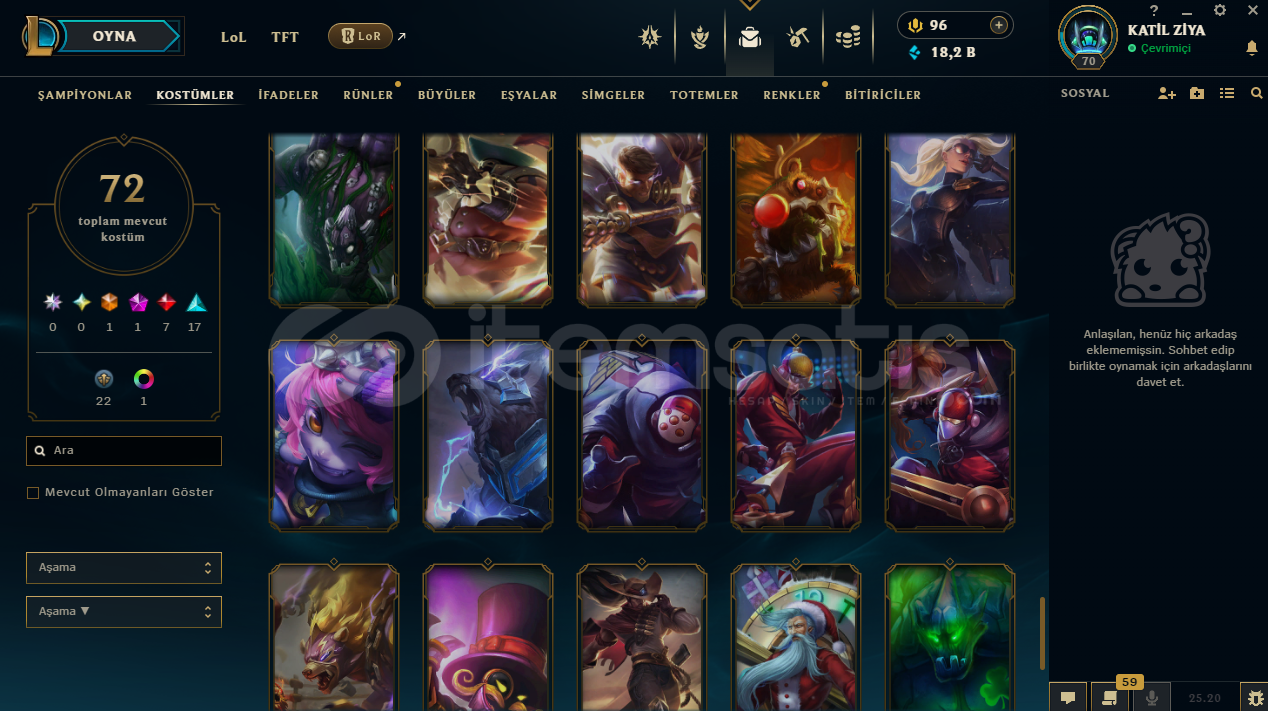 uygun bütçeli lol hesapları için profilime göz atabilirsinizhesap tr hesabıdır.hesabın maili değişmektedir.hesabın herhangi bir banı yoktur.hesap 3 takdir seviyesine sahiptir.hesapta 125 şampiyon, 72 kostüm, 18,211 mavi öz vardır.hesapta 1 ebedi, 1 ihtişamlı, 7 efsanevi, 23 destansı kostüm vardır.ekran kaydı açmayı unutmayınız.