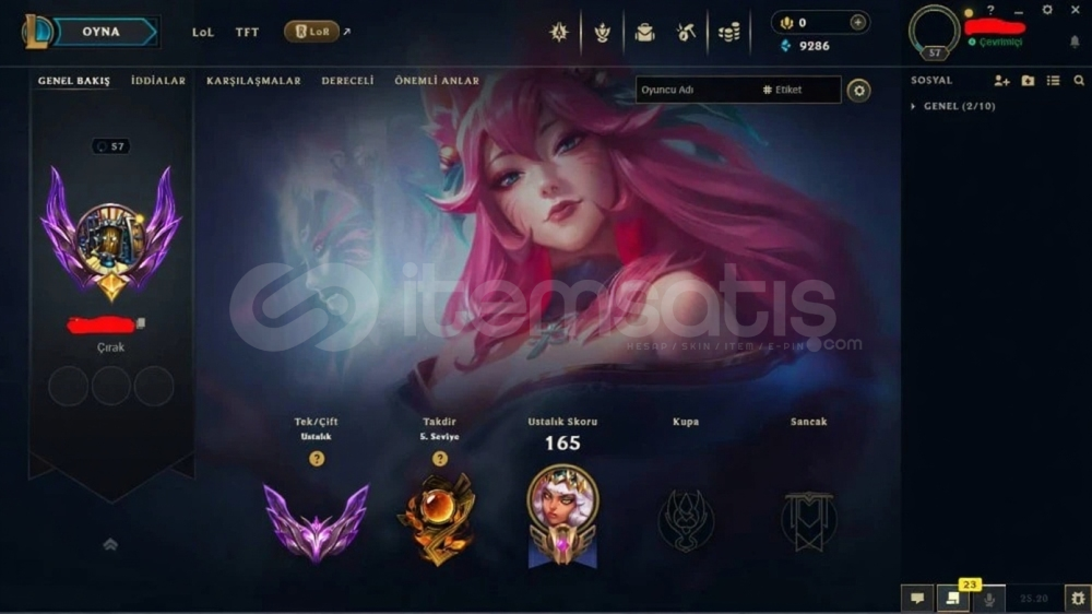 Hesabın içerisinde 20 skin mevcut, 57 seviye'dir.Qiyanayla 70 WR i var.Takdiri 5. seviyedir.Mobil doğrulama yapılmadı.