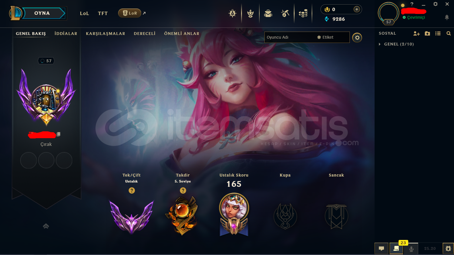 Hesabın içerisinde 20 skin mevcut, 57 seviye'dir.Qiyanayla 70 WR i var.Takdiri 5. seviyedir.Mobil doğrulama yapılmadı.