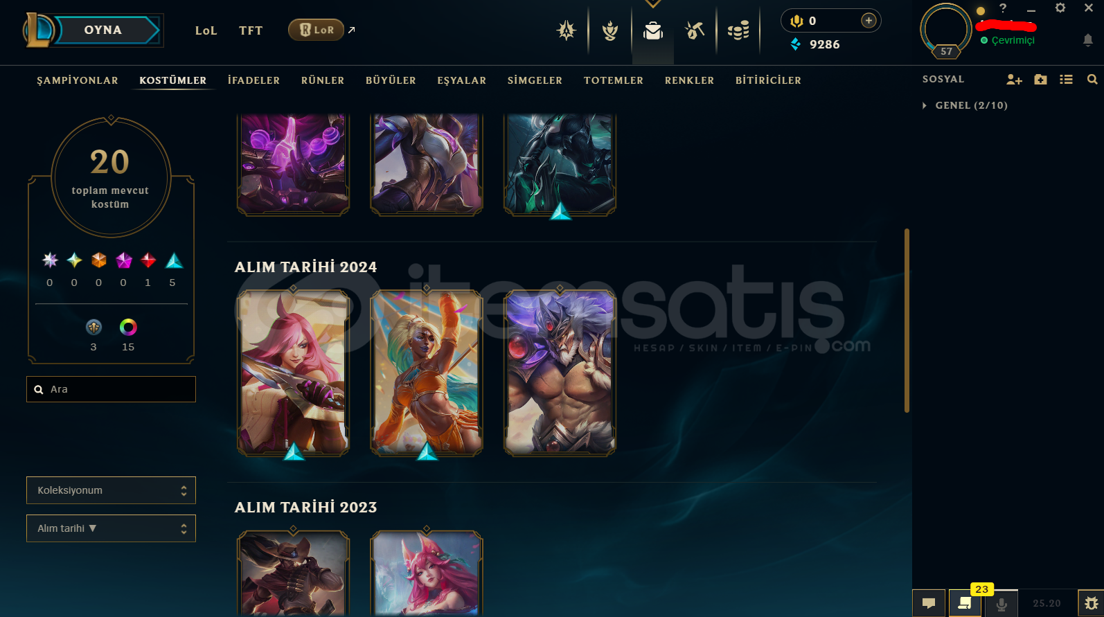 Hesabın içerisinde 20 skin mevcut, 57 seviye'dir.