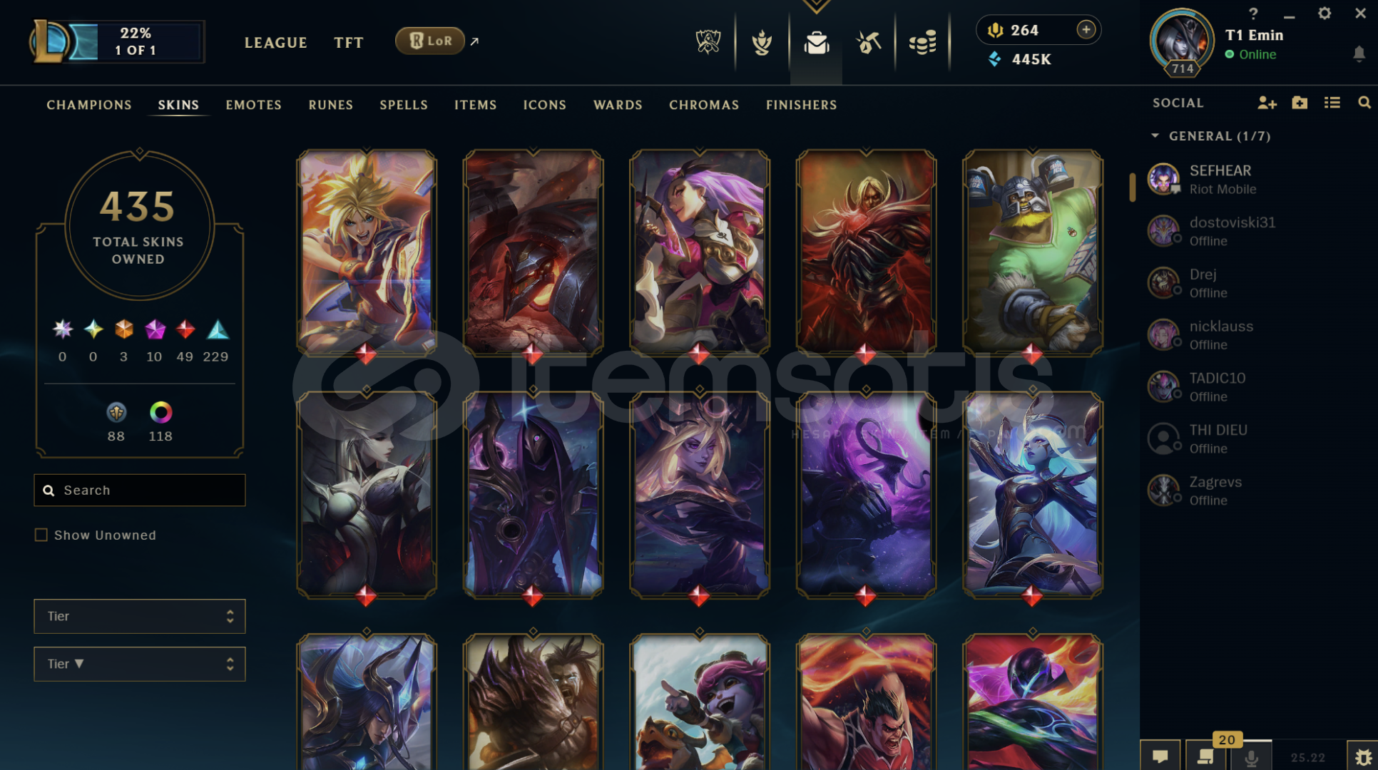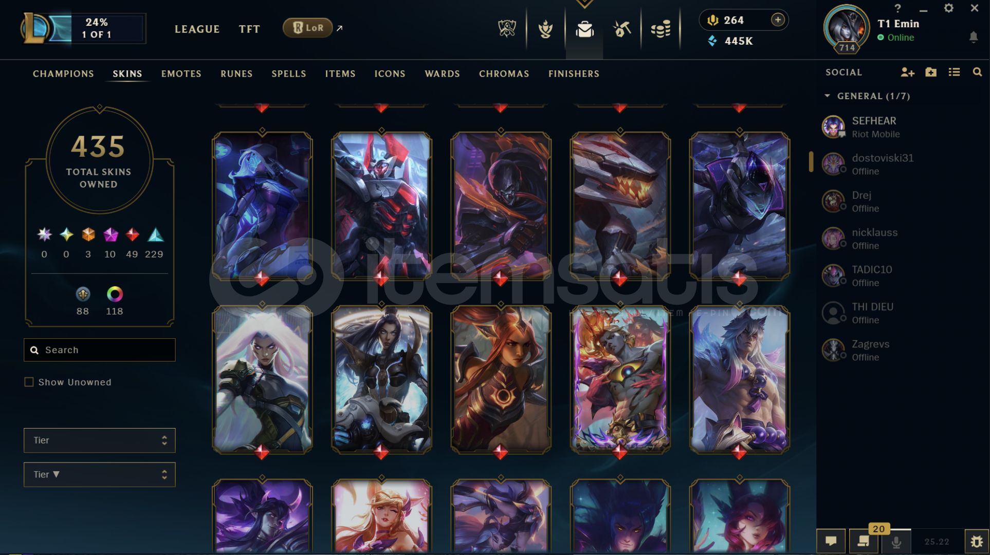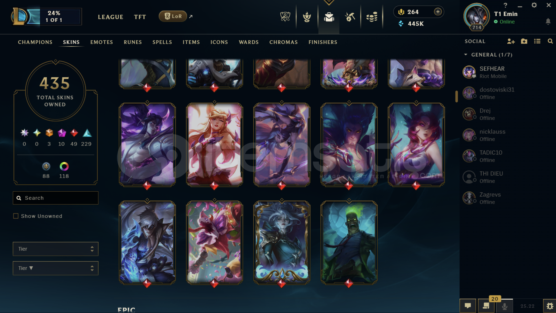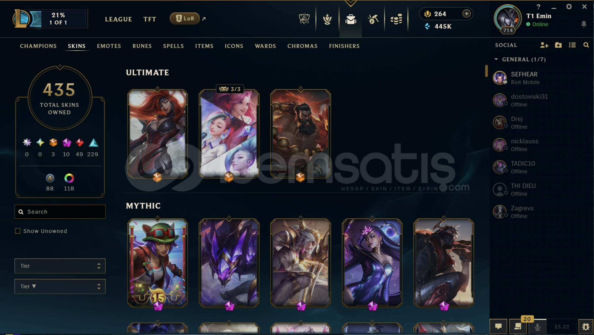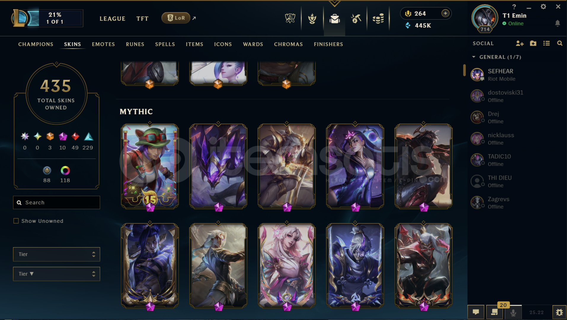 Hesapta bir çok kostüm vardır Diananın tüm kostümleri açıktır. 445K Mavi öz ve ganimette 70 tane Kostüm vardır hepsi en az 1350 değerinde 2500 turuncu öz bulunmakta. Hesapta 118 Kostüm Rengi , 41 tane Totem Görünümü , 323 Simge vardır.