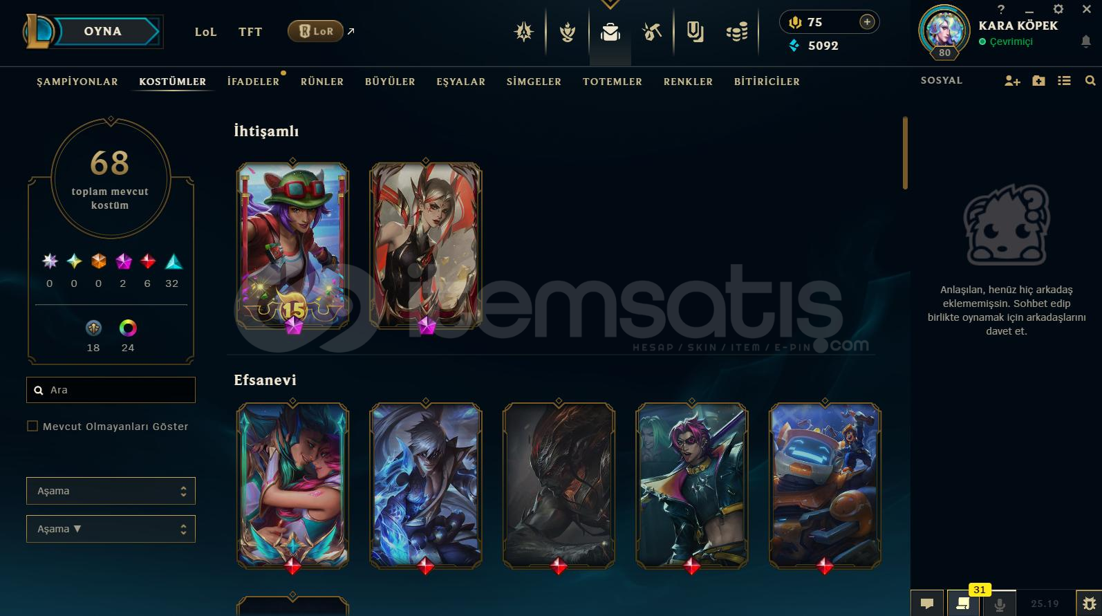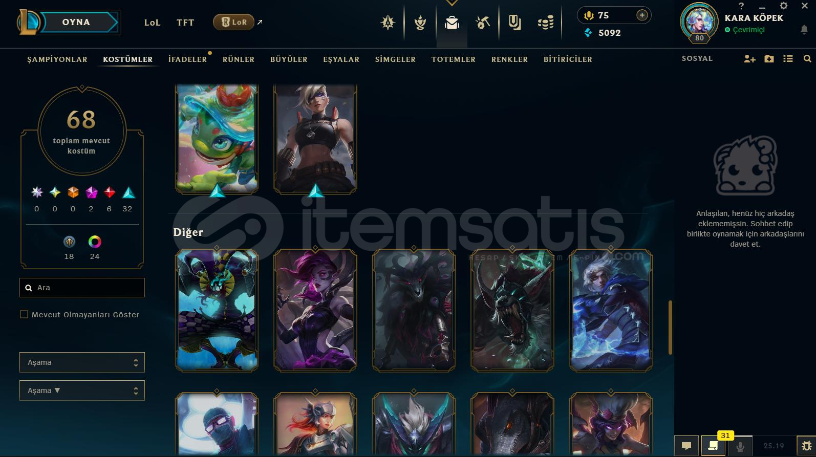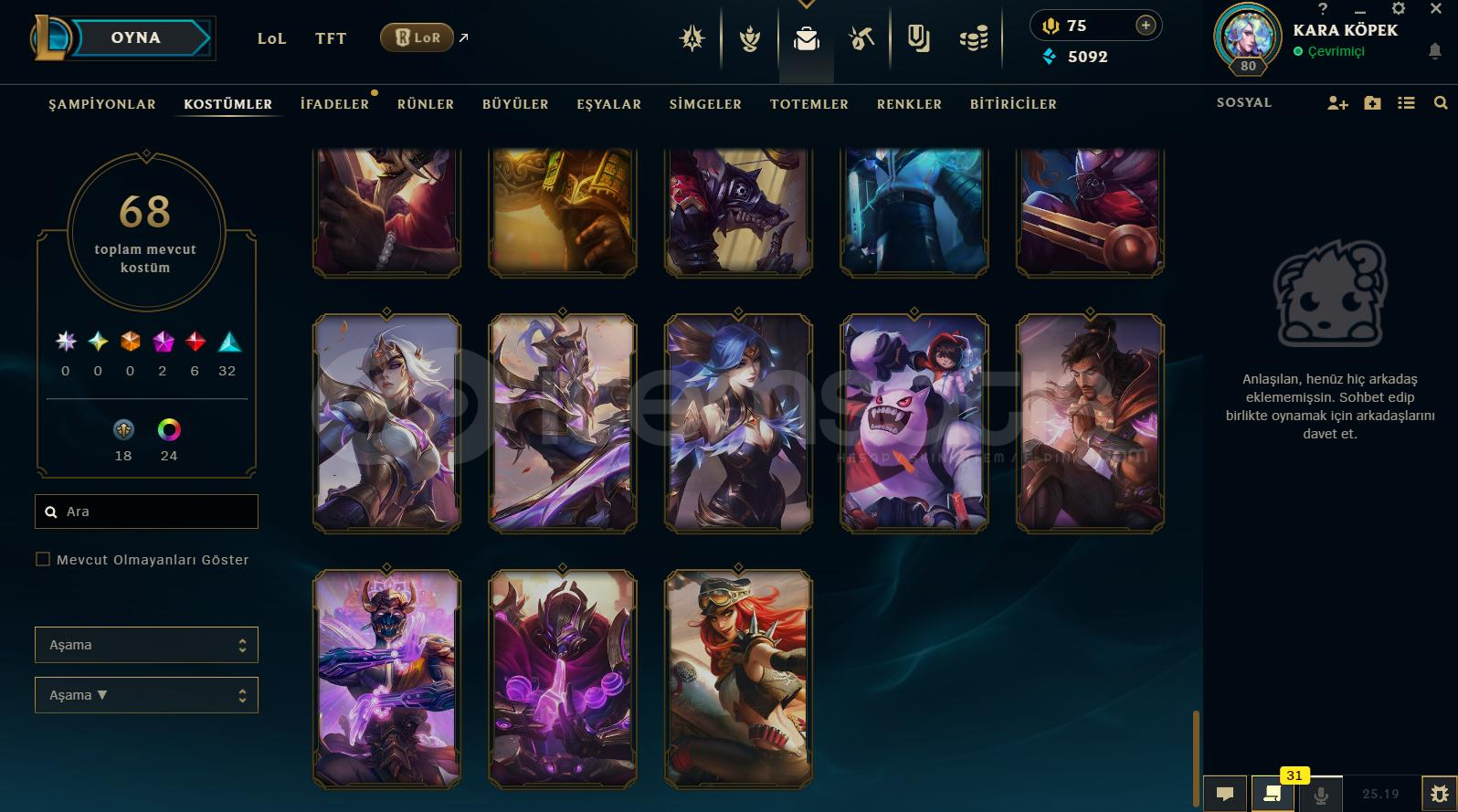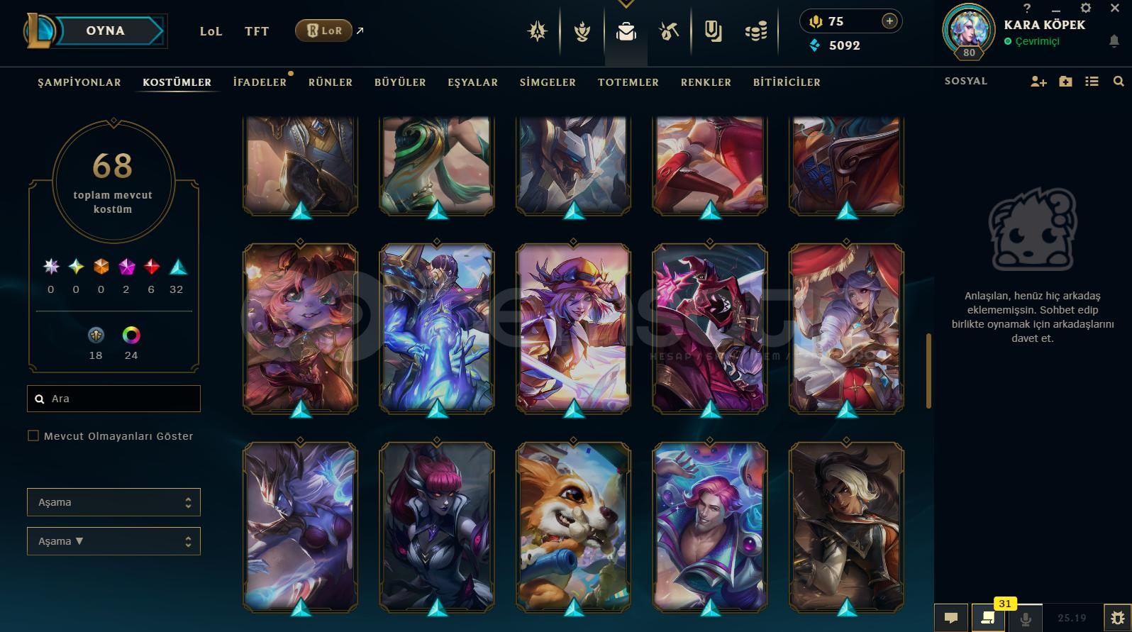 Hesap Hakkında Detaylı Bilgiler:⭐️ Rank Platin ⭐️ Toplam 68 Kostüm Vardır⭐️ +100 Açık Şampiyon Vardır⭐️ Mail Değişiyor⭐️ TR Kurulumludur⭐️ 80 LeveLdir⭐️ 5092 Mavi Öz 75 RP Mevcuttur⭐️ Esneği Golddur⭐️ İsim Değiştirme Hakkı VardırBe...