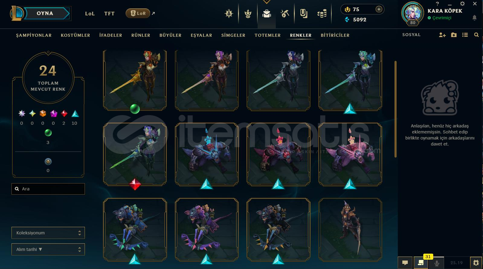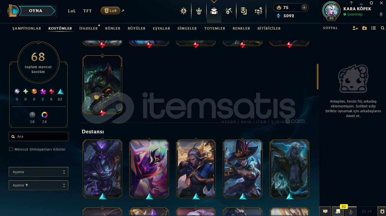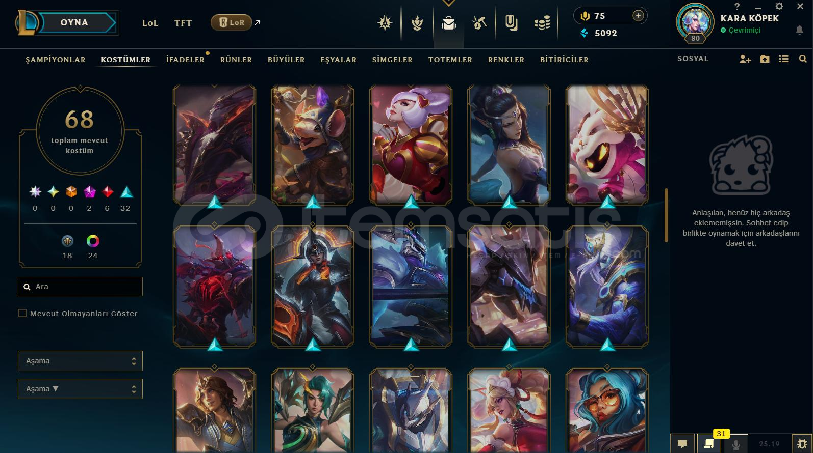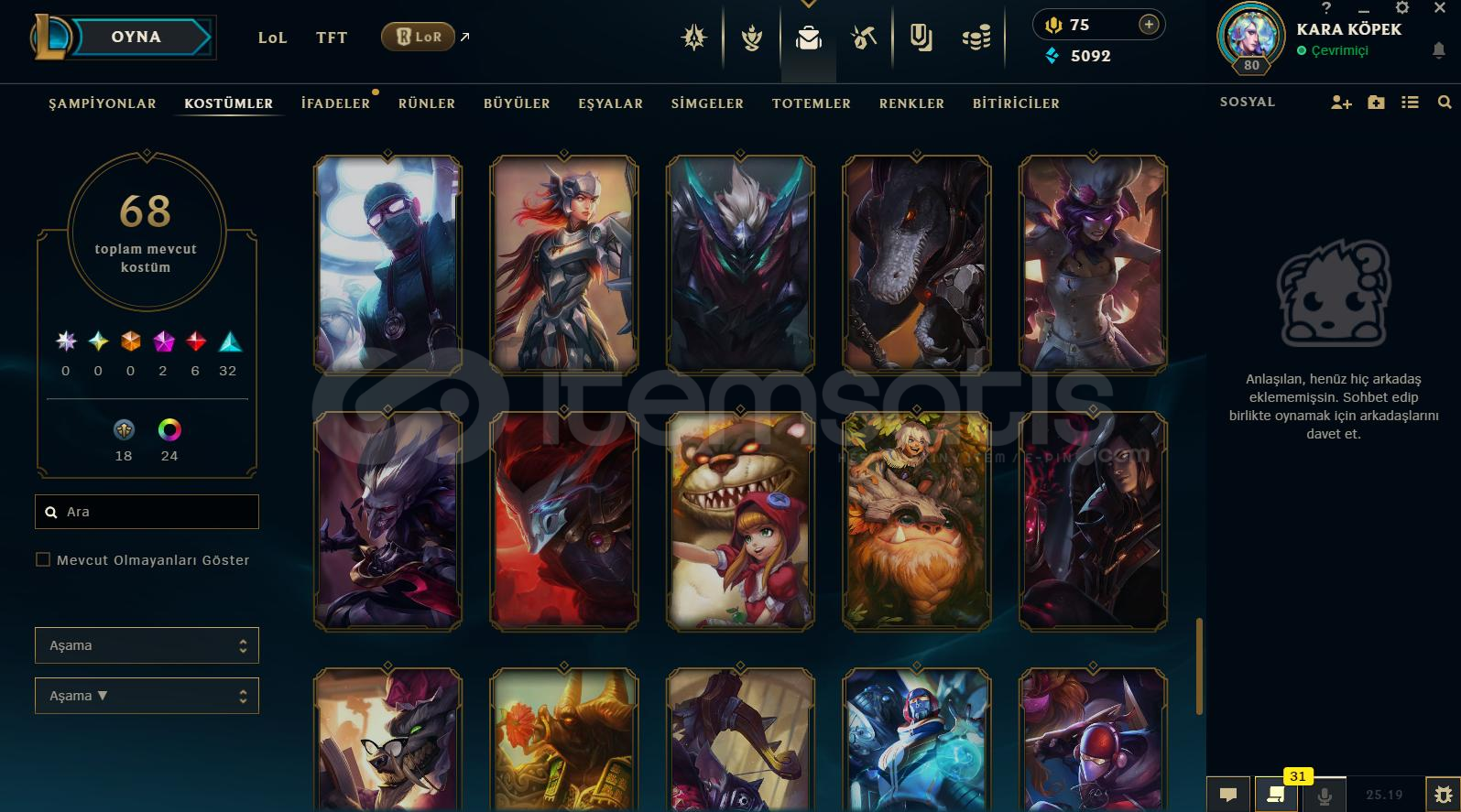 Hesap Hakkında Detaylı Bilgiler:⭐️ Rank Platin ⭐️ Toplam 68 Kostüm Vardır⭐️ +100 Açık Şampiyon Vardır⭐️ Mail Değişiyor⭐️ TR Kurulumludur⭐️ 80 LeveLdir⭐️ 5092 Mavi Öz 75 RP Mevcuttur⭐️ Esneği Golddur⭐️ İsim Değiştirme Hakkı VardırBe...