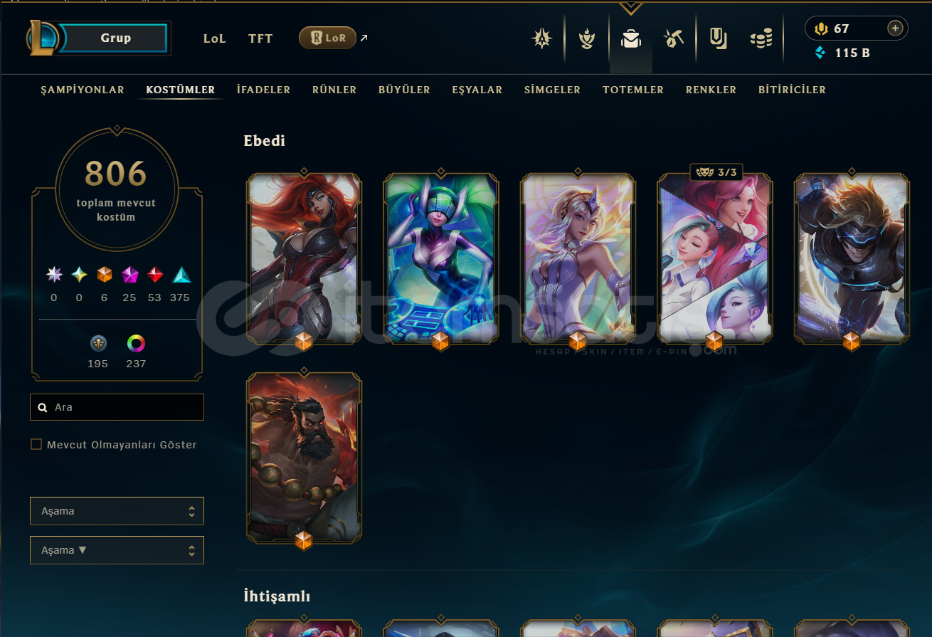 Merhabalar öncelikle hesabımda 805 kostüm ve her biri birbirinden değerli kostüm vardır Tft hesabı da oldukça doludur hesabın mmr yüksektir 20 winde zümrüt 4 ihtiyaçtan dolayı satıyorum hesaba bu zamana kadar 45.000 tl den fazla yatırdım hesap 2016 yılında kurulmuştur hesap full herodur ve içerisinde 115k mavi öz vardır