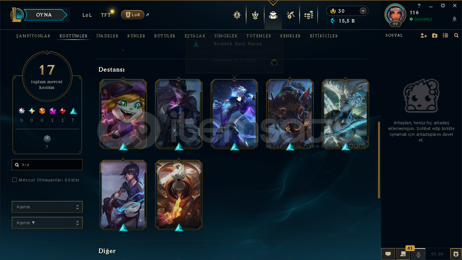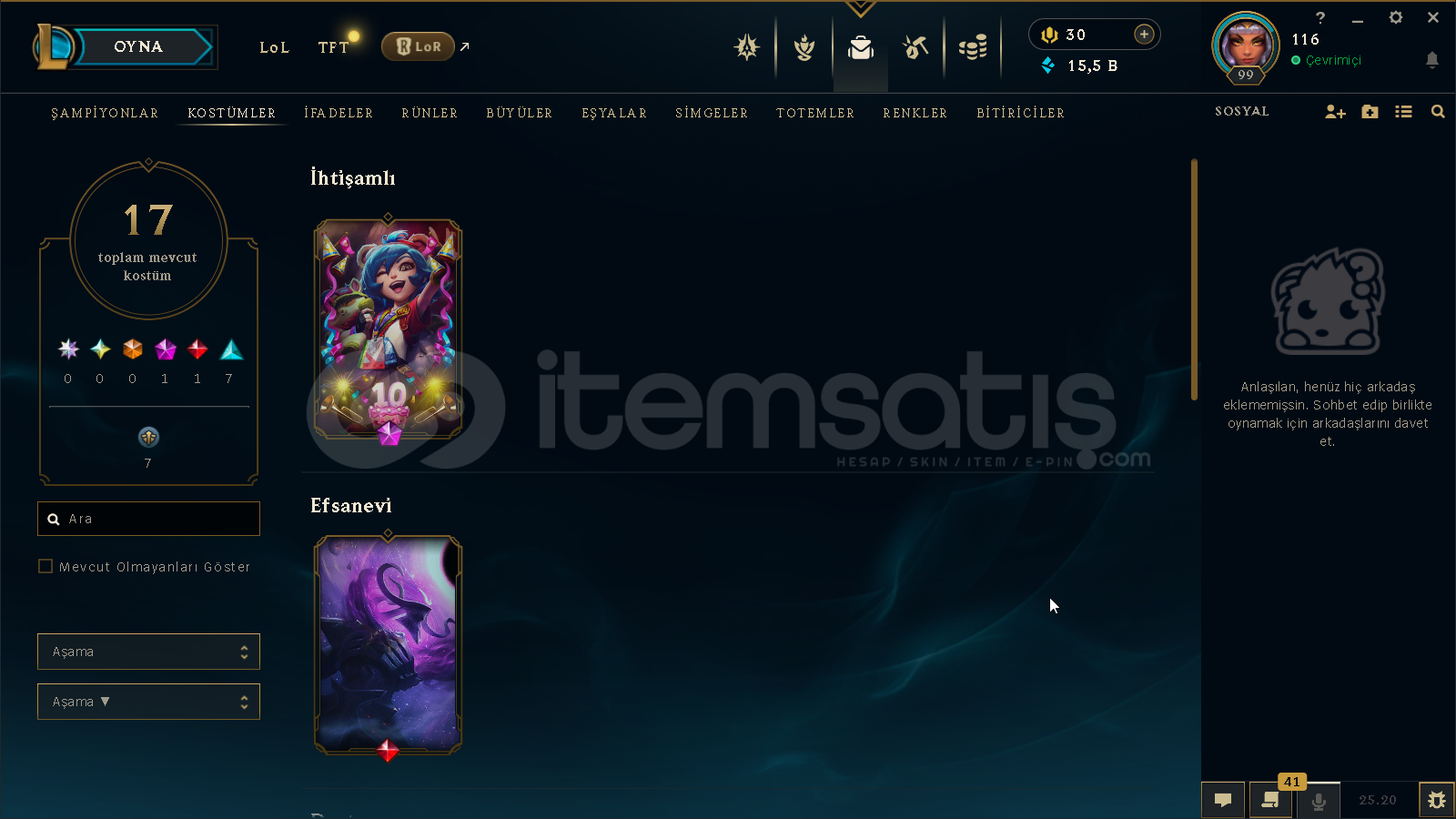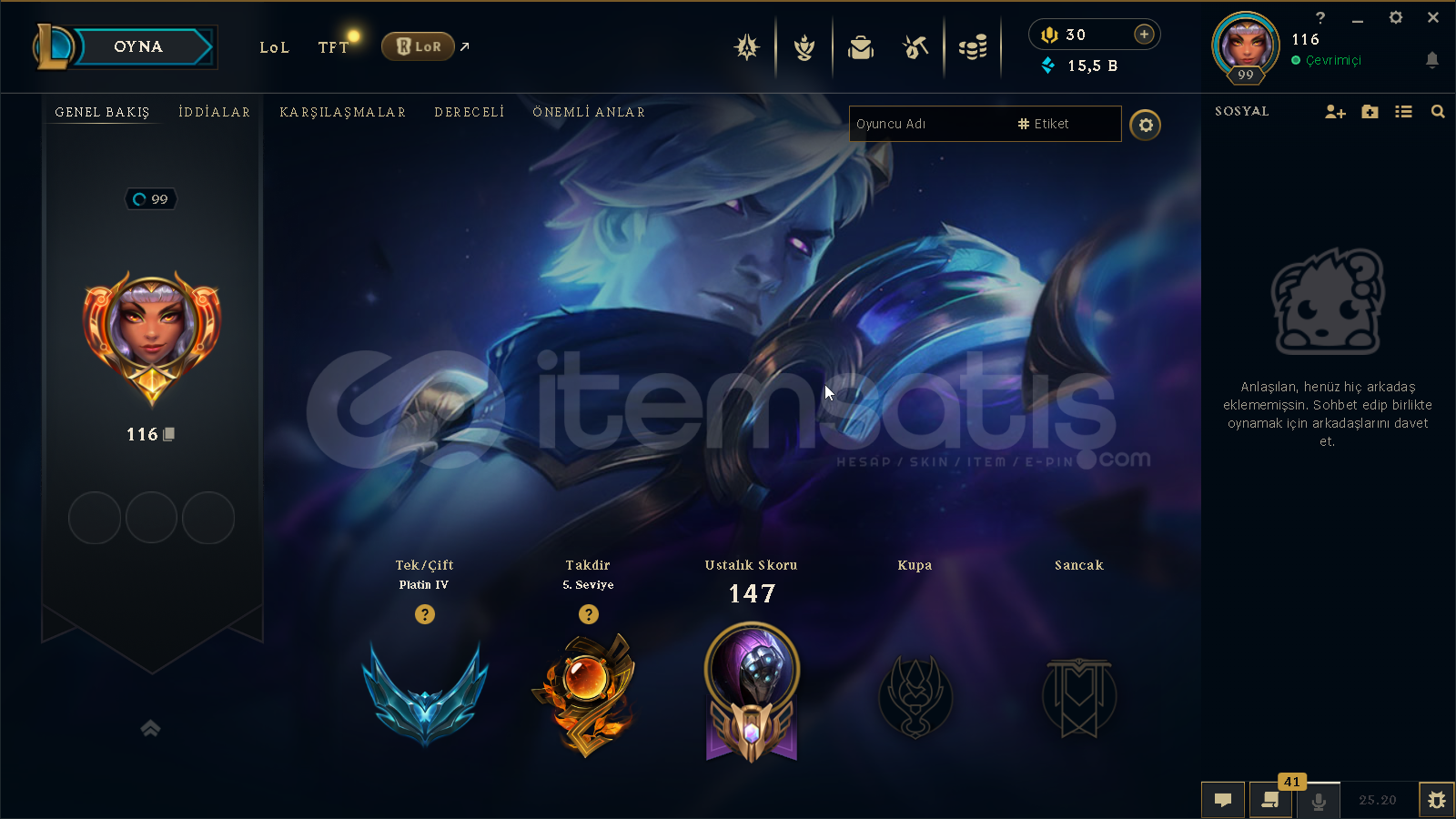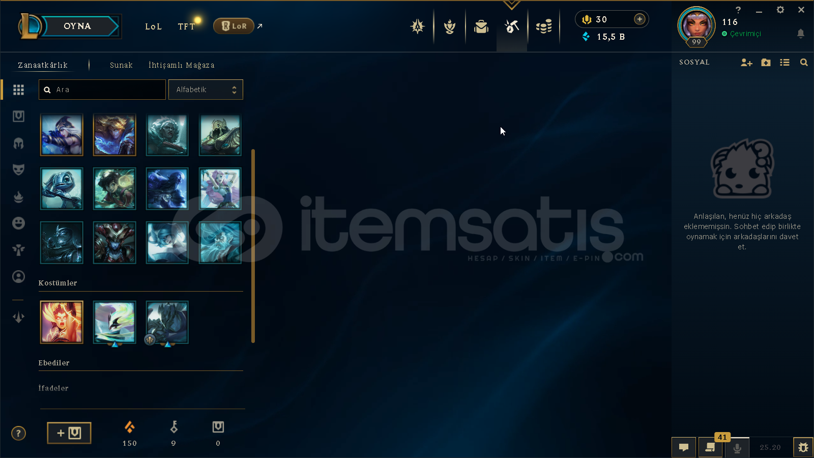 hesap olusumu tr 85 wr yüksek mmr 15k mavı öz + ganımet 30 k ya yakın 3 tane ganımette kostum var jhın kayle ve zyra kostumlerı mevcut onun dısında hesap yüksek elo yüksek wr ile kasmak isteyenler kaçırmasın otomatık teslımattır mail degişimi olucaktır