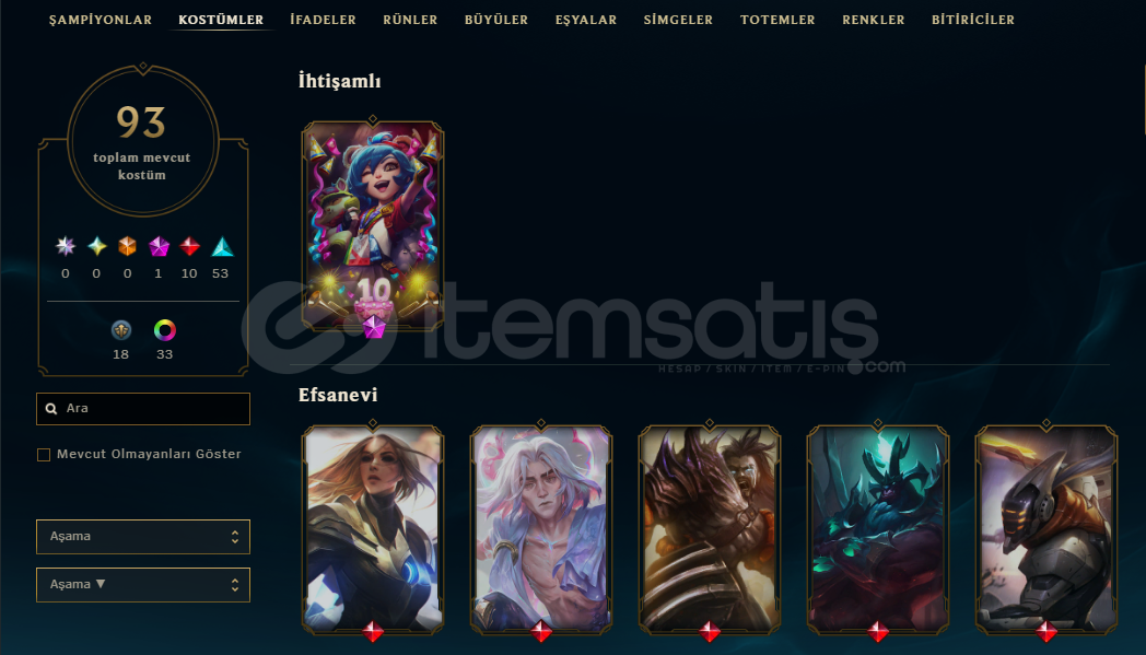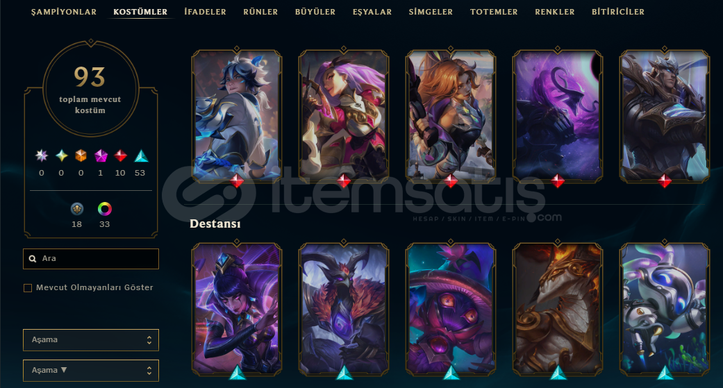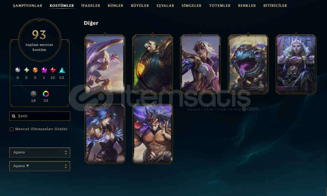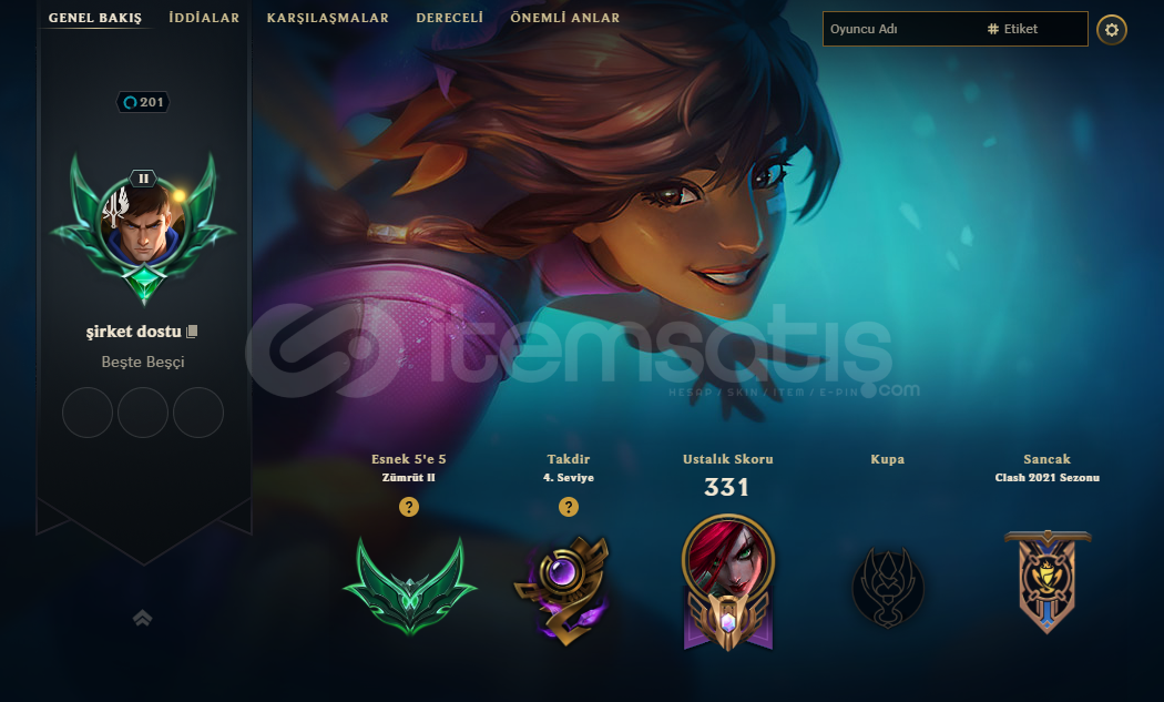 Genel Hesap BilgileriSeviye = 201Kostüm = 93Renk = 33İfade = 123Simge = 184Totem = 31Şampiyon = 159Mavi Öz = 11binRP = 372İade Hakkı = 3Takdir Seviyesi = 4Lig BilgileriAnlık Soloq-Flex = EmeraldS13 Solo/Duo = Diamond***Tek/Çiftte %60 wr'i var lp gaini çok iyi.***Hesapta hiç ban yenmedi takdir seviyesi hep yüksekti uyarı bile almadı.*****Hesap hakkında detaylı bilgi isterseniz Discord : qeonidas