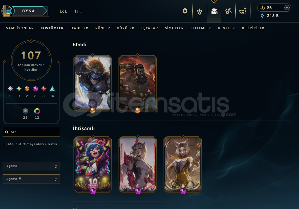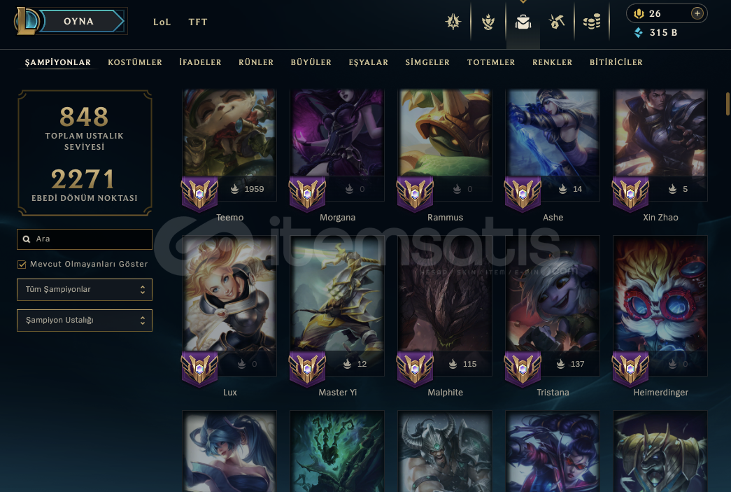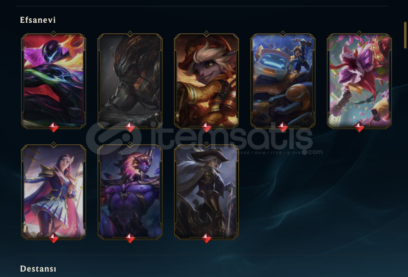 Yıllardır tek elden oynanmış hesabımı satıyorum. Tüm herolar açık. 300K mavi öz 3.6M Teemo. 1.4M Morgana 500K Rammus ve başka oynanmış pek çok hero. 36 destansı8 efsanevi3 destansı2 ebedi25 hatıra kostüm205 ifade