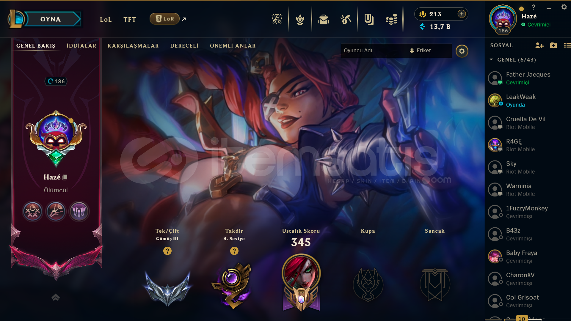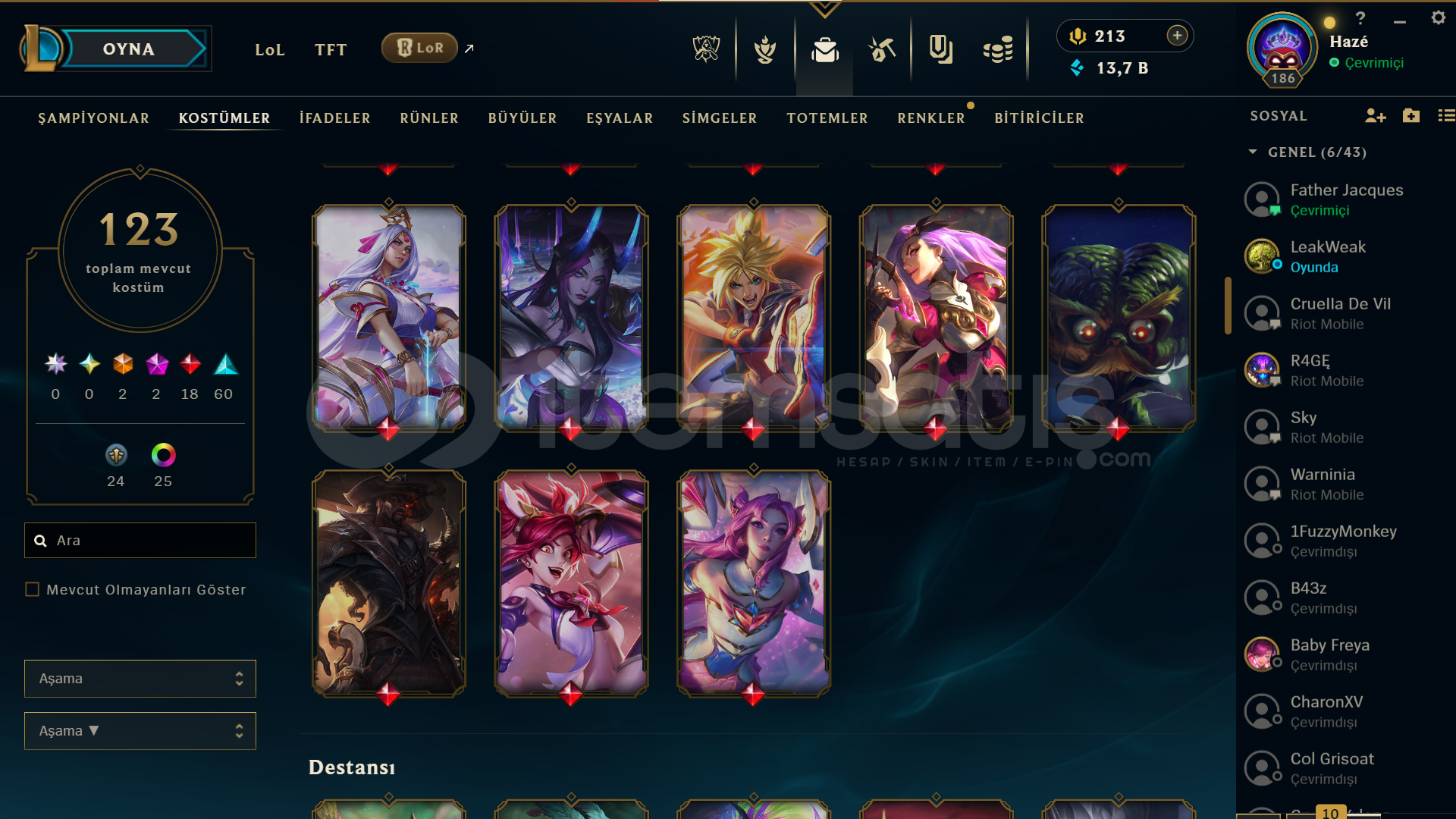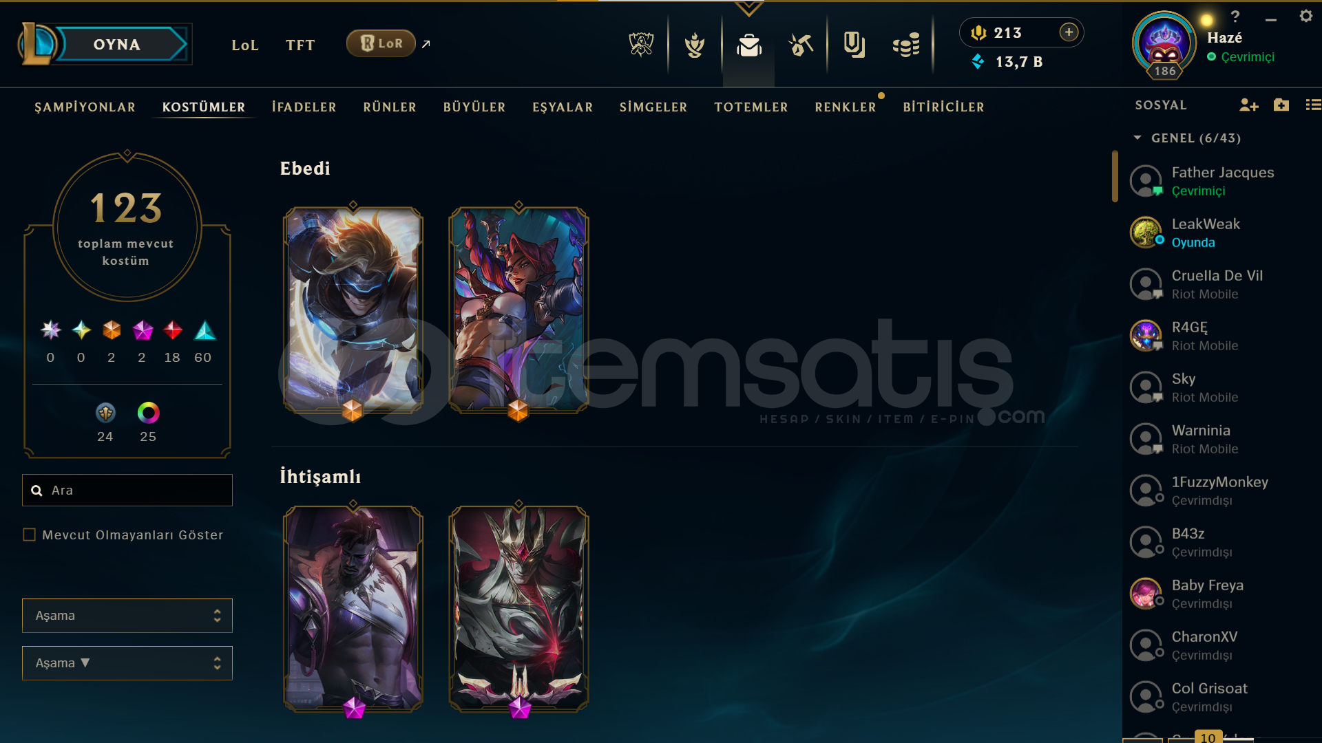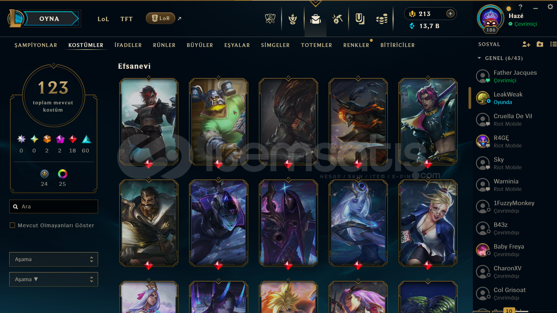 123 SKİN TÜM HEROLAR AÇIK 2 EBEDİ 2 İHTİŞAMLI 18 EFSANEVİ KOSTÜM VE RENKLER MEVCUT +38 LP GELİYOR EU W DEN AKTARDIM HESABIN KENDİ SAHİBİYİM FAZLALIK DİYE SATIŞTA İLGİLENENLER BUGÜN YARIN SATILIR