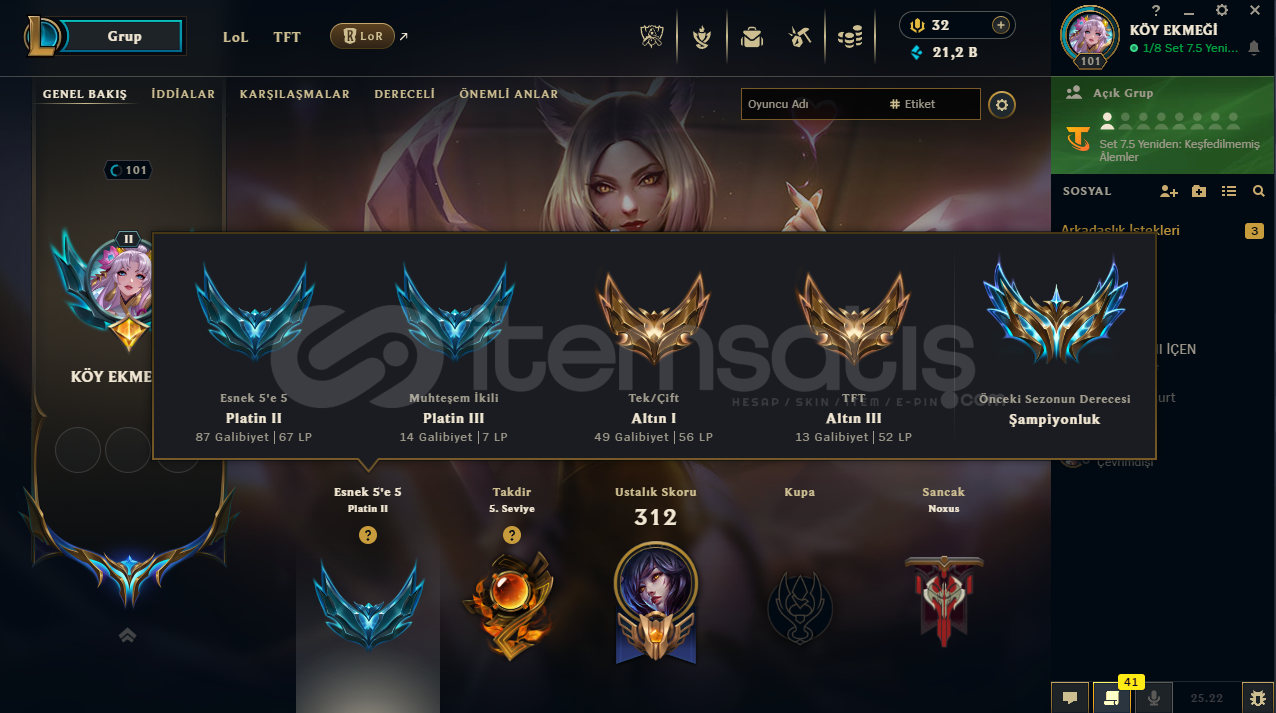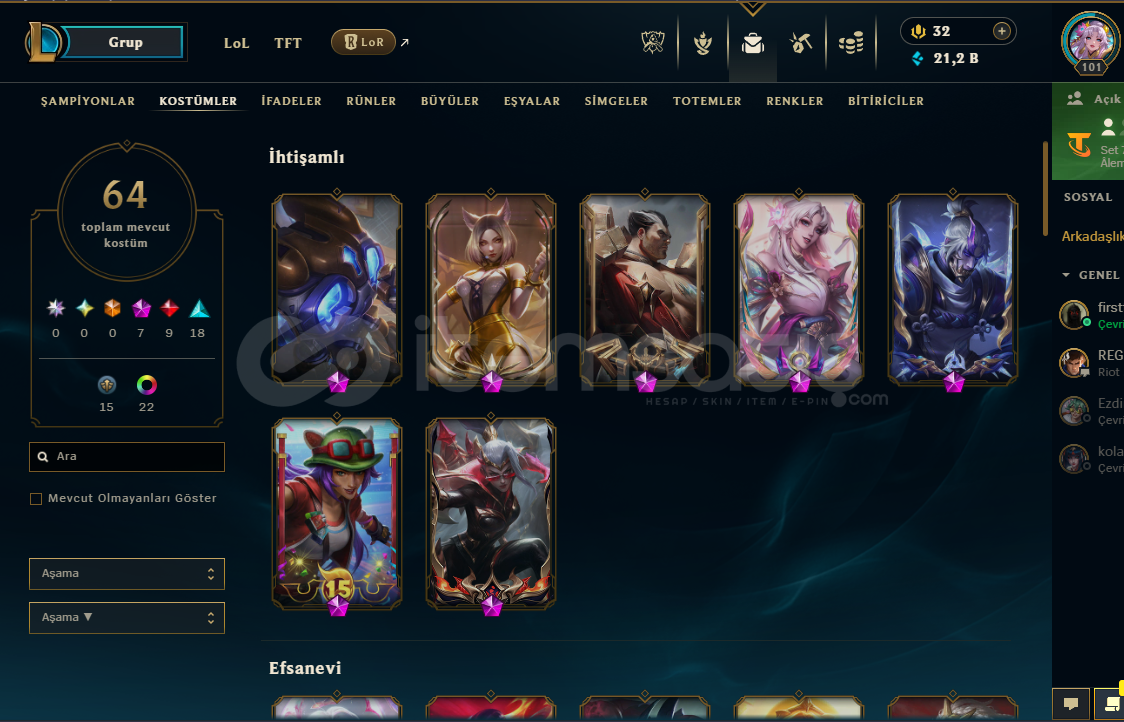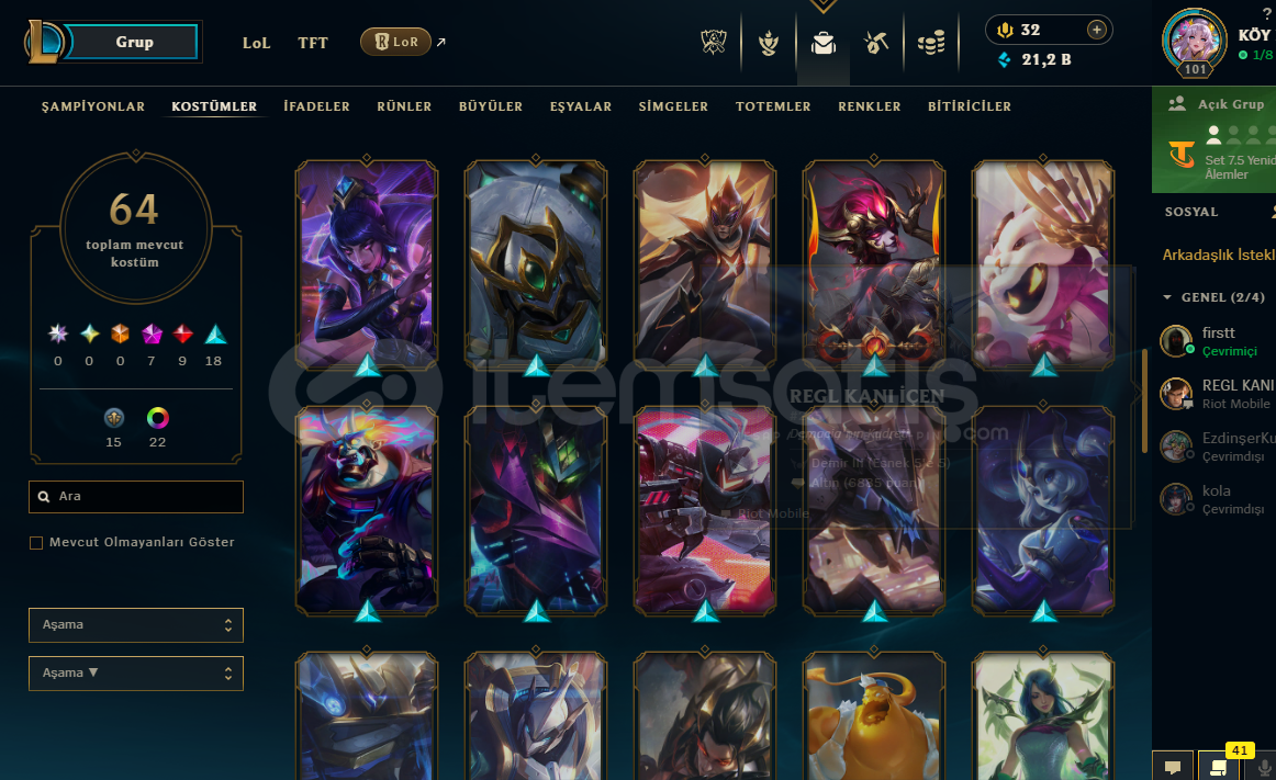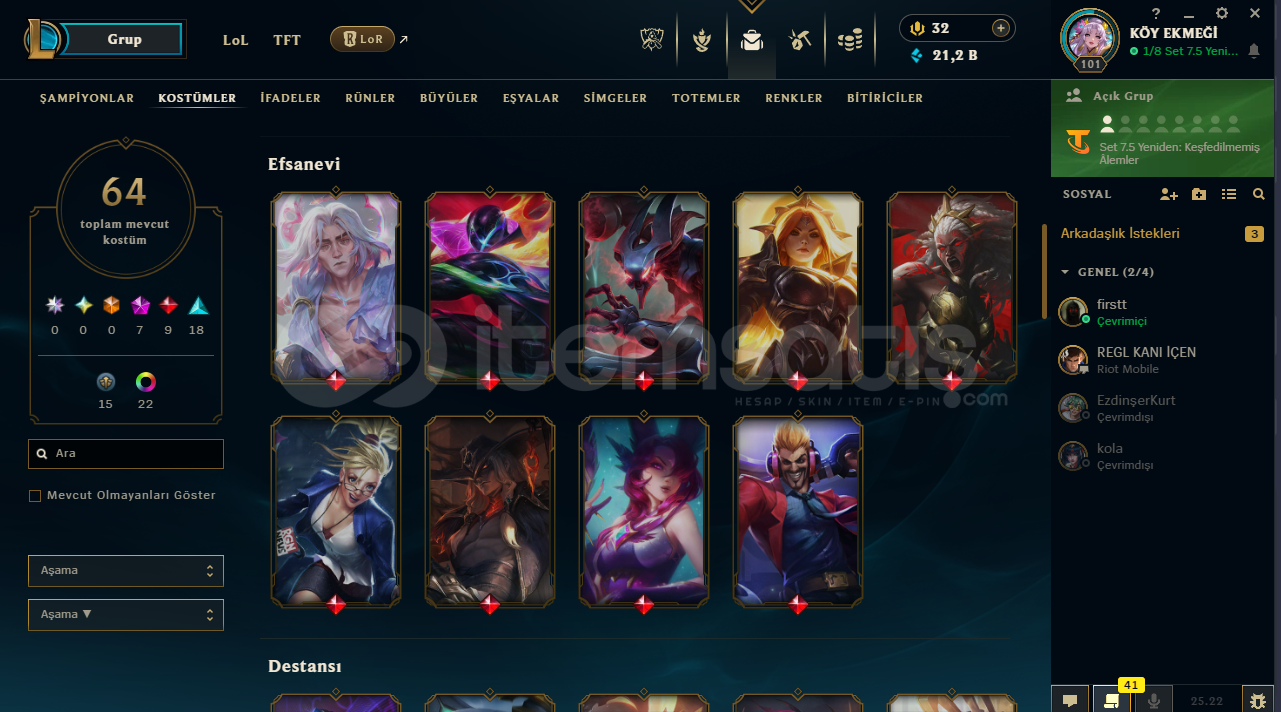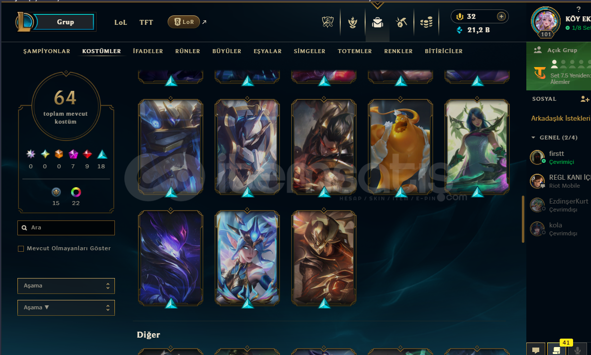 TFT Strateji ustaları satın alınmıştır: Chibi AAtrox - Chibi Akali - Chibi Kaisa - Chibi Lux - Chibi Miss Fortune - Chibi SettValorant Hesabında : Ayıcık spreyi mevcut :) (Birdaha Gelmeyecek)Kostüm Sayısı:64Mavi öz : 21 kŞampiyon sayısı: 147İfade sayısı : 81Simge sayısı: 105Güzel kostümlü kız hesabı alıcısına hayırlı olsun :)Mail devri yap...