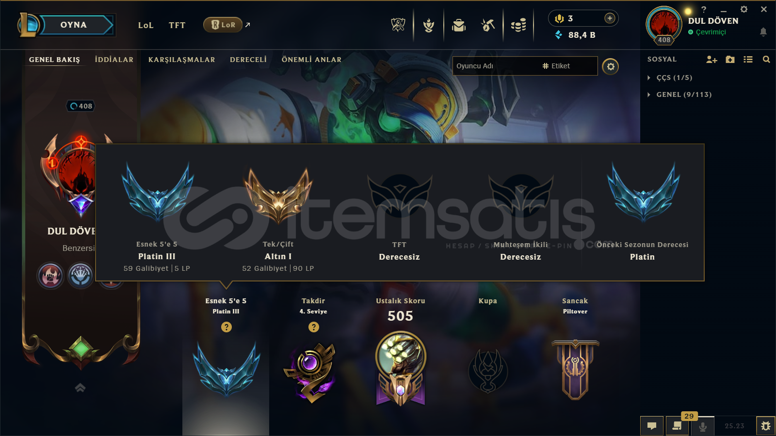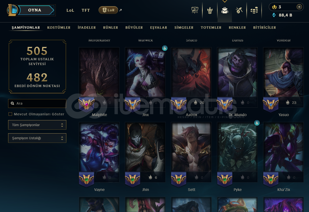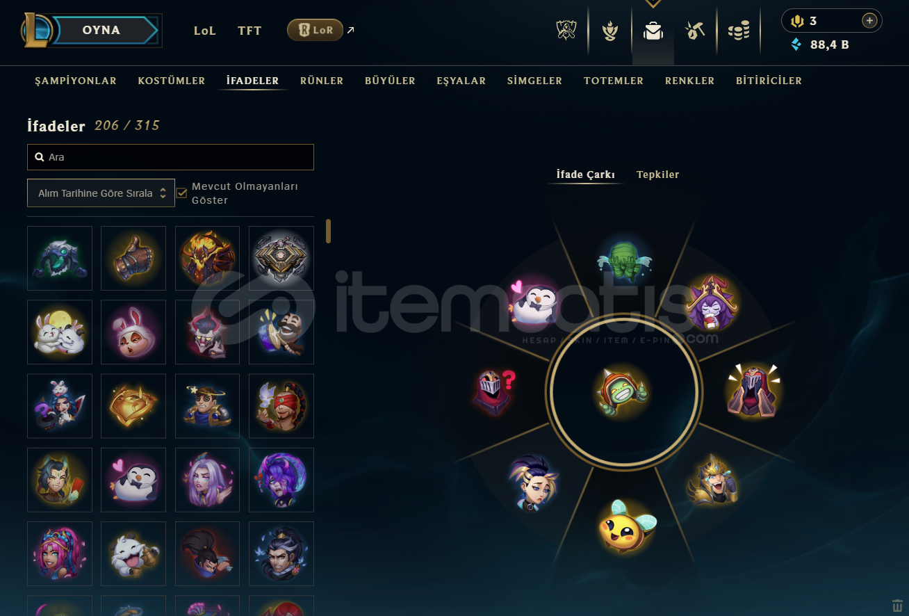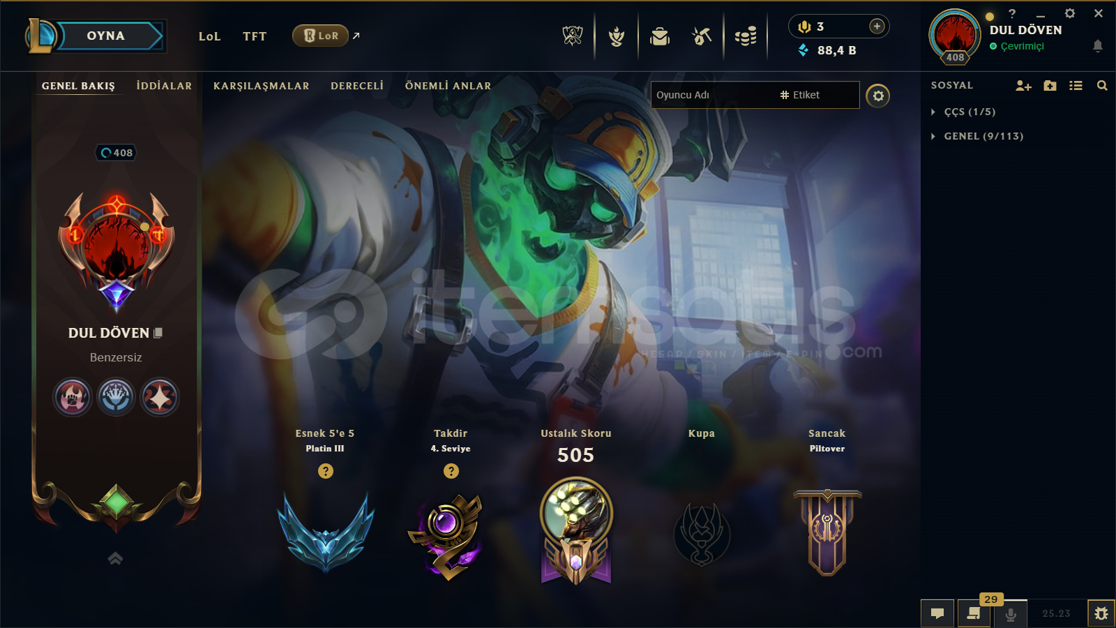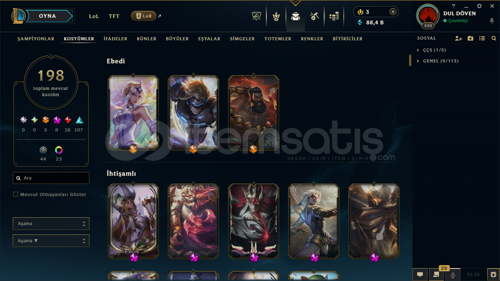 200 tane kostum,255 tane simge,43 totem,23 renk , 206 ifade var hesapta.Rankı: PlatHesap seviyesi: 408Mavi öz: 88,4kFiyat: 4500 TL