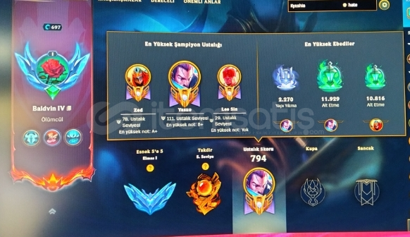 Acil paraya ihtiyaç olduğundan , Lol hesabım satılıktır.8-9 yıllık hesap1.3 milyon Yasuo puanı900K zed puanı 5-10 şampiyonda 200-300k arası geziyoSon 6-7 sezondur elmas Bu sezon master bitiriyo