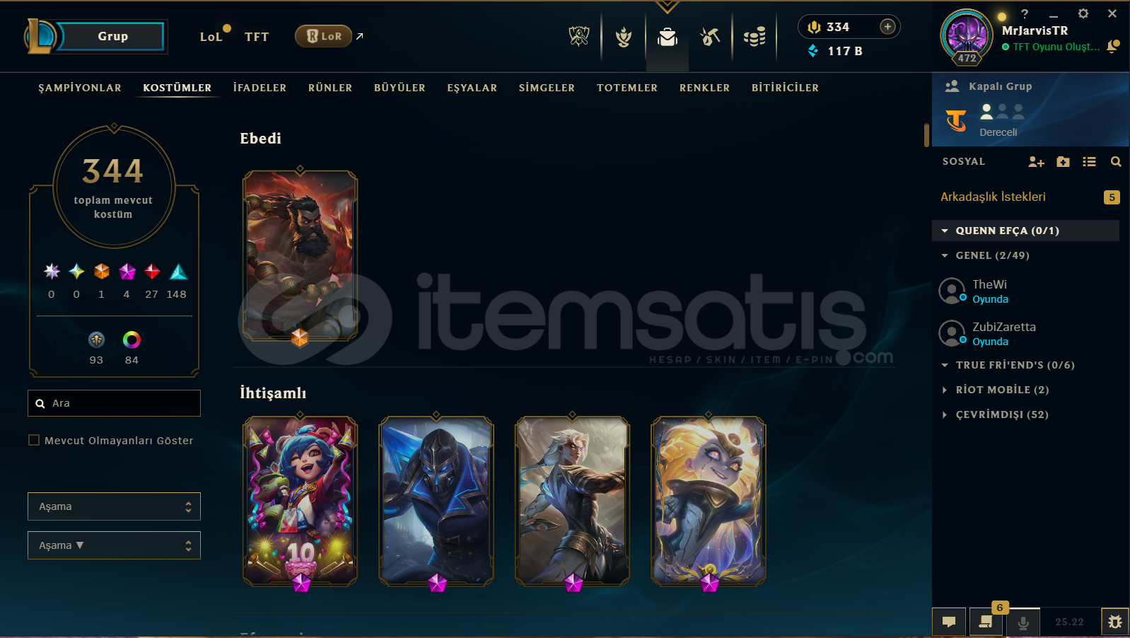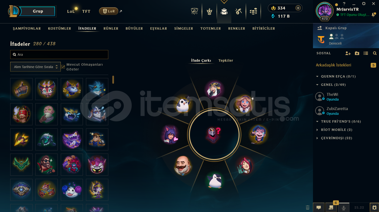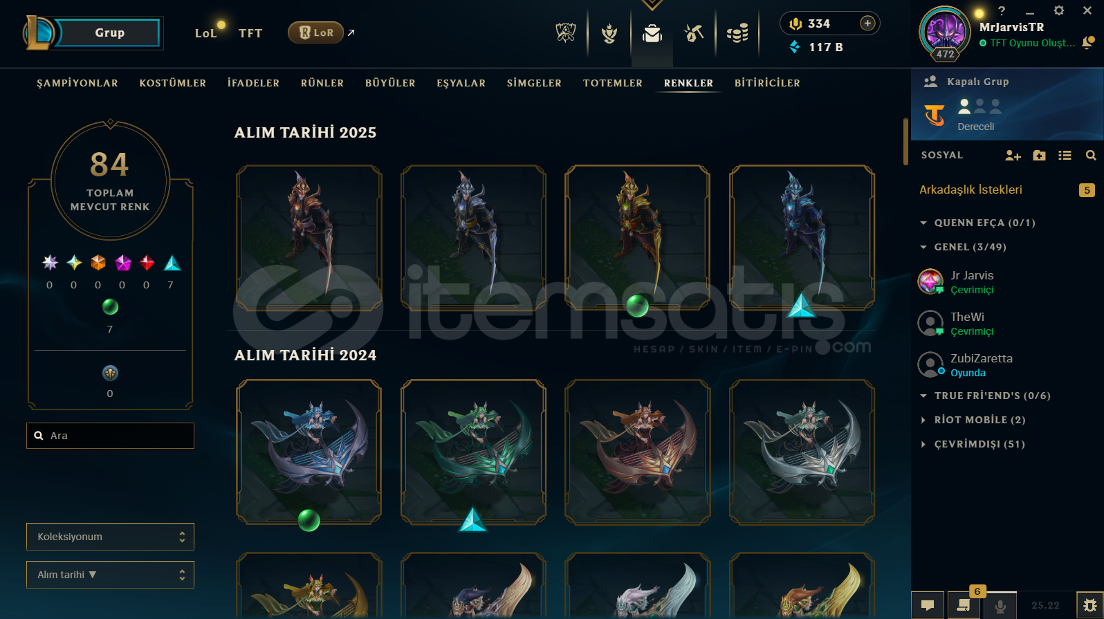 LoL + valo + tft skinleri mevcut sezon 3ten beri aktif hesap sıfır ban ve uyarı acil nakit ihtiyacından dolayı satmaya karar verdim pazarlık yapabiliriz duruma göre.LoL: Full şampiyonlar açık (475 level)Kostümler:344 adet kostüm (1 adet ruh bekçisi udyr,4 adet mor ihtişamlı kostüm,27 adet kırmızı efsanevi kostüm,148 adet mavi destansı kostüm,93 adet hatıra kostüm ve 84 adet...