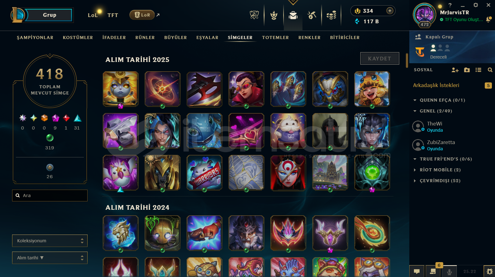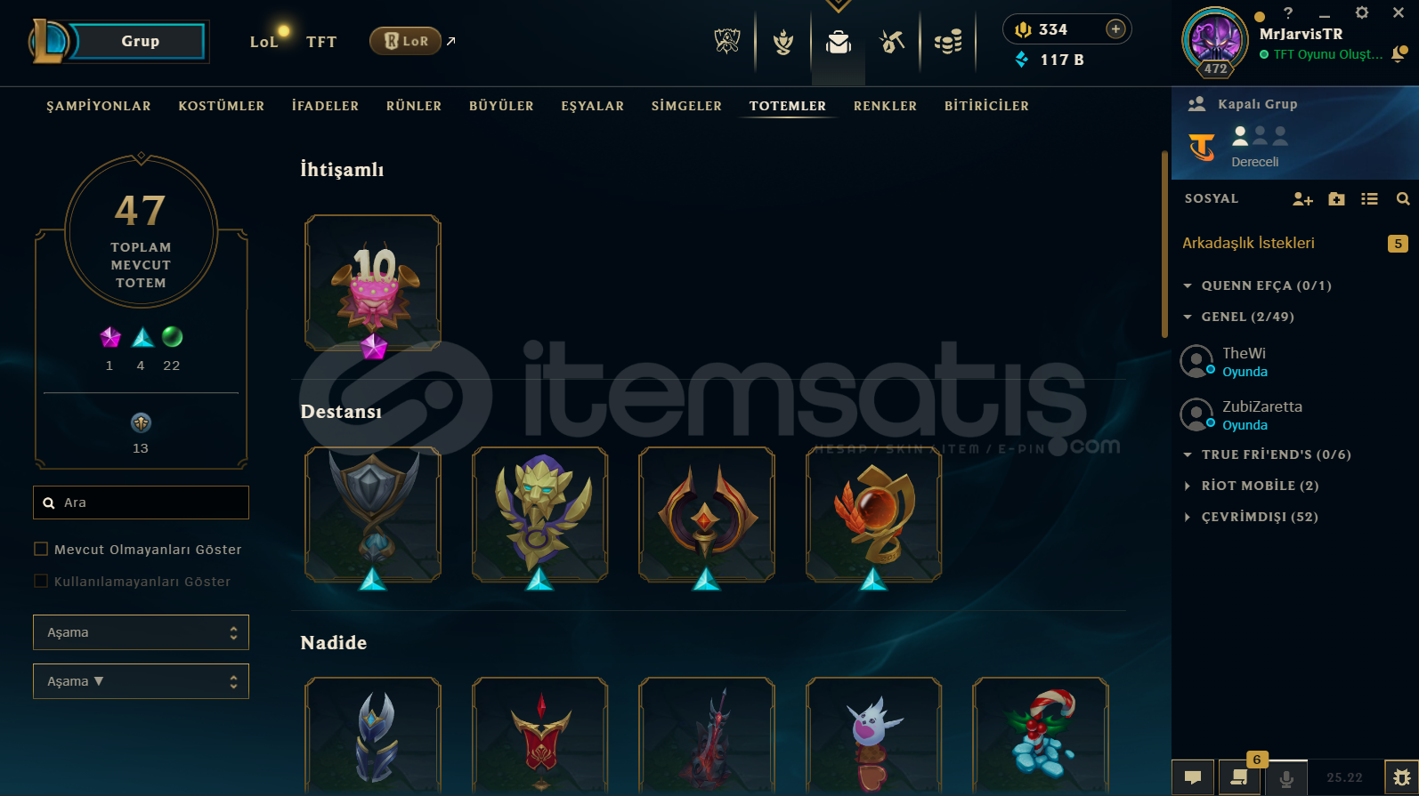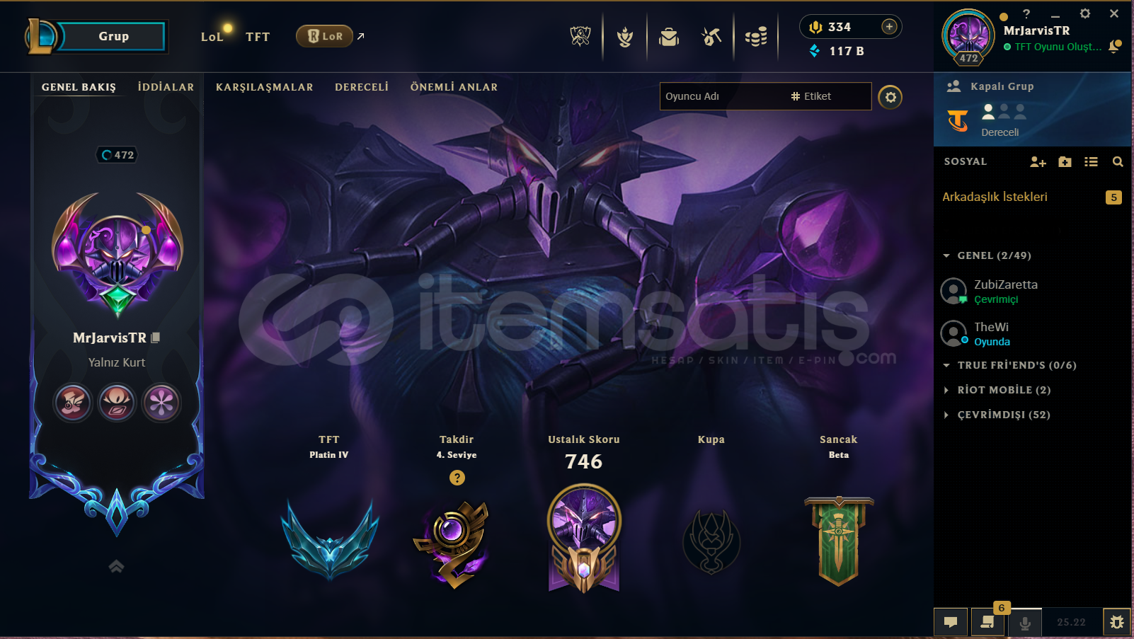 LoL + valo + tft skinleri mevcut sezon 3ten beri aktif hesap sıfır ban ve uyarı acil nakit ihtiyacından dolayı satmaya karar verdim pazarlık yapabiliriz duruma göre.LoL: Full şampiyonlar açık (475 level)Kostümler:344 adet kostüm (1 adet ruh bekçisi udyr,4 adet mor ihtişamlı kostüm,27 adet kırmızı efsanevi kostüm,148 adet mavi destansı kostüm,93 adet hatıra kostüm ve 84 adet...