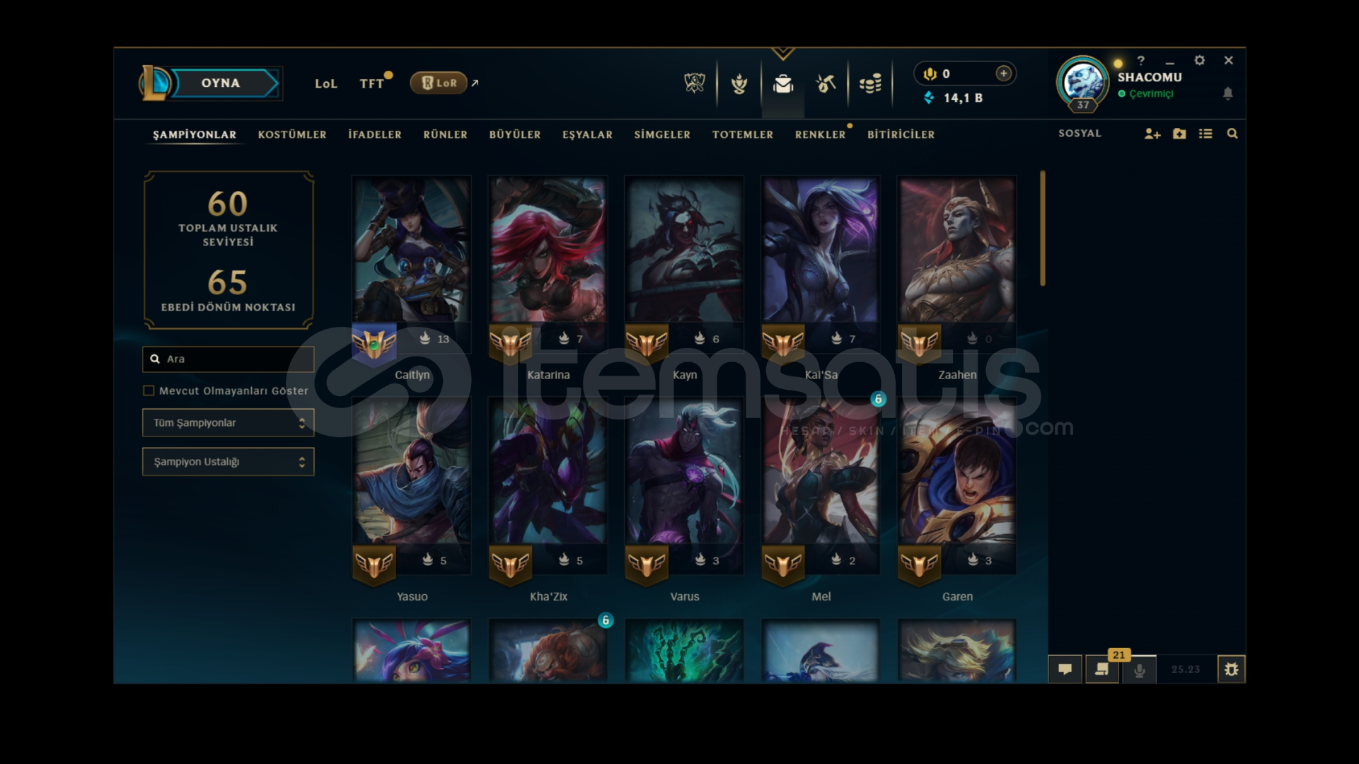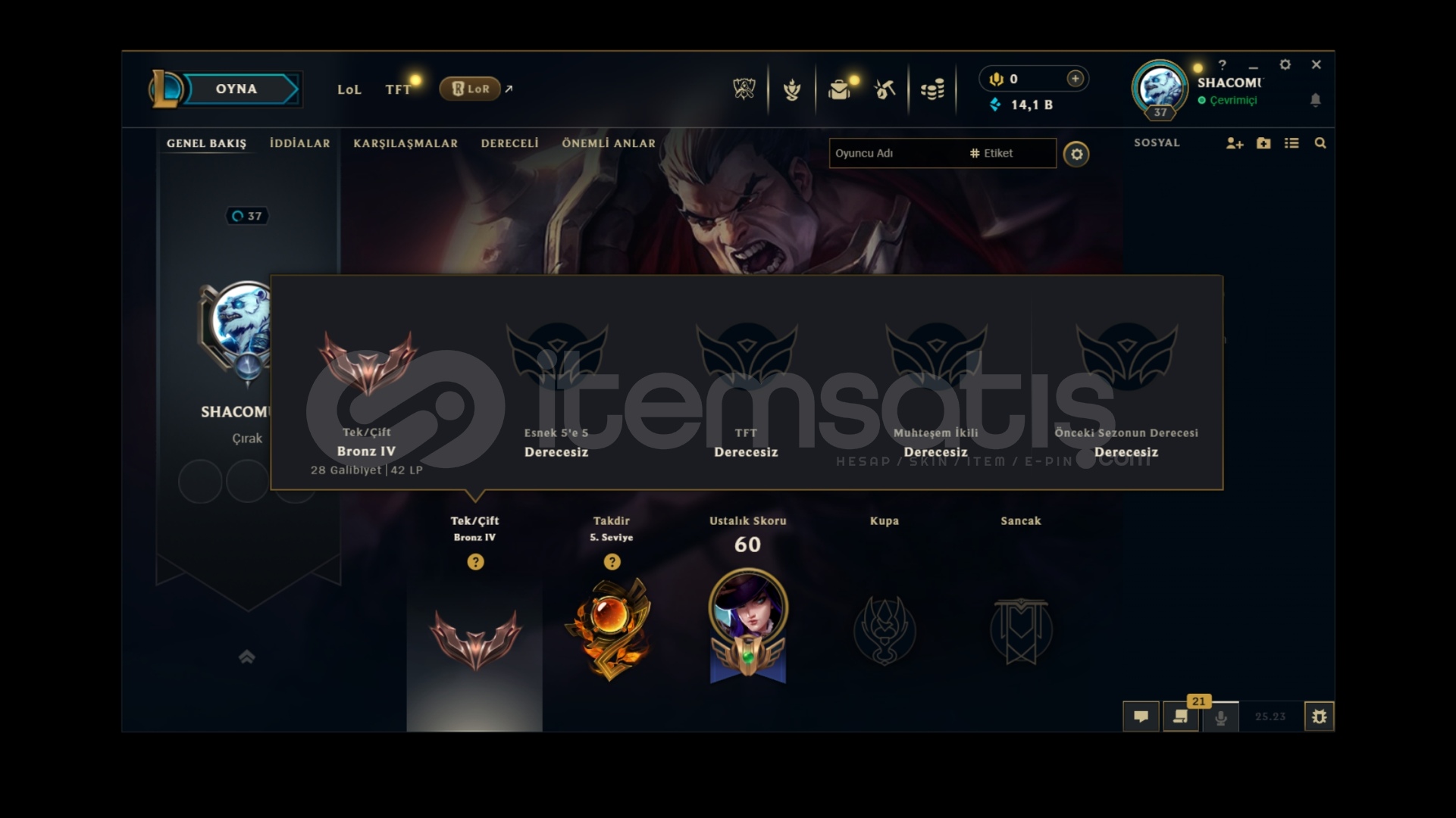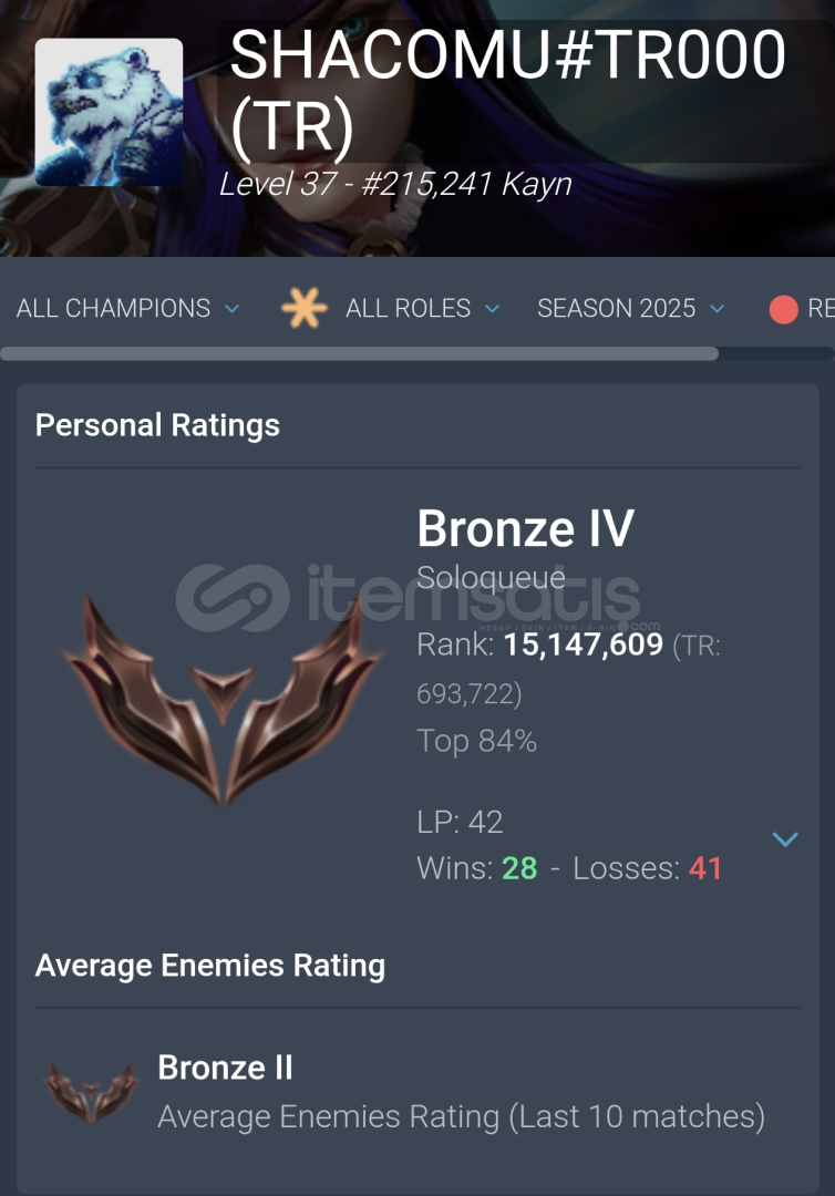 Hesap max bronz 3 gördü. Yüksek LP veriyor Smurf olarak kullanılabilir. Özellikle ADC mainlere tavsiyedir!- Aktif Bronz 4- 6 Tane açılmış 6 tanede açılmamış kostüm var- 6. Ustalık seviyesi caitlyn mevcut- 30 Dan fazla şampiyon açık!