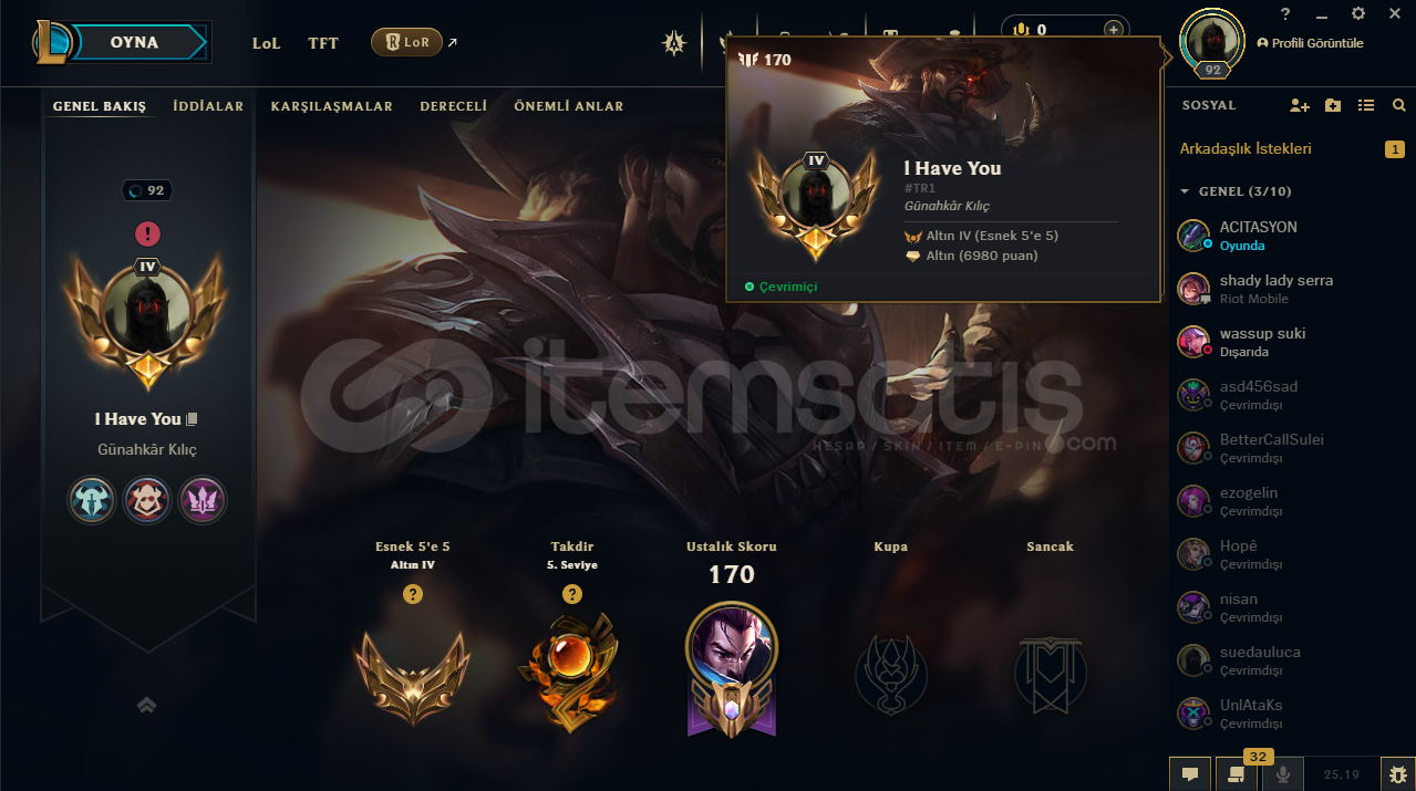 ⭐ALTIN RANK 20 SKIN⭐ TR 10K+ M. ÖZ 92 LVL