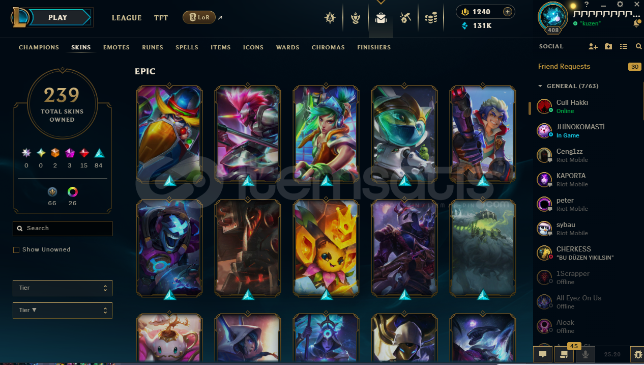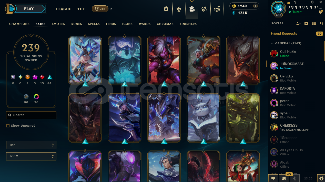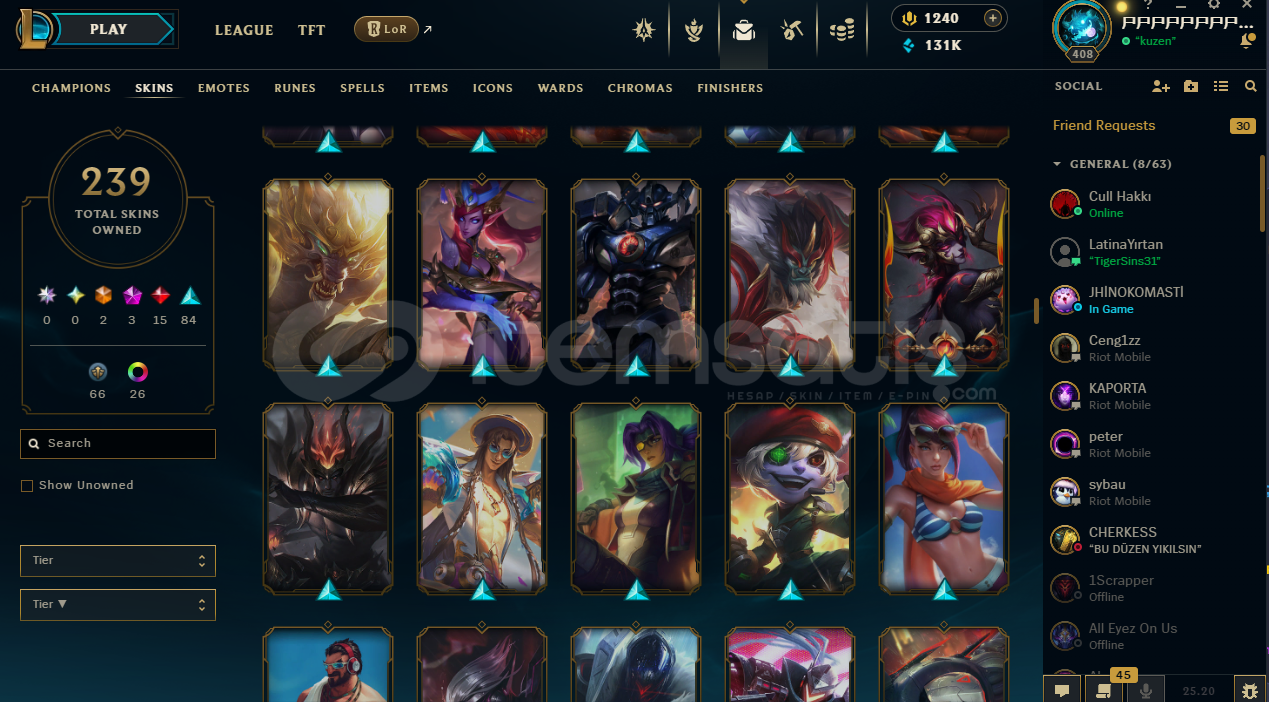 Hesabın İçerisinde: 1240 RP ve 131K Mavi Öz bulunmaktadır.Hesabın Rankı Tek/Çift Zümrüt 1 --- Esnek Rankı Zümrüt 4'türBütün karakterler açıktır.326/159 emojiler açıktır.285 tane ikon açıktır.30 tane totem görünümü açıktır.32 tane kroma açıktır.Hesaptaki skinler :Pulsefire Ezreal (Ultimate Skin)DJ Sona (Ultimat...